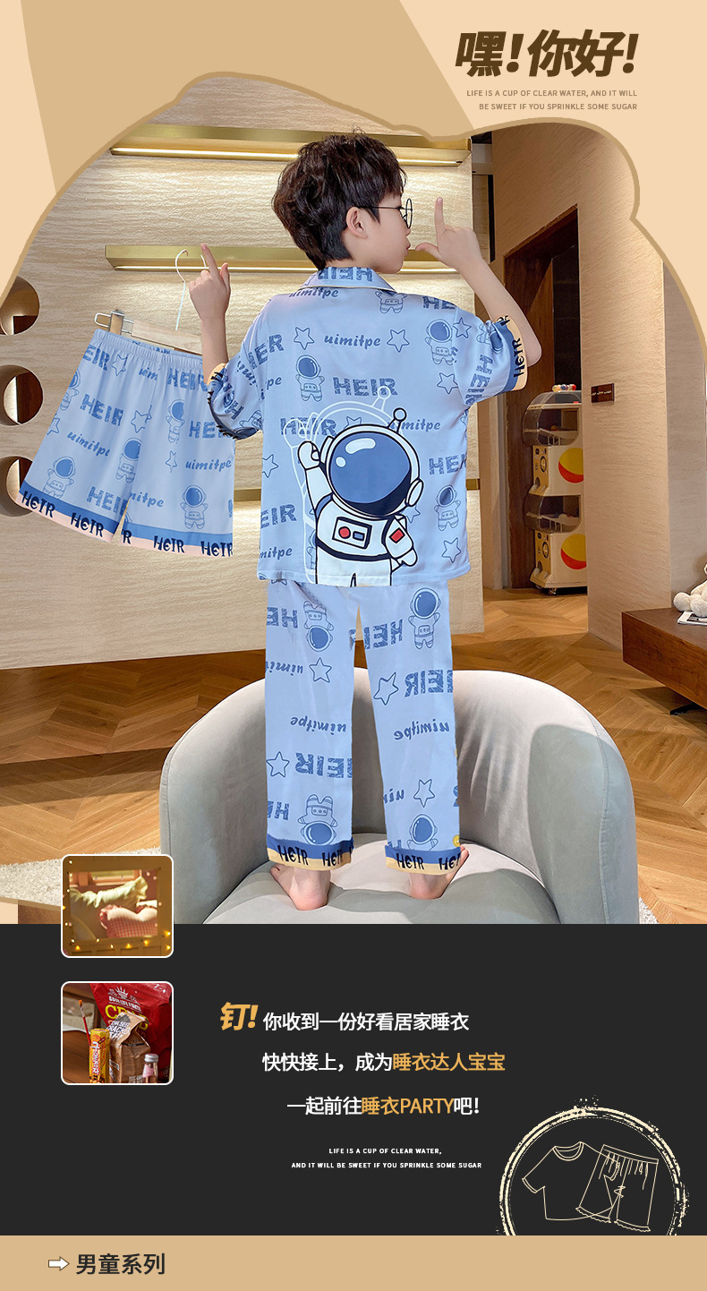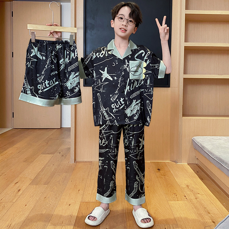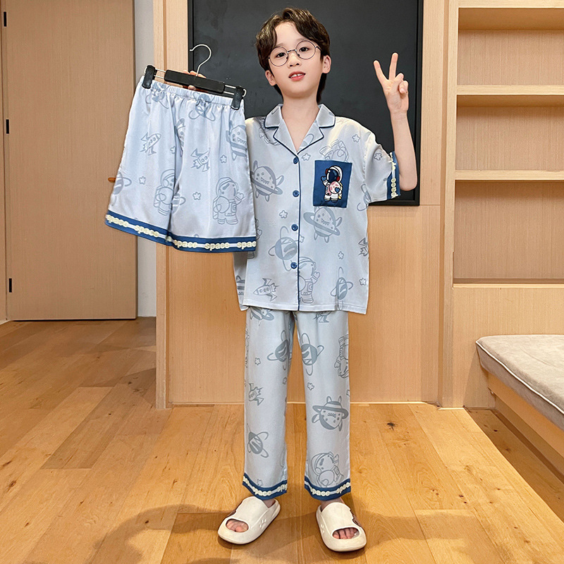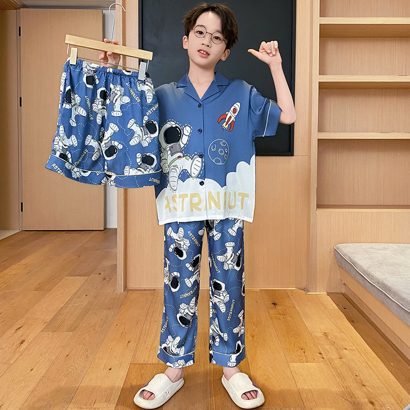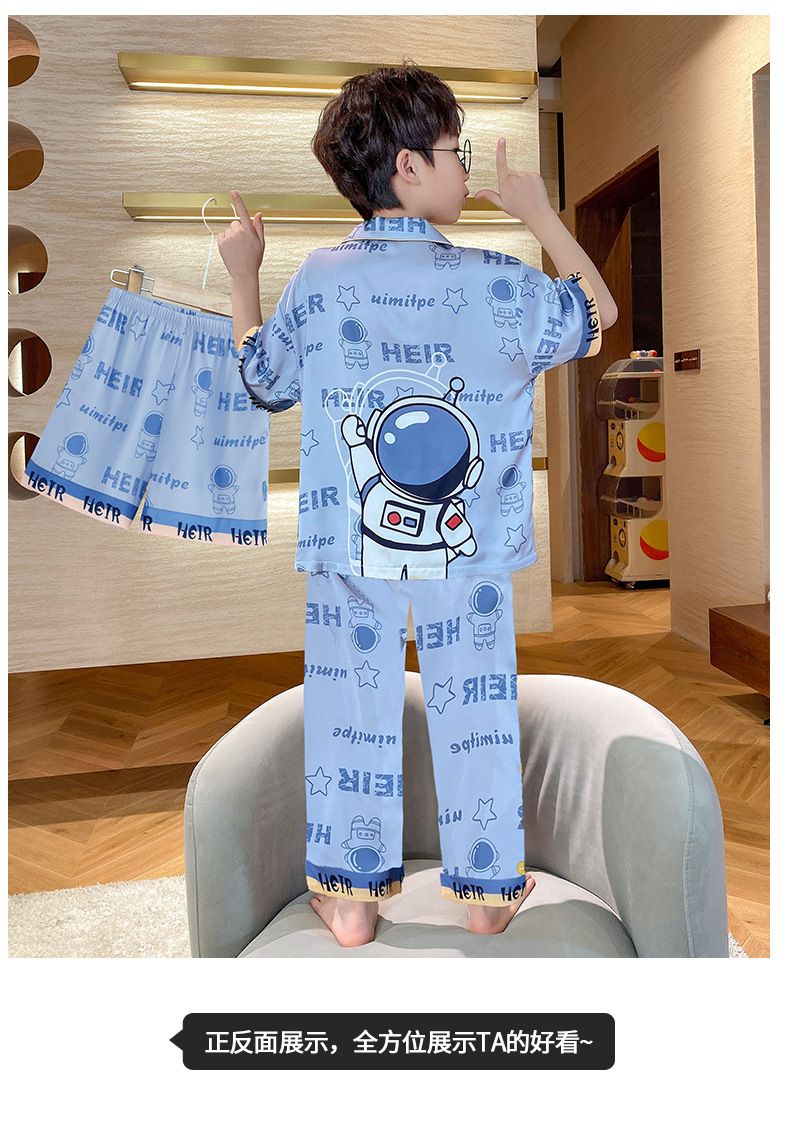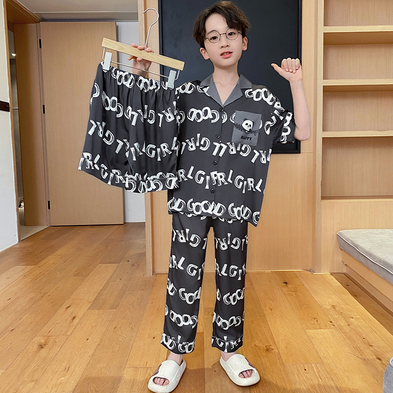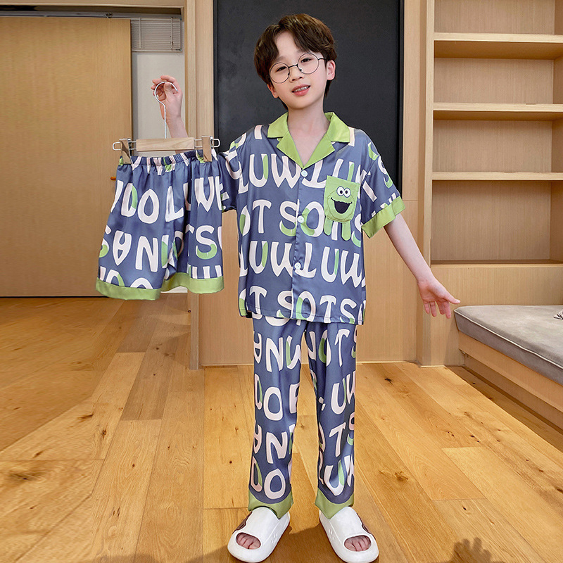 2025 여름 신작 아동 잠옷 소년 3 피스 세트 얼음과 얼음 실크 시원한 반팔 아동 소년 겉옷 가정 의류스토어 가기