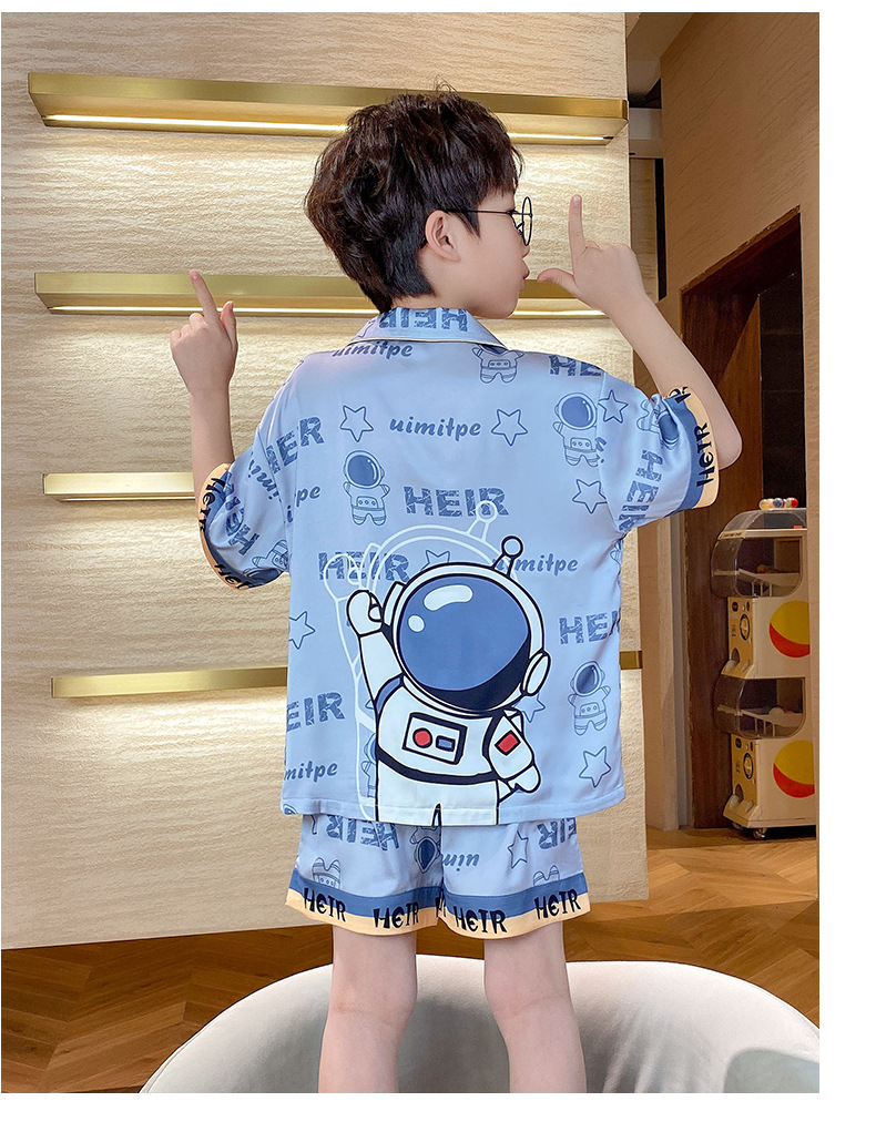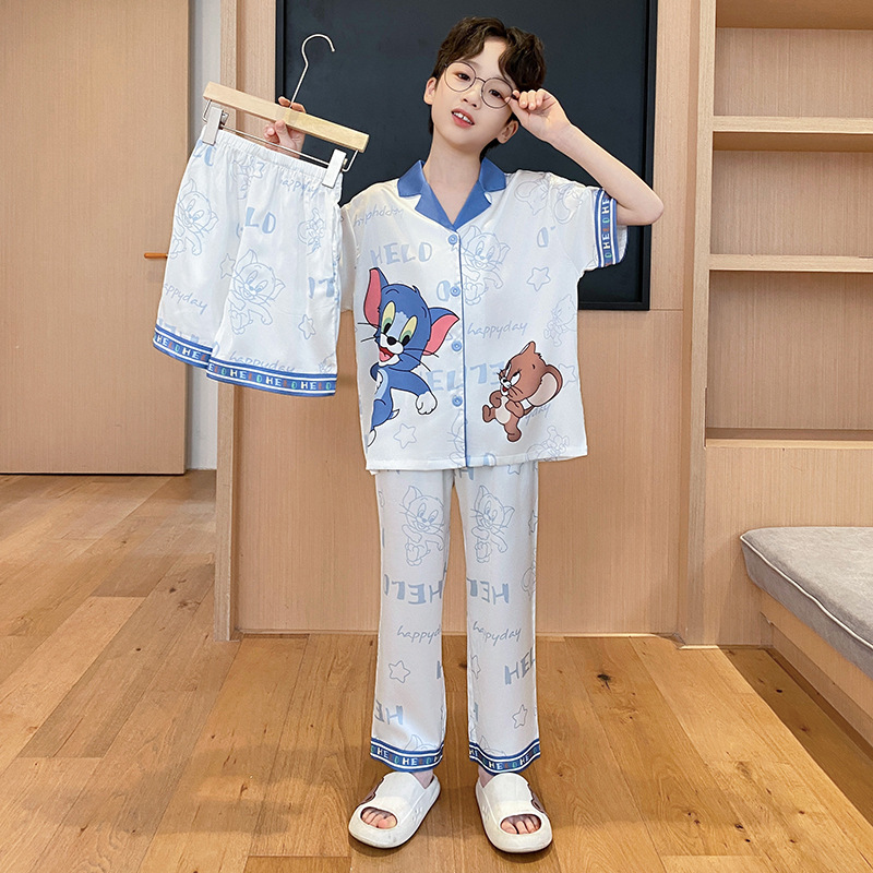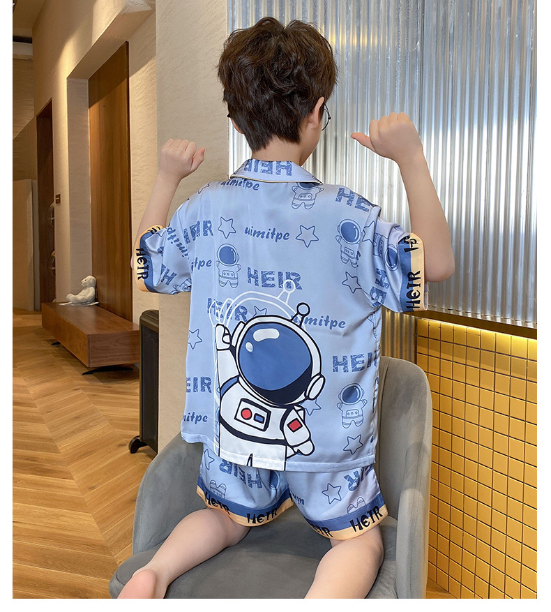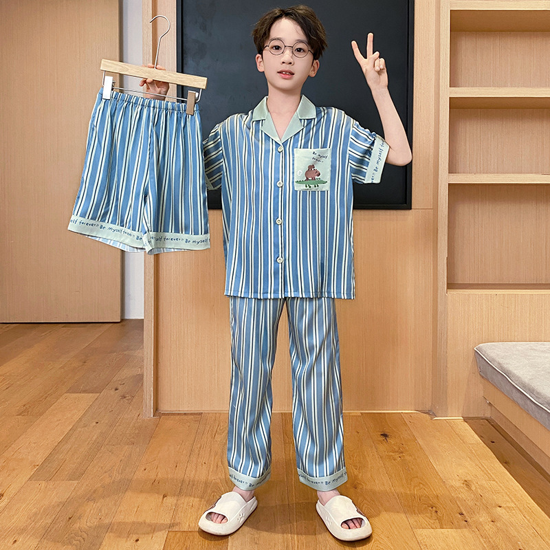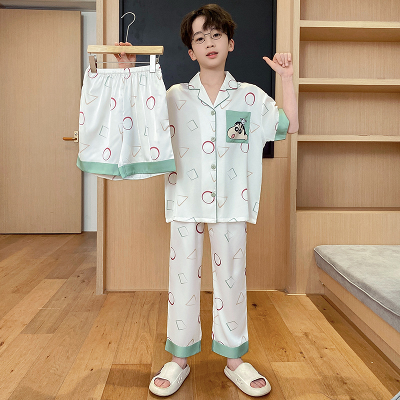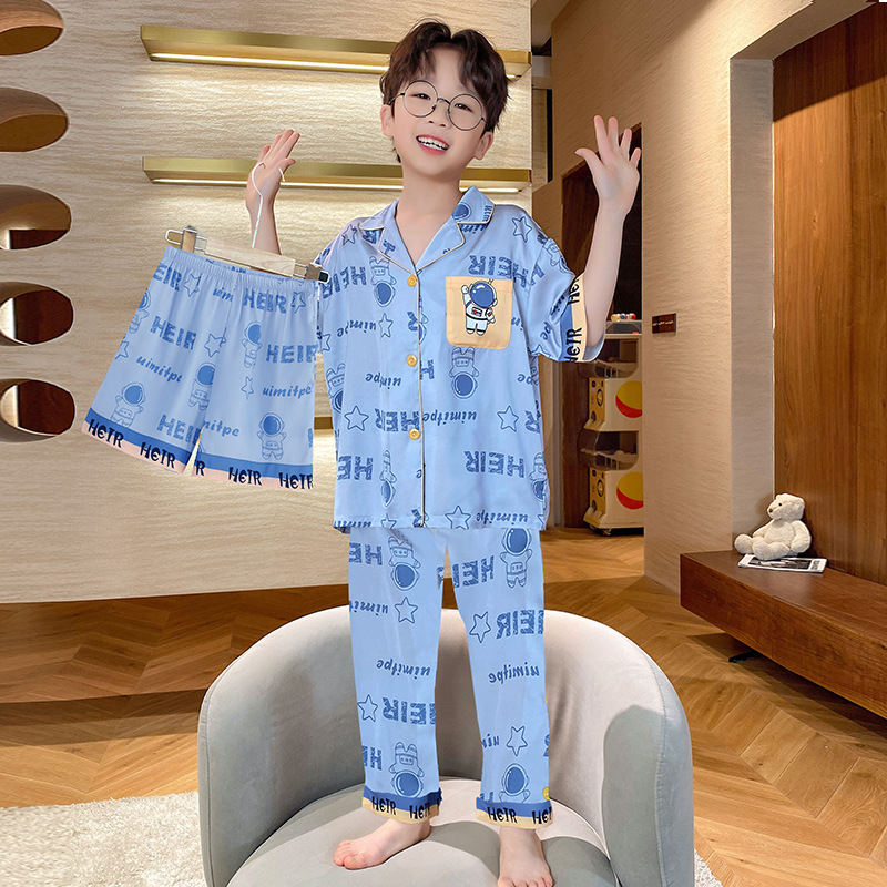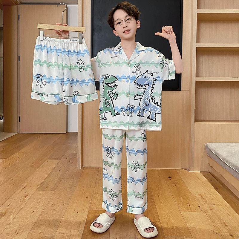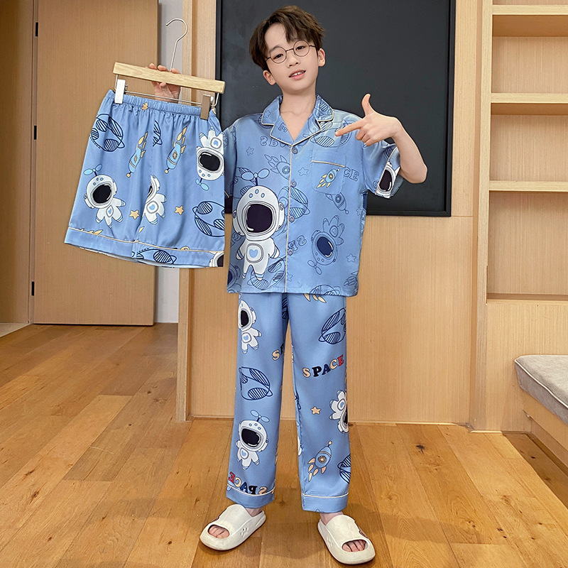 2025 여름 신작 아동 잠옷 소년 3 피스 세트 얼음과 얼음 실크 시원한 반팔 아동 소년 겉옷 가정 의류스토어 가기