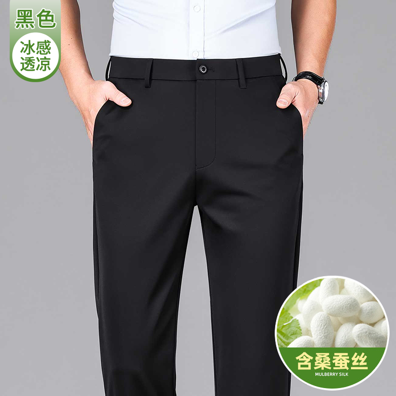 남성 비즈니스 바지 2025 여름 중년 얼음 실크 얇은 뽕나무 실크 캐주얼 바지 스트레치 비즈니스 스트레이트 바지