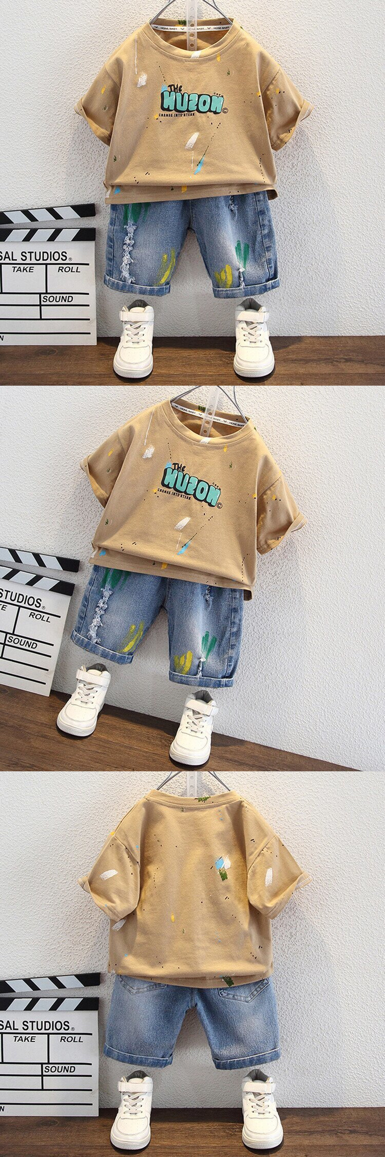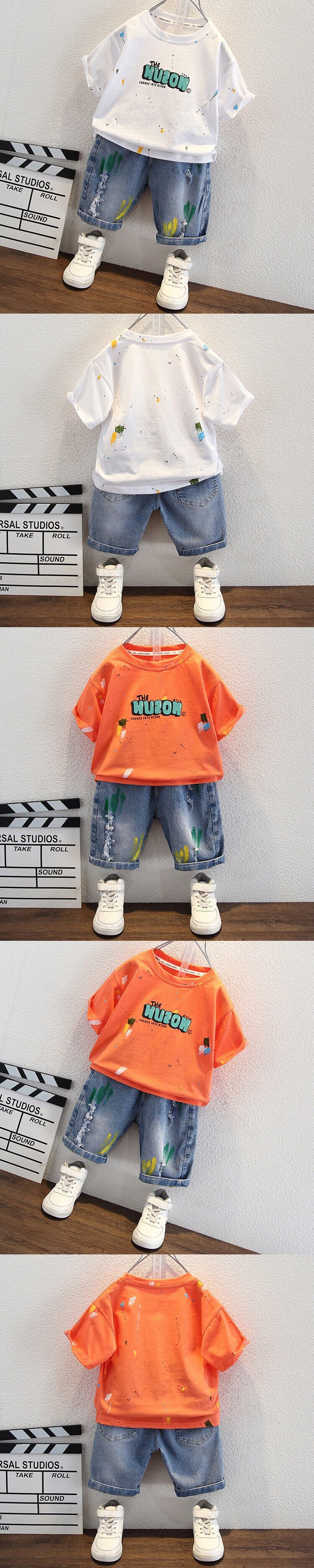 남아용 반팔 양복, 아동용 데님 스타일, 새로운 반팔, 중소형 베이비 여름 티셔츠, 멋진 투피스 세트스토어 가기