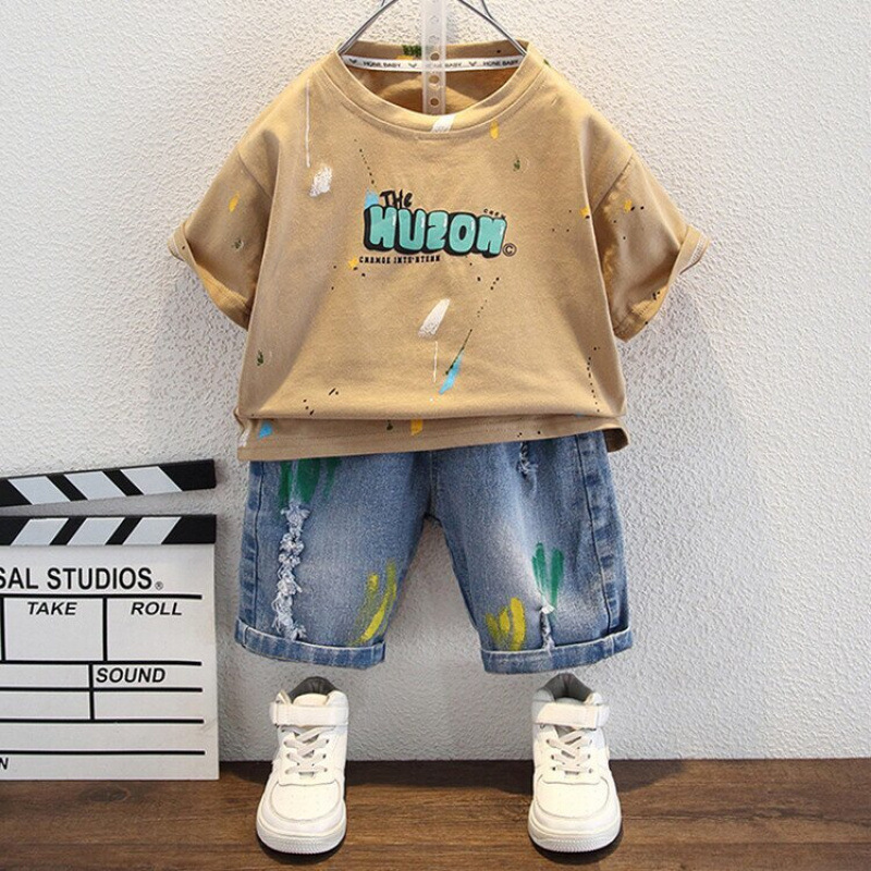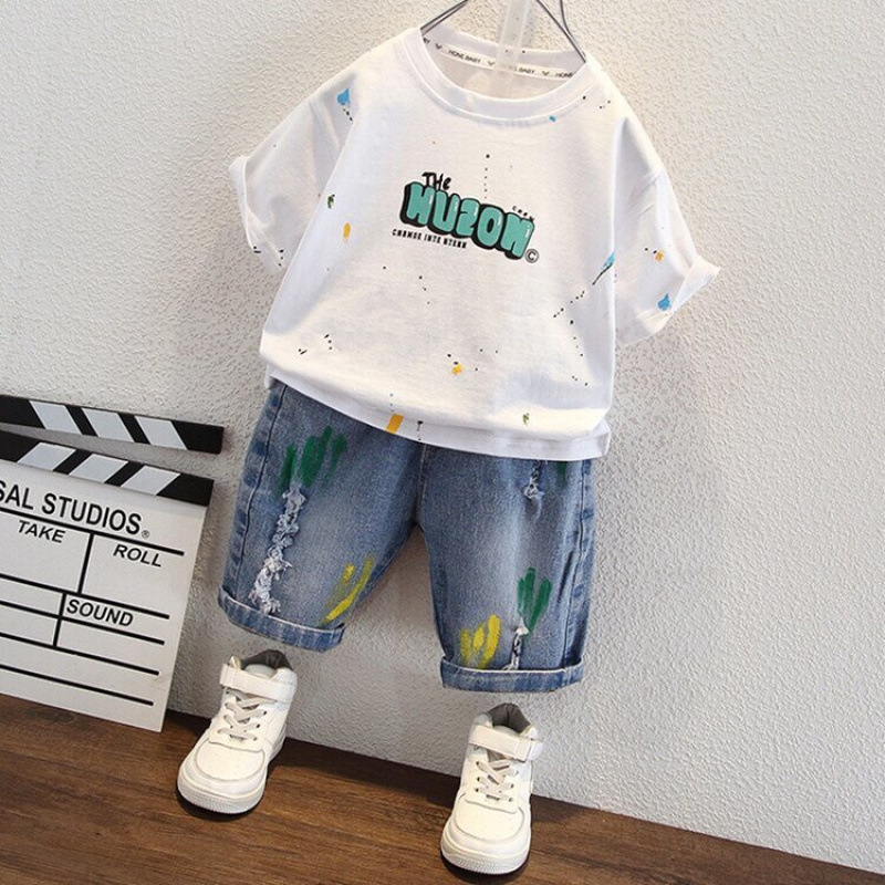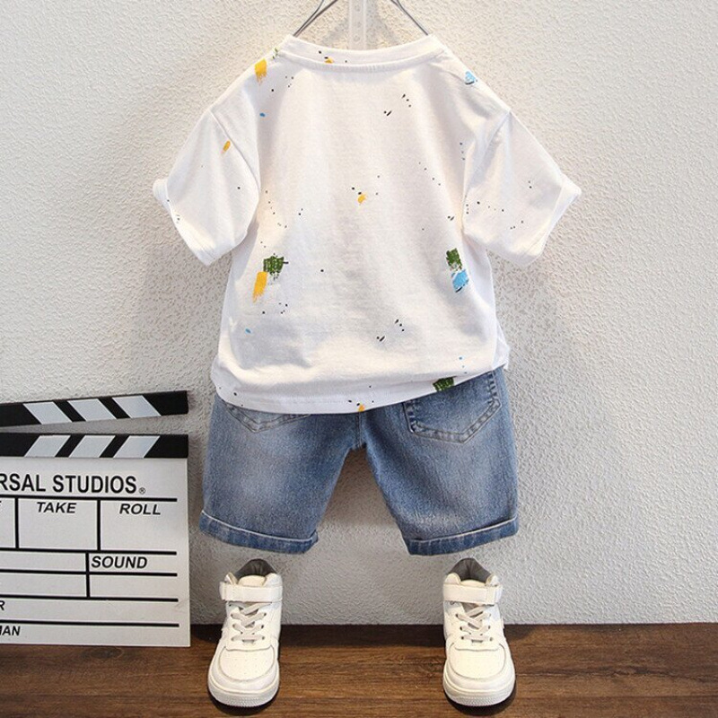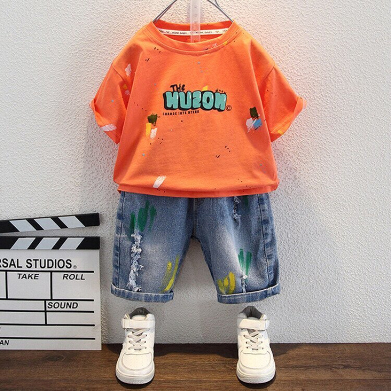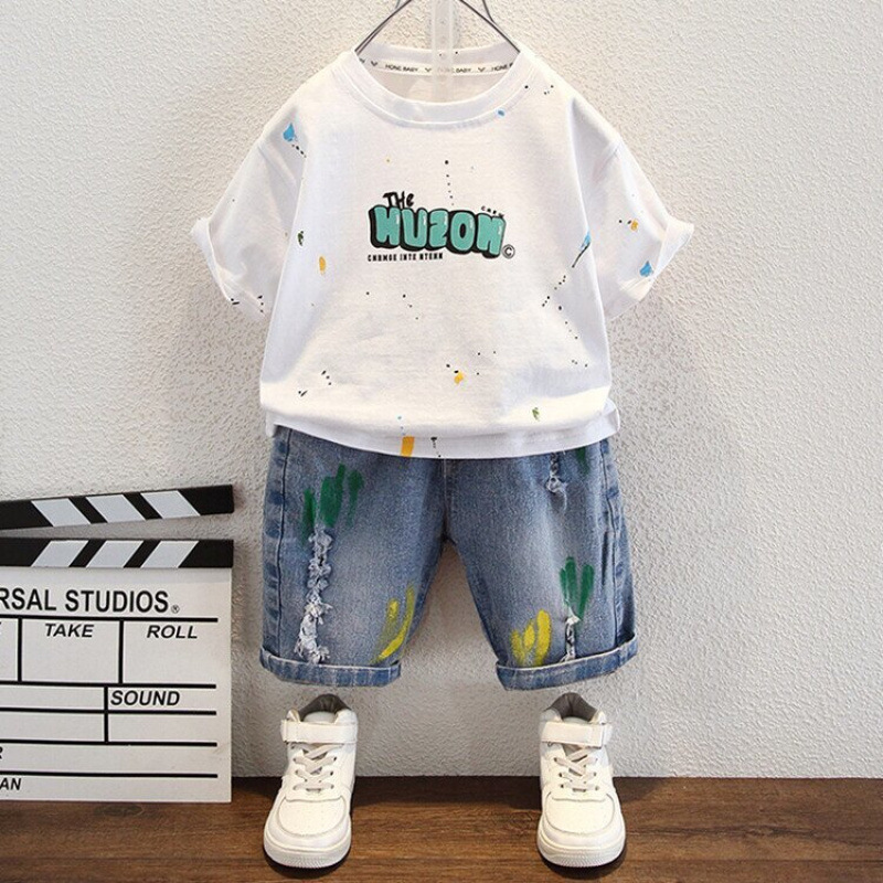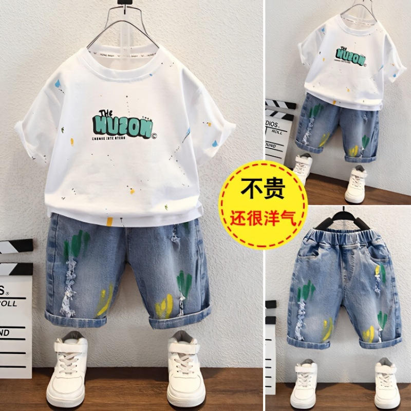 남아용 반팔 양복, 아동용 데님 스타일, 새로운 반팔, 중소형 베이비 여름 티셔츠, 멋진 투피스 세트