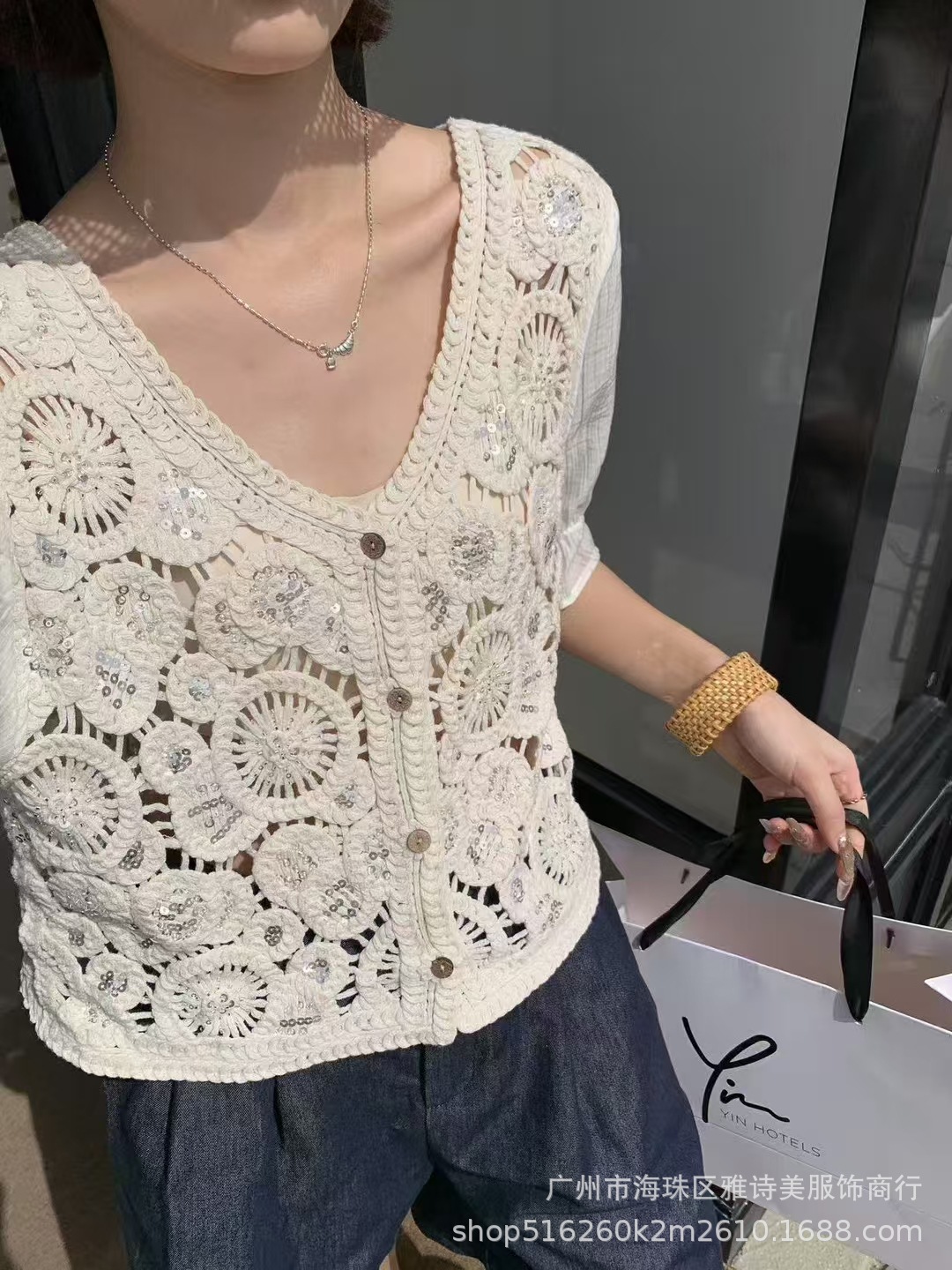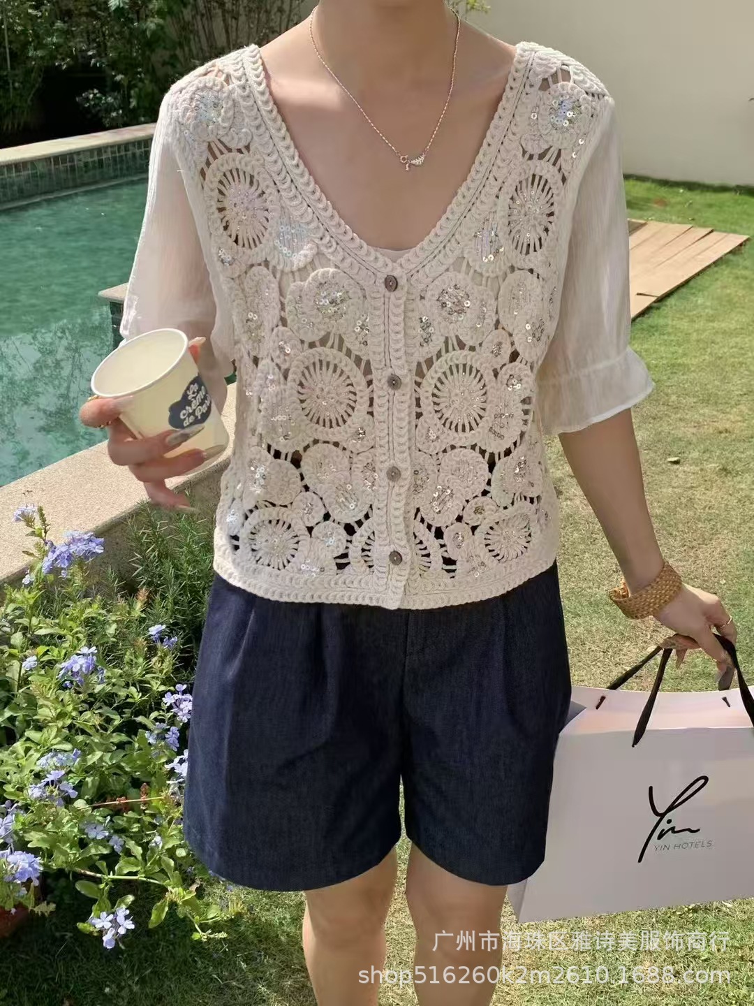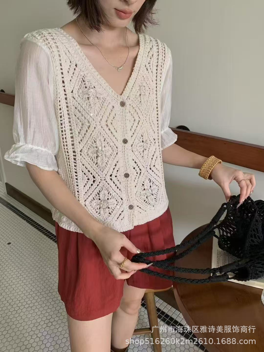프랑스 중공업 빈티지 빈 구슬 세판 쉬폰 셔츠 여성의 새로운 스타일 샤넬 루즈 버블 슬리브 카디건 탑