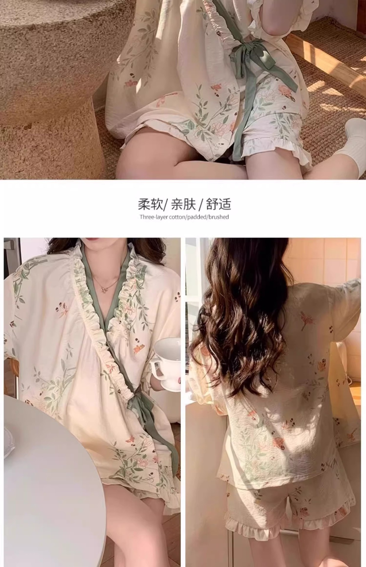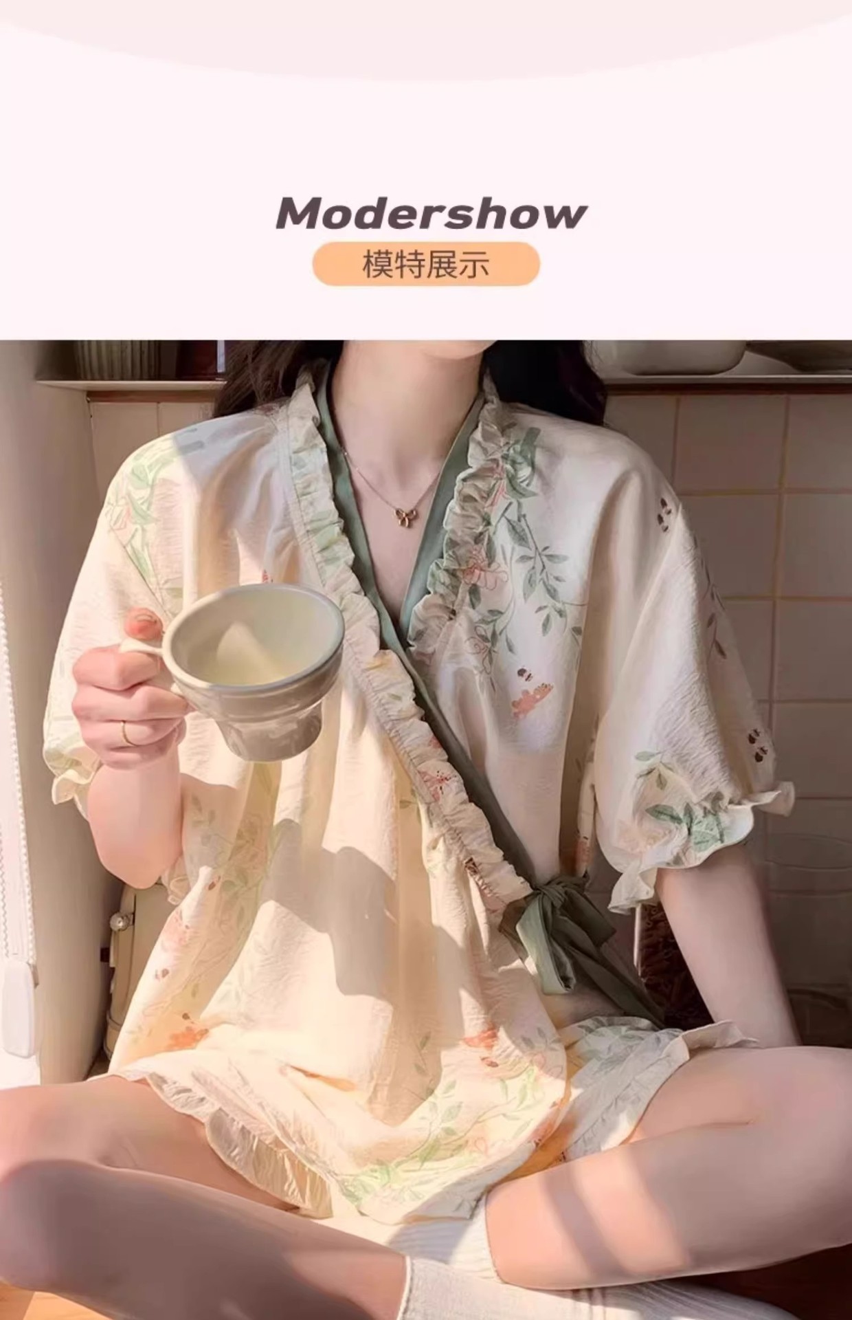국경 간 새로운 도착 파자마 여성 여름 복고풍 국가 스타일 반팔 반바지 느슨한 플러스 사이즈 달콤한 간단한 홈 의류 세트스토어 가기