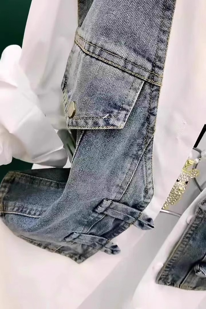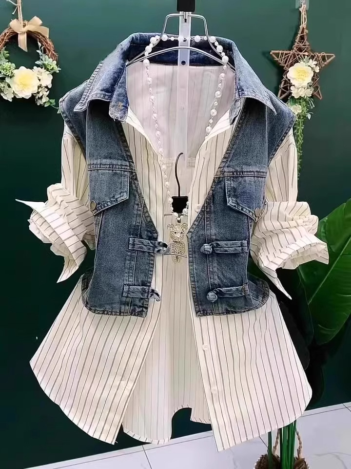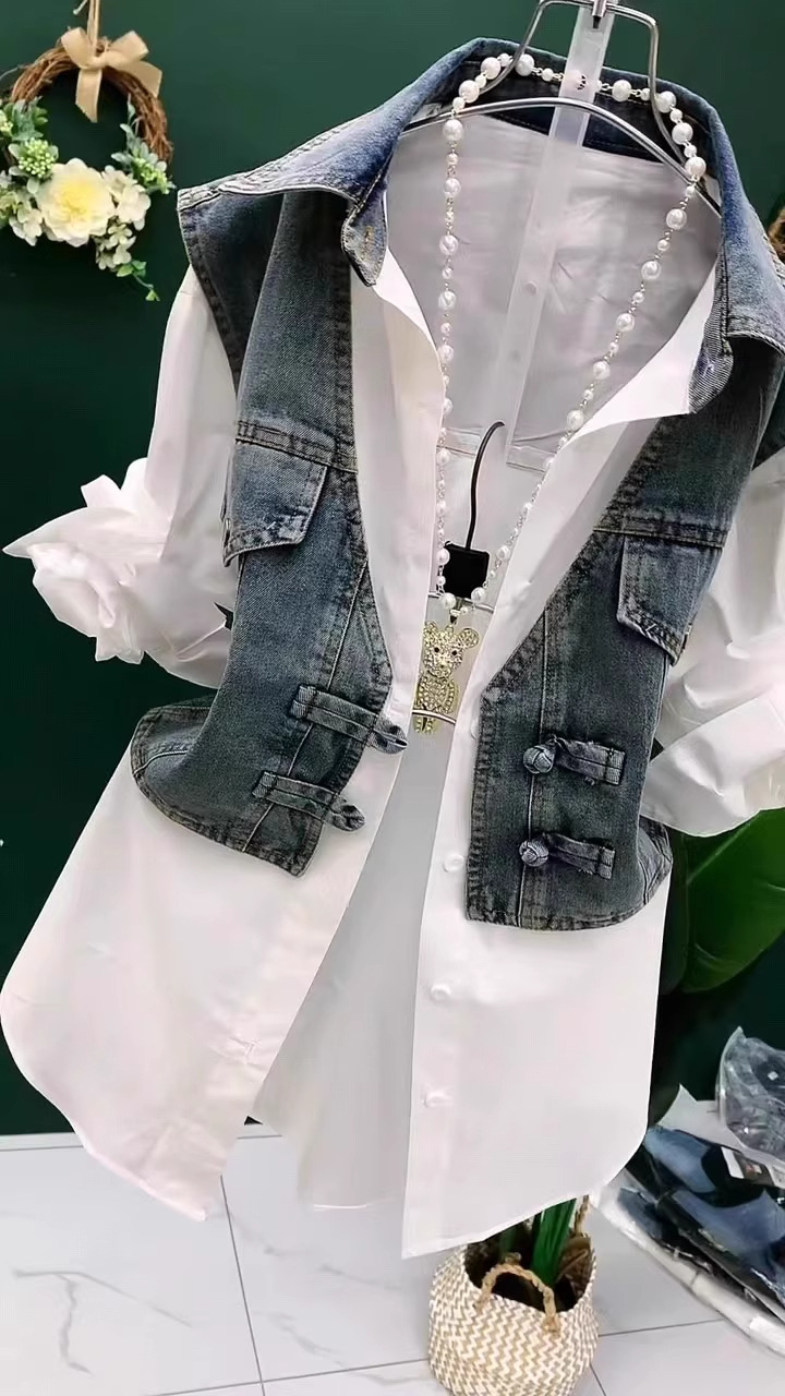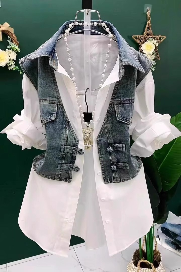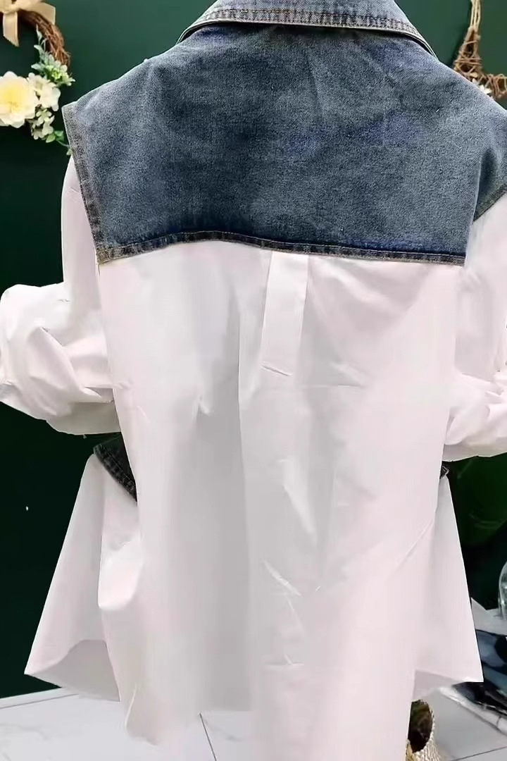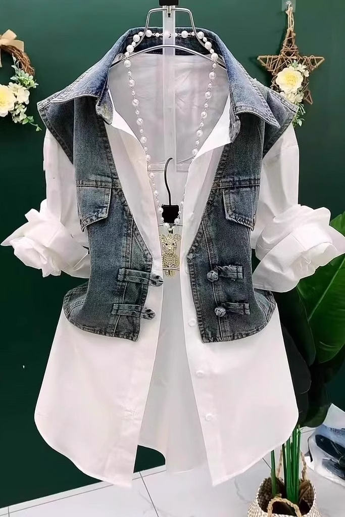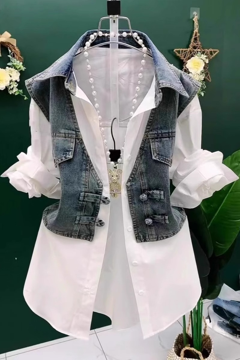 데님 조끼 스플 라이스 셔츠 가짜 투피스 여성 패션 폴로 칼라 버튼 셔츠 여름 스타일 버튼 셔츠스토어 가기