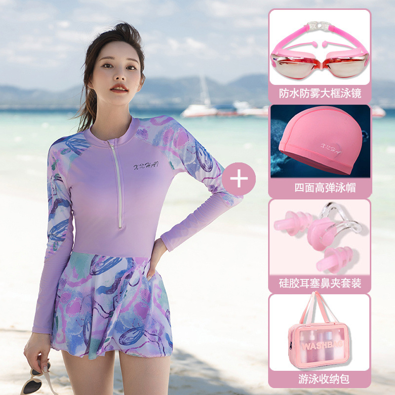 여성용 신상 수영복, 원피스 스커트 스타일, 배 커버 긴팔, 자외선 차단, 보수적, 슬리밍, 배 커버, 여름 패션 수영복