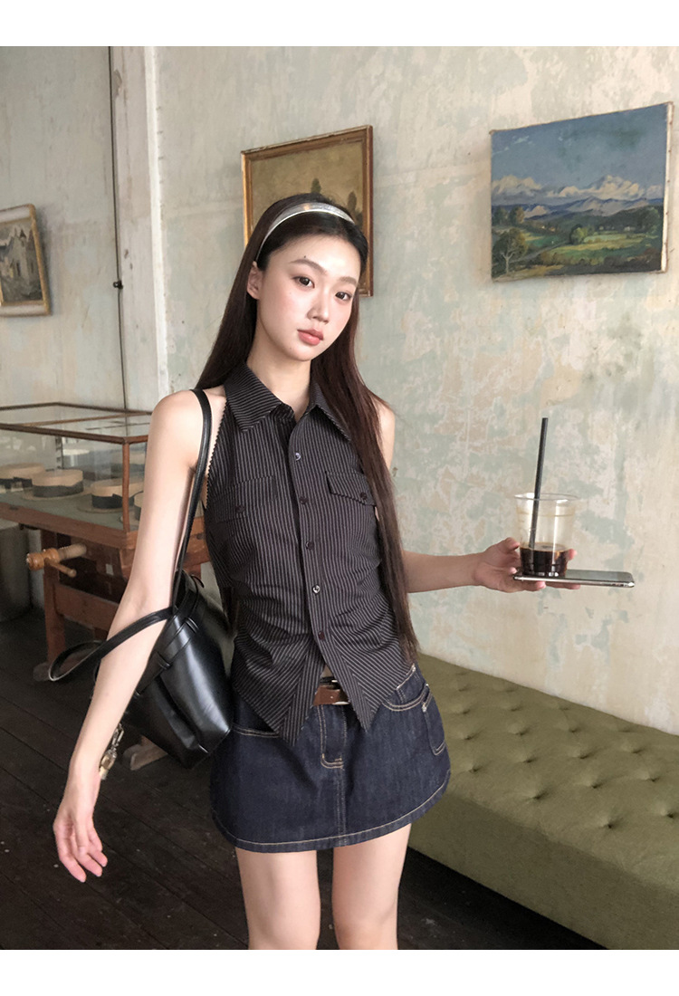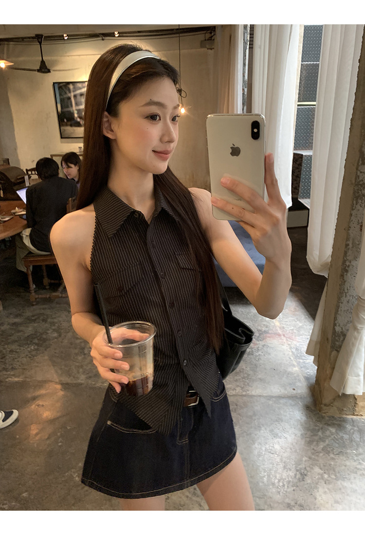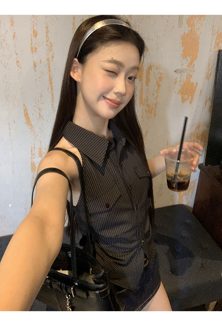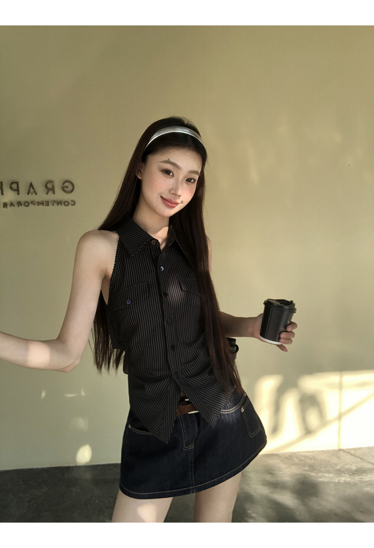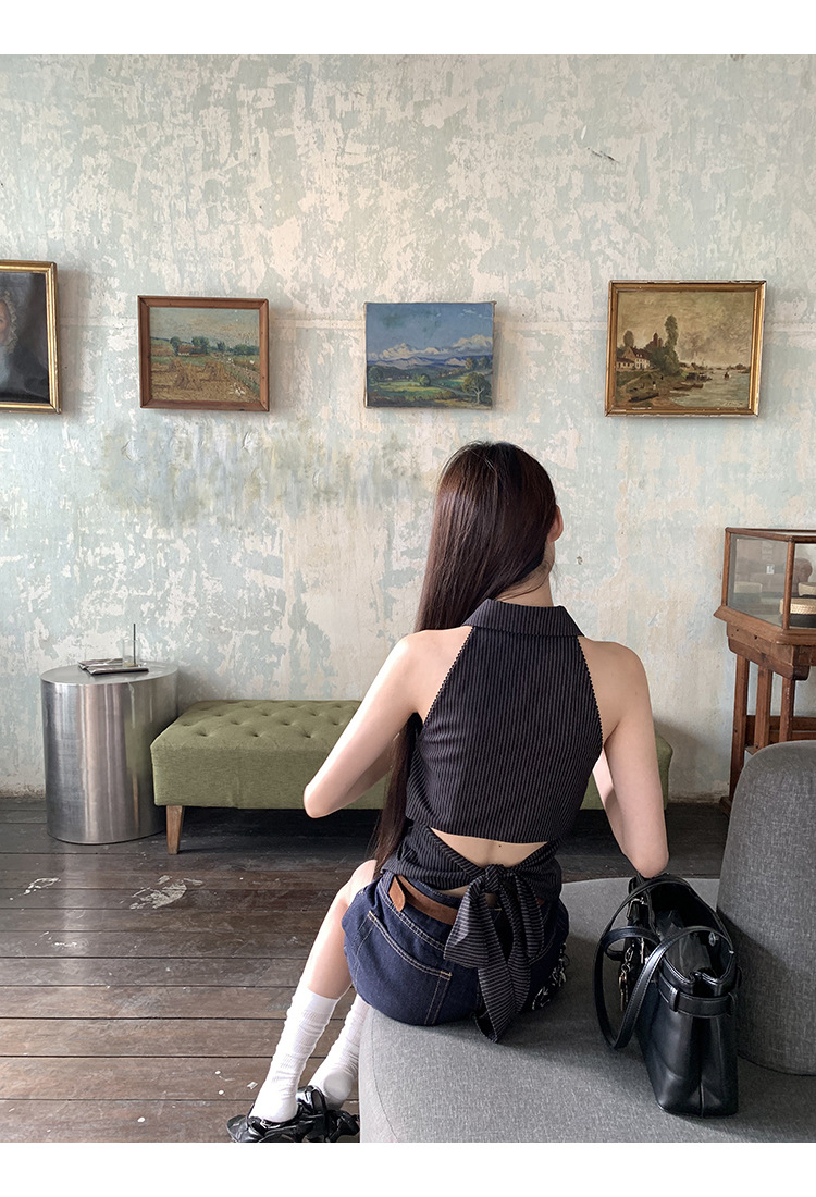 스트라이프 셔츠 여성의 2025 새로운 스타일 프랑스 탑 아름다운 등이없는 허리 검은 민소매 셔츠스토어 가기