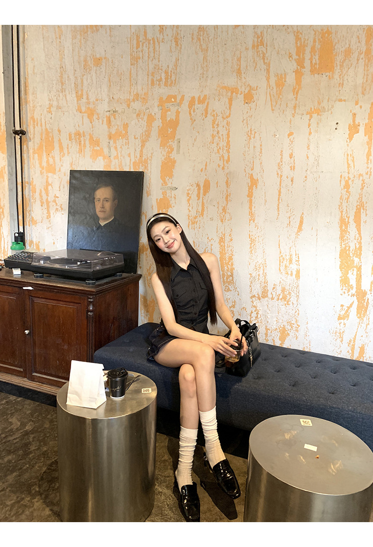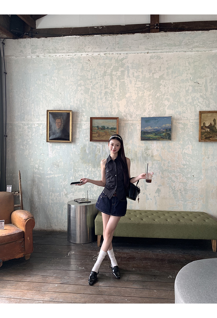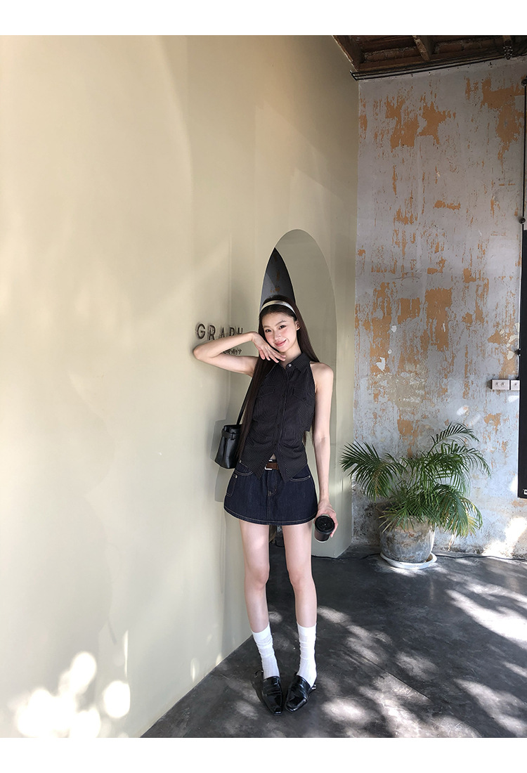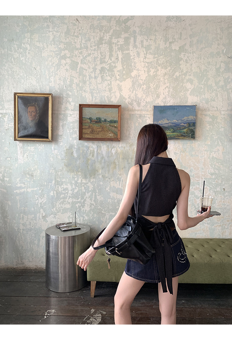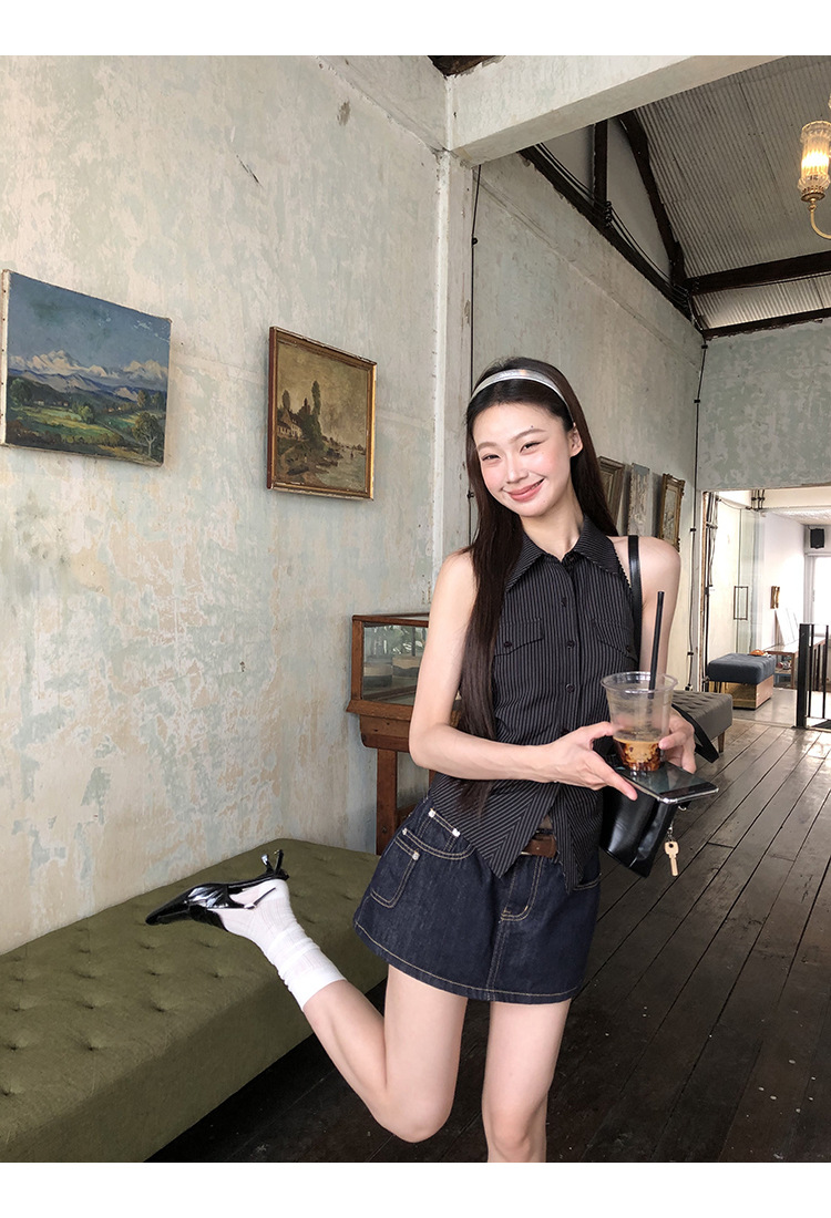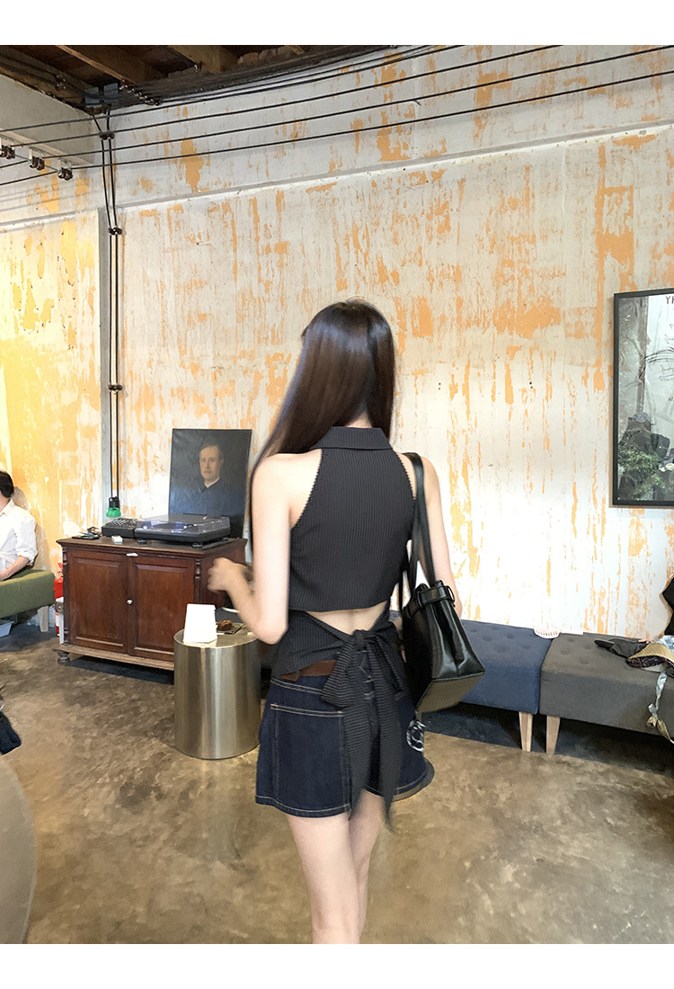 스트라이프 셔츠 여성의 2025 새로운 스타일 프랑스 탑 아름다운 등이없는 허리 검은 민소매 셔츠스토어 가기