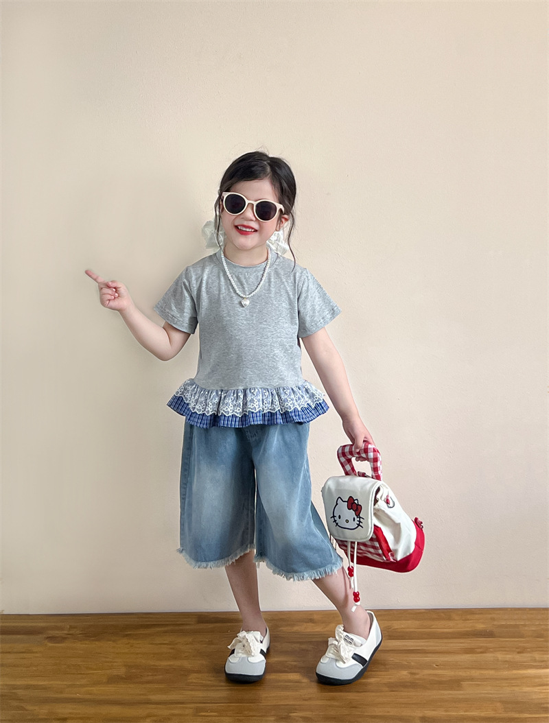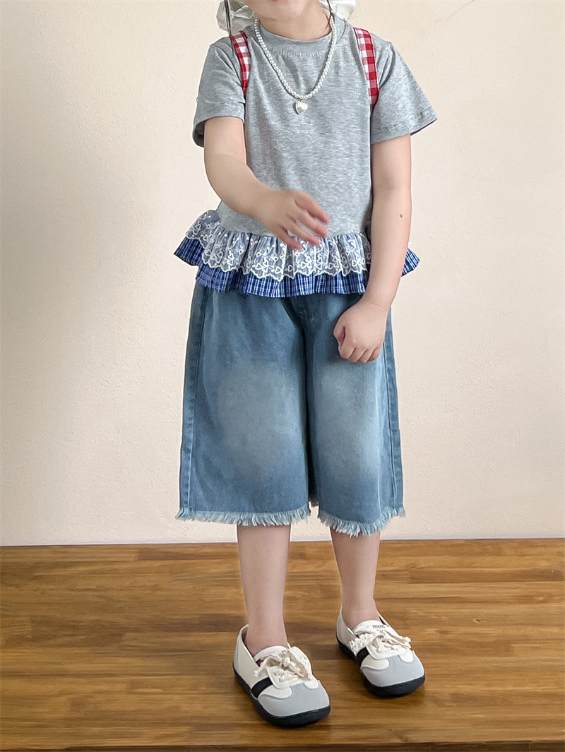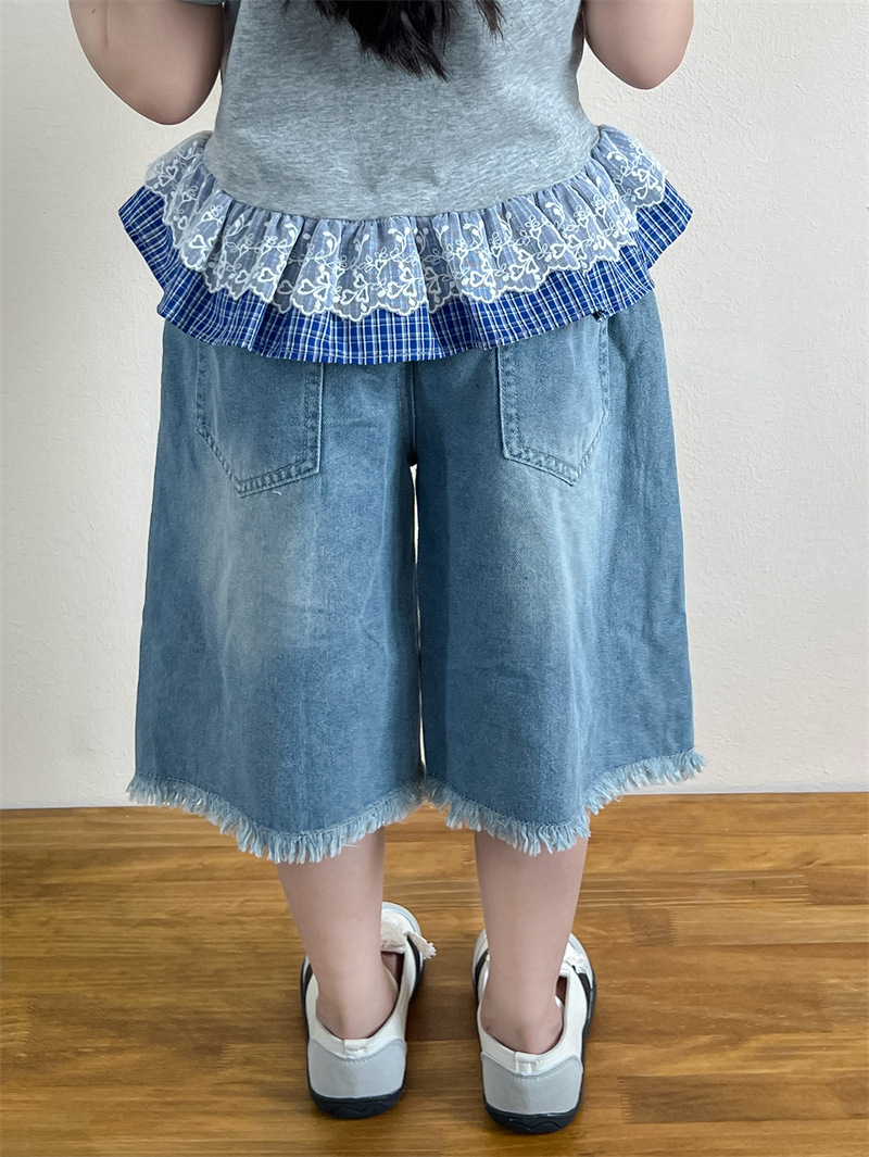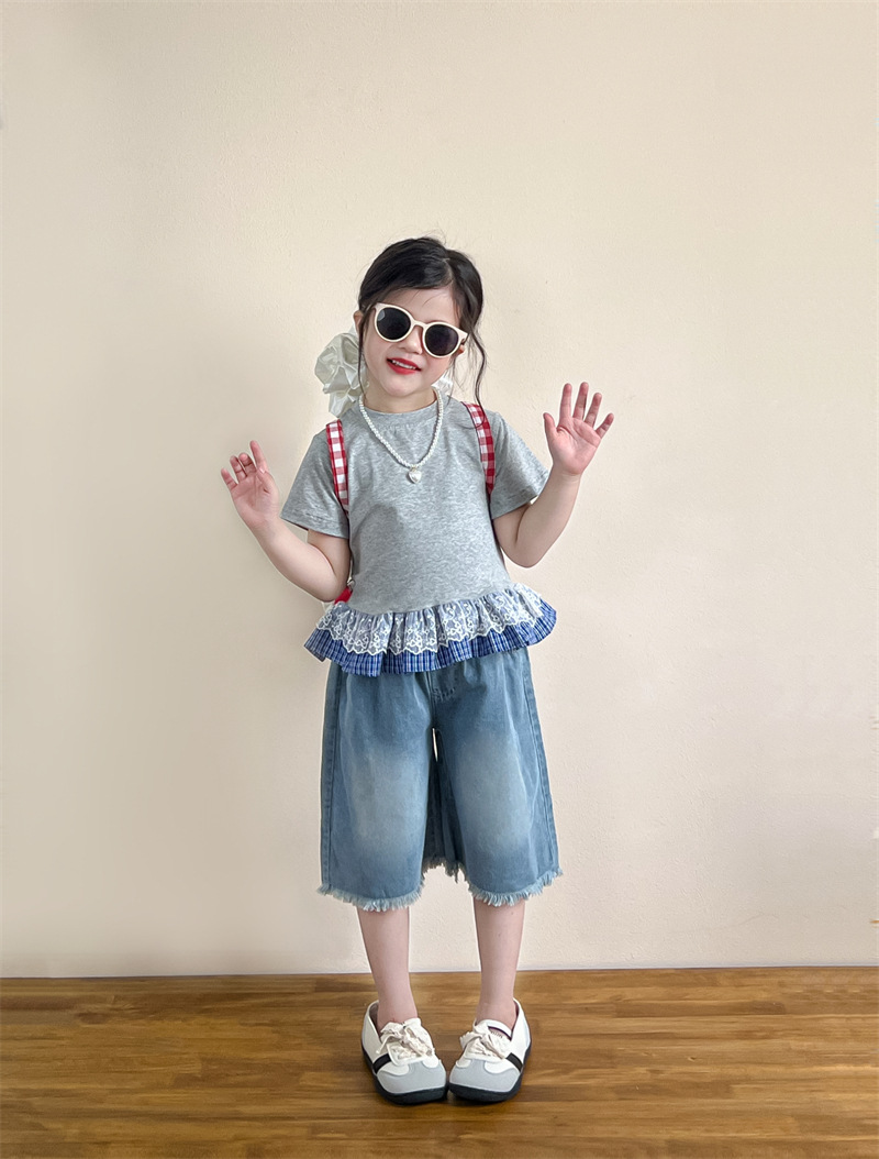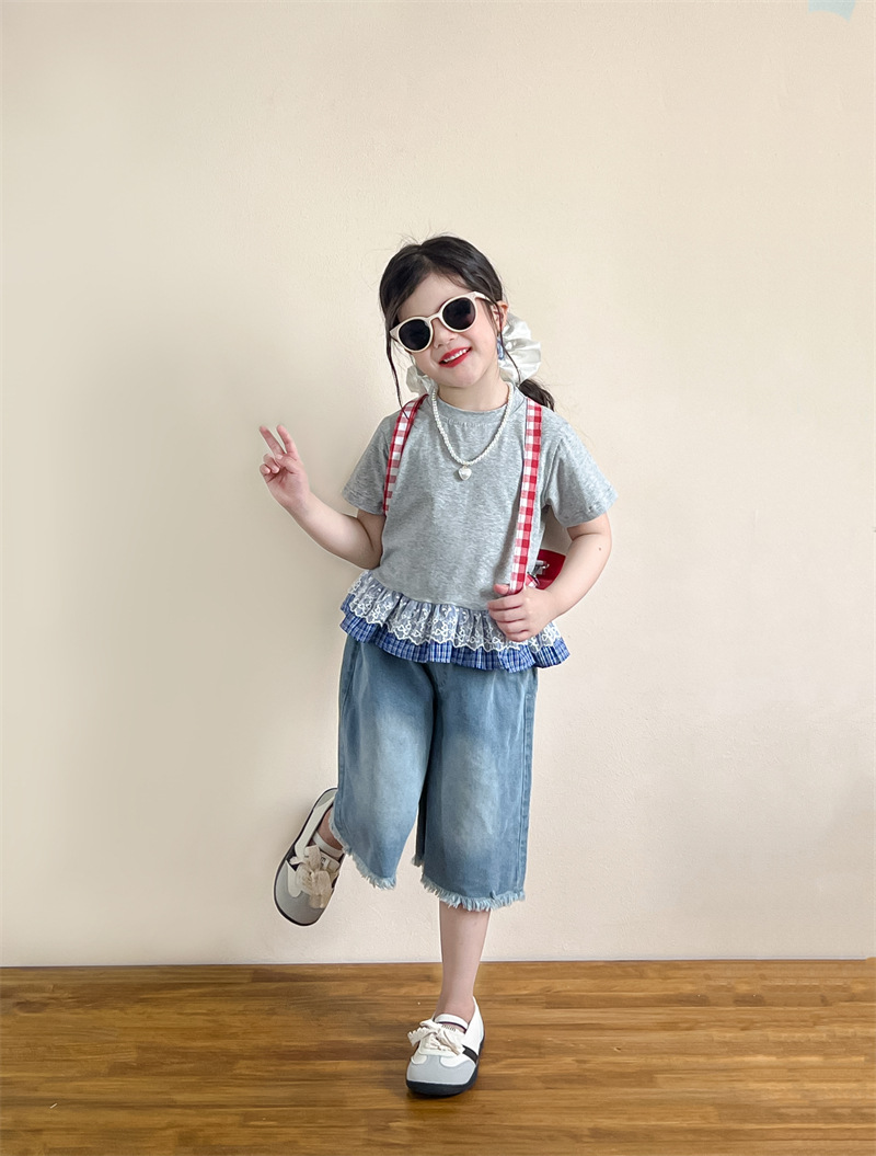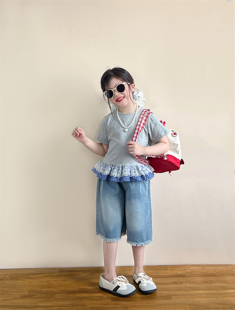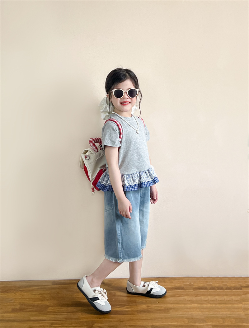 한국 아동복 걸스 여름 레이스 레이스 러플 반팔 빅탑 러플 데님 바지 세트