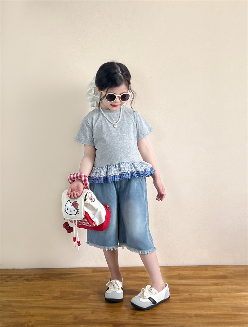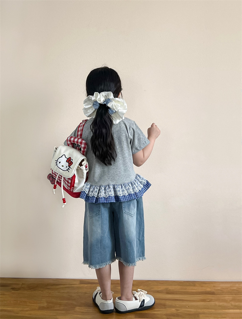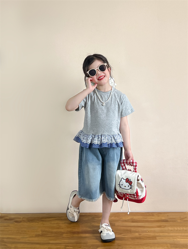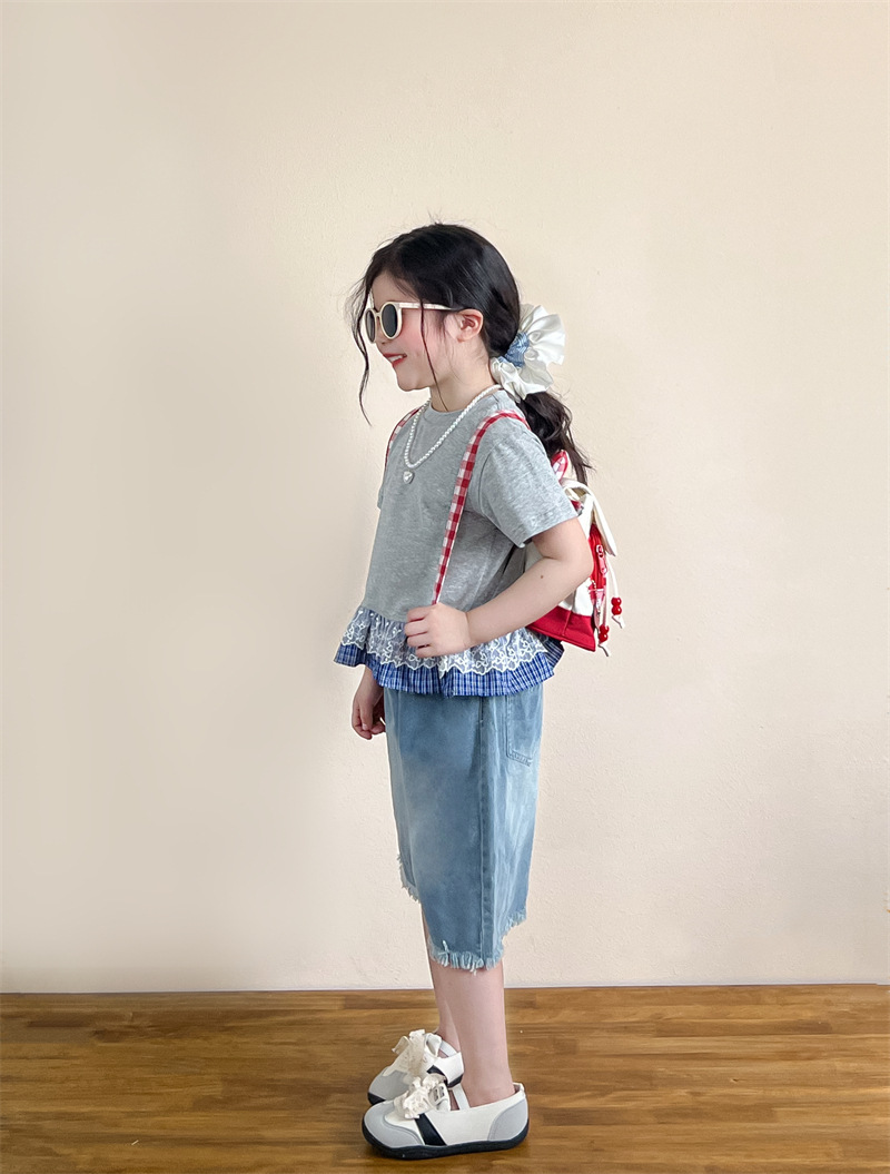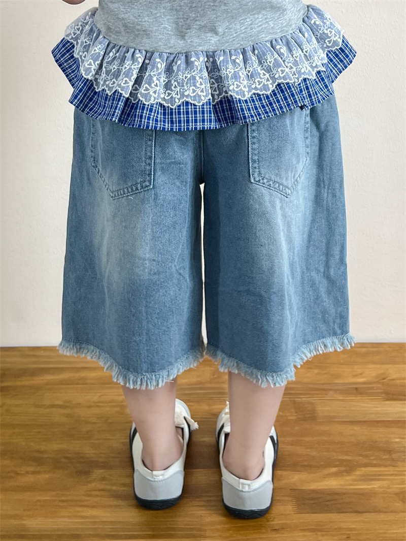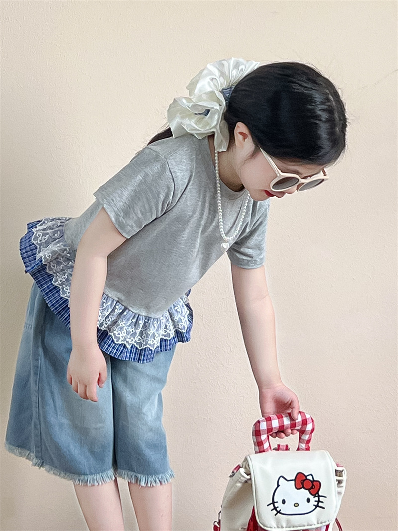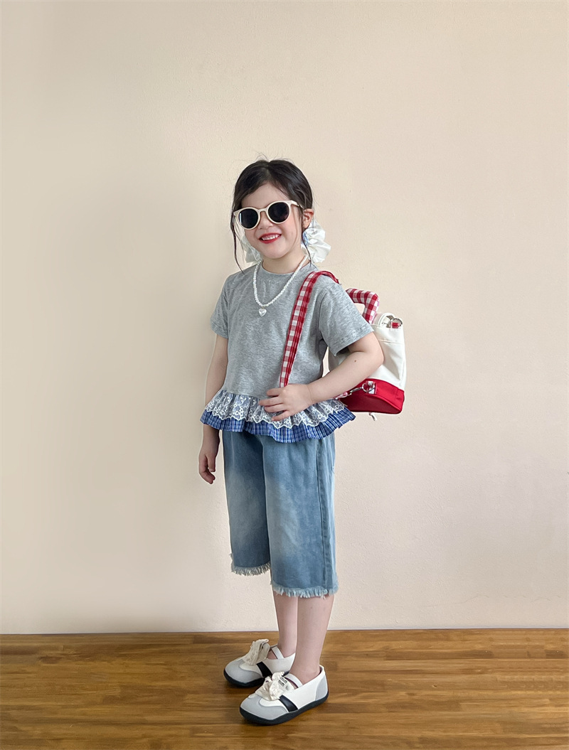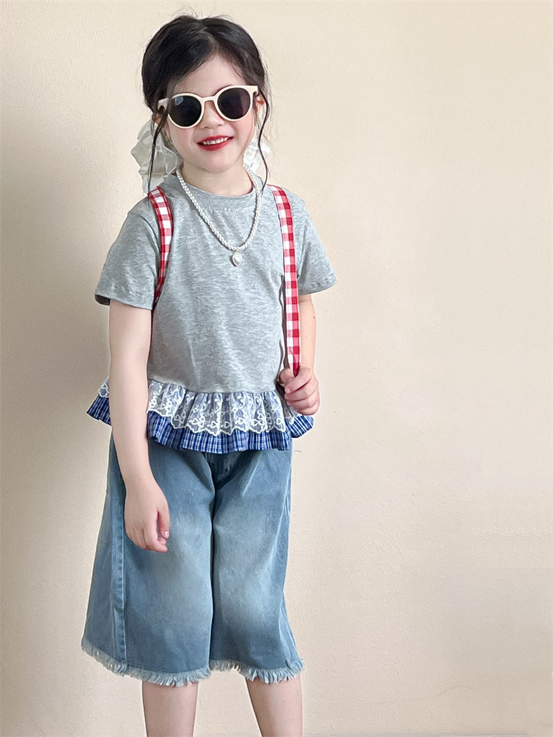 한국 아동복 걸스 여름 레이스 레이스 러플 반팔 빅탑 러플 데님 바지 세트