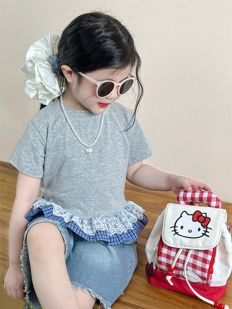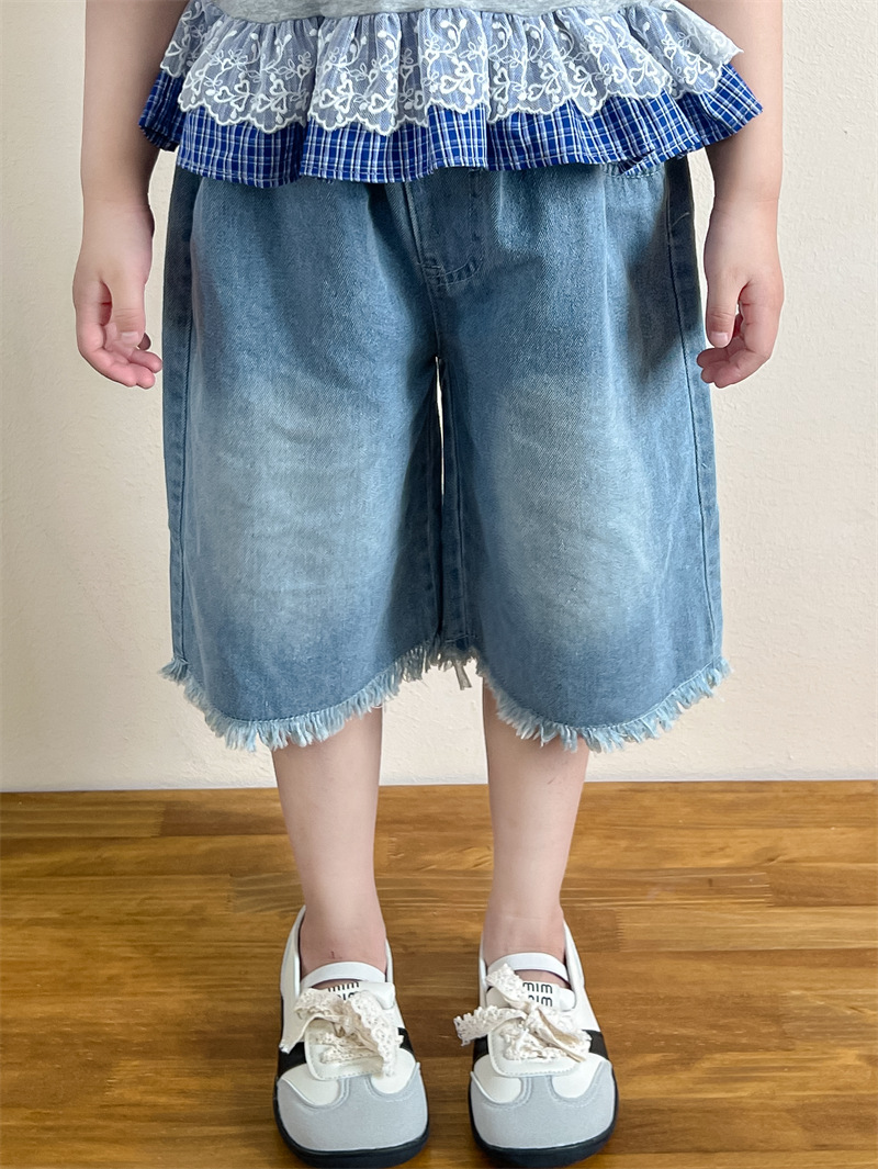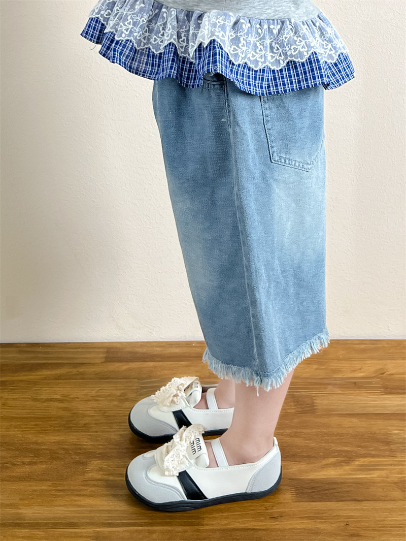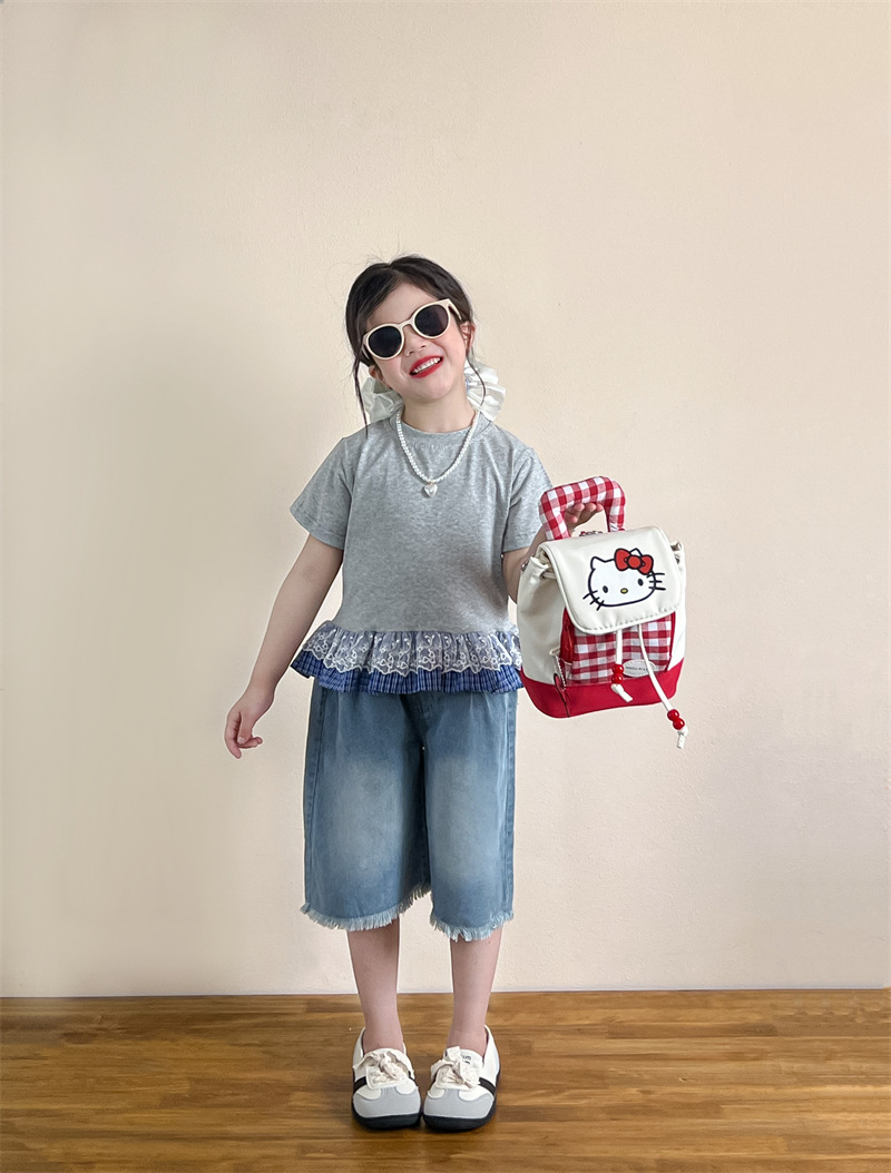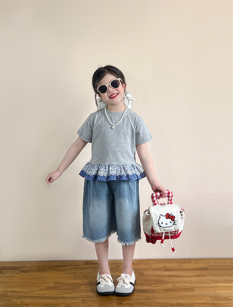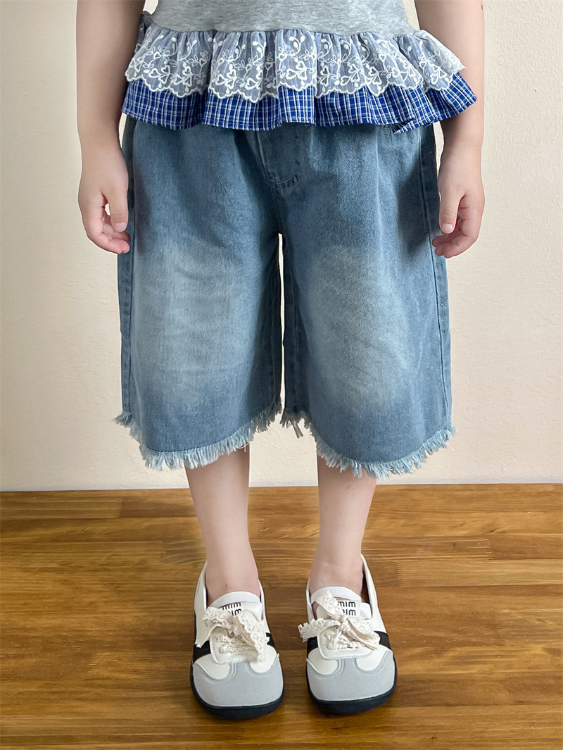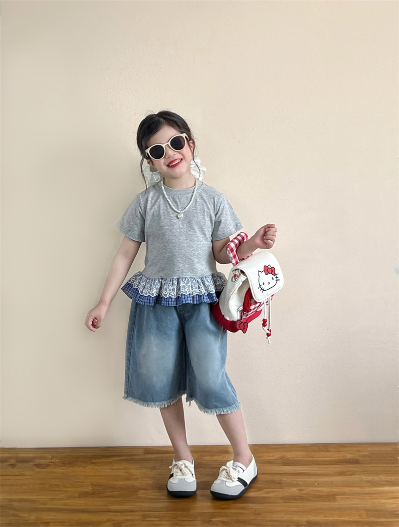 한국 아동복 걸스 여름 레이스 레이스 러플 반팔 빅탑 러플 데님 바지 세트