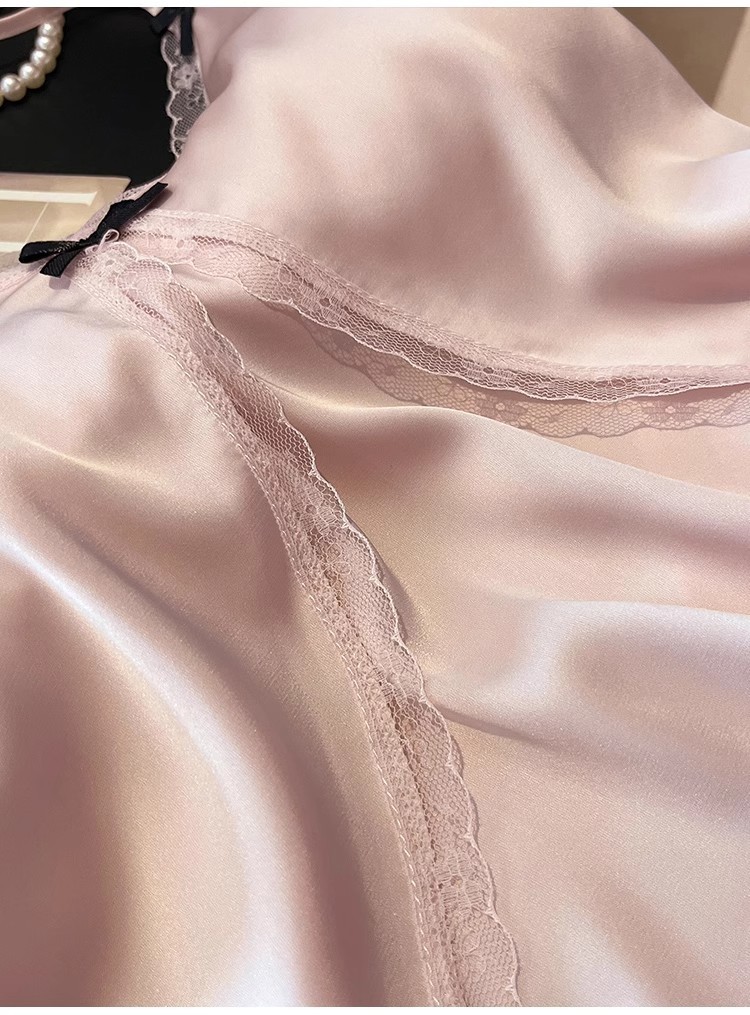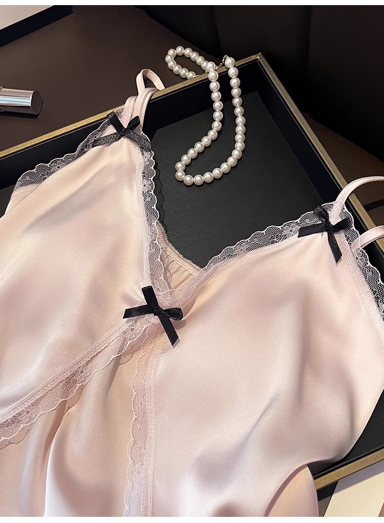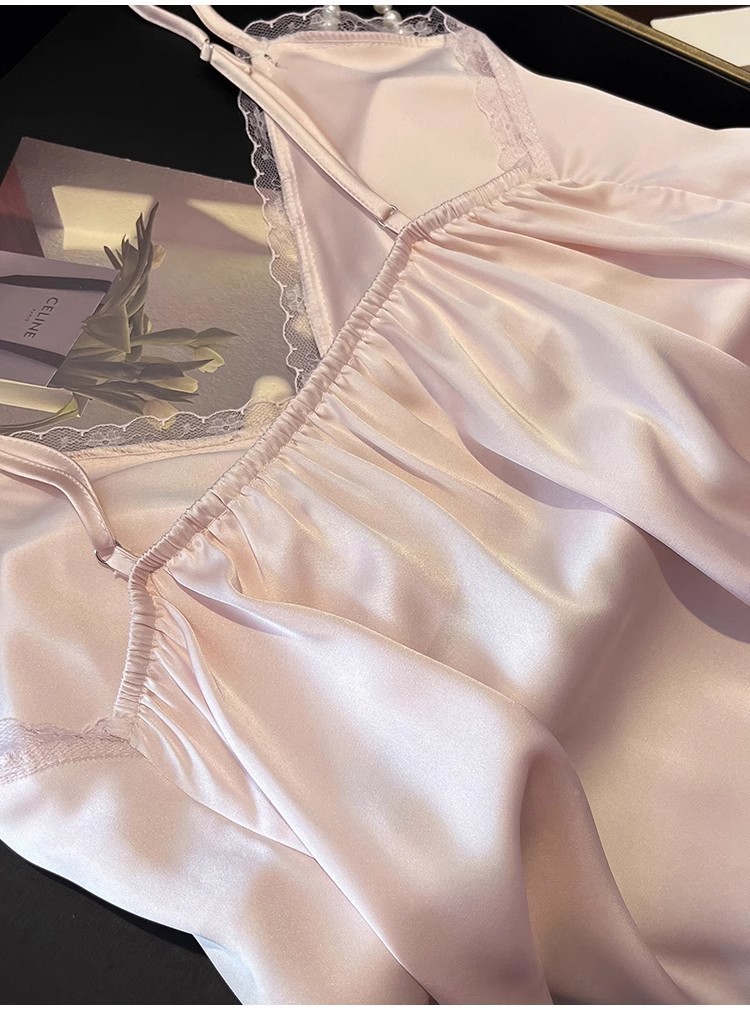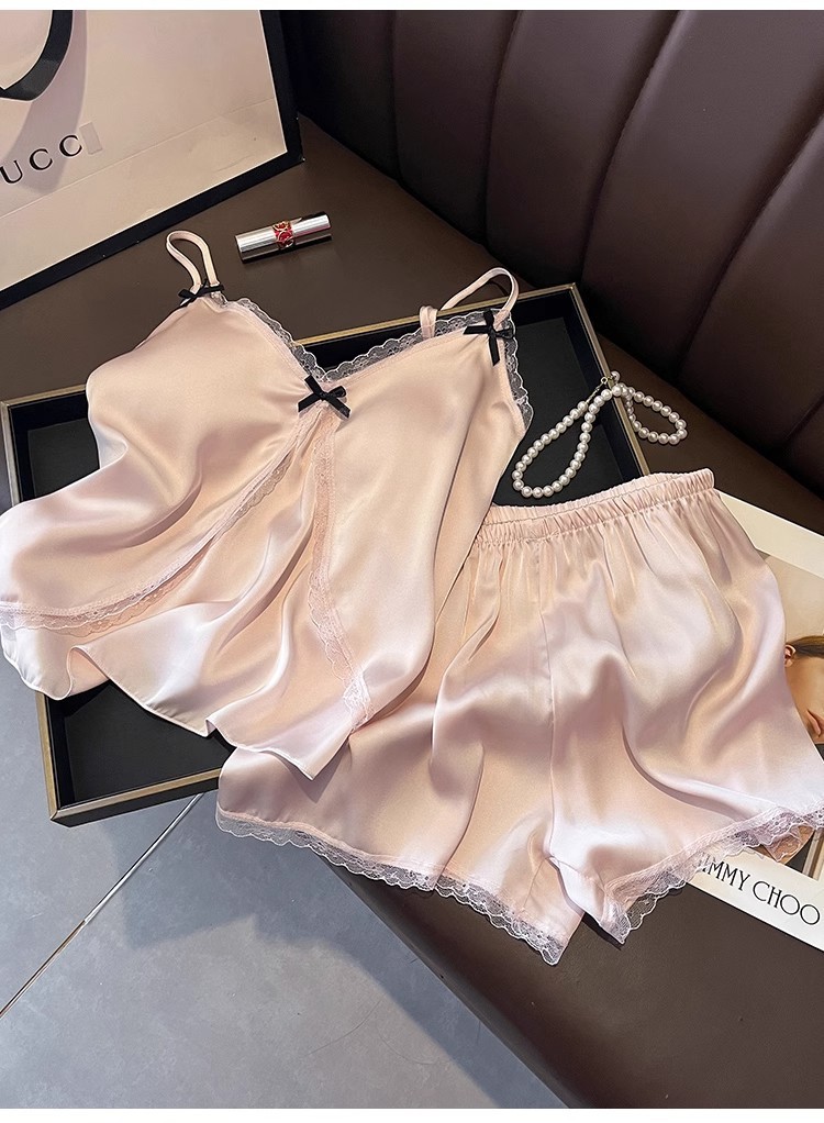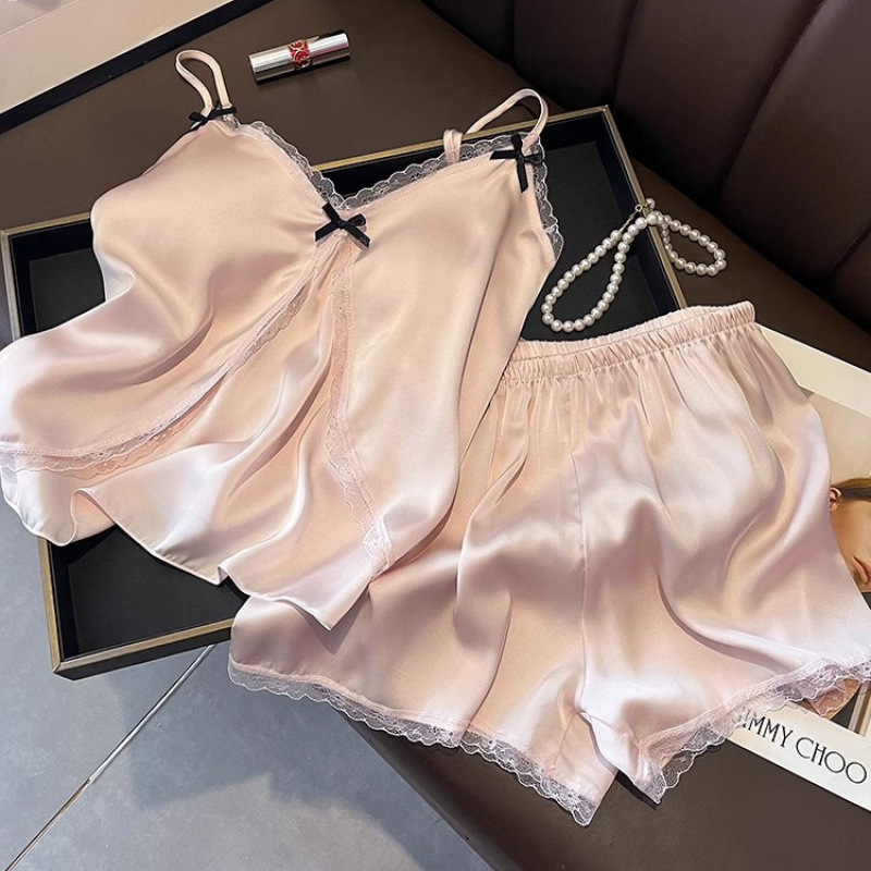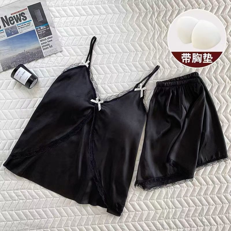 2025 년 여름 여성 아이스 실크 슬링 파자마 홈 의류 섹시한 레이스, 가슴 패드 외부 착용 투피스 세트