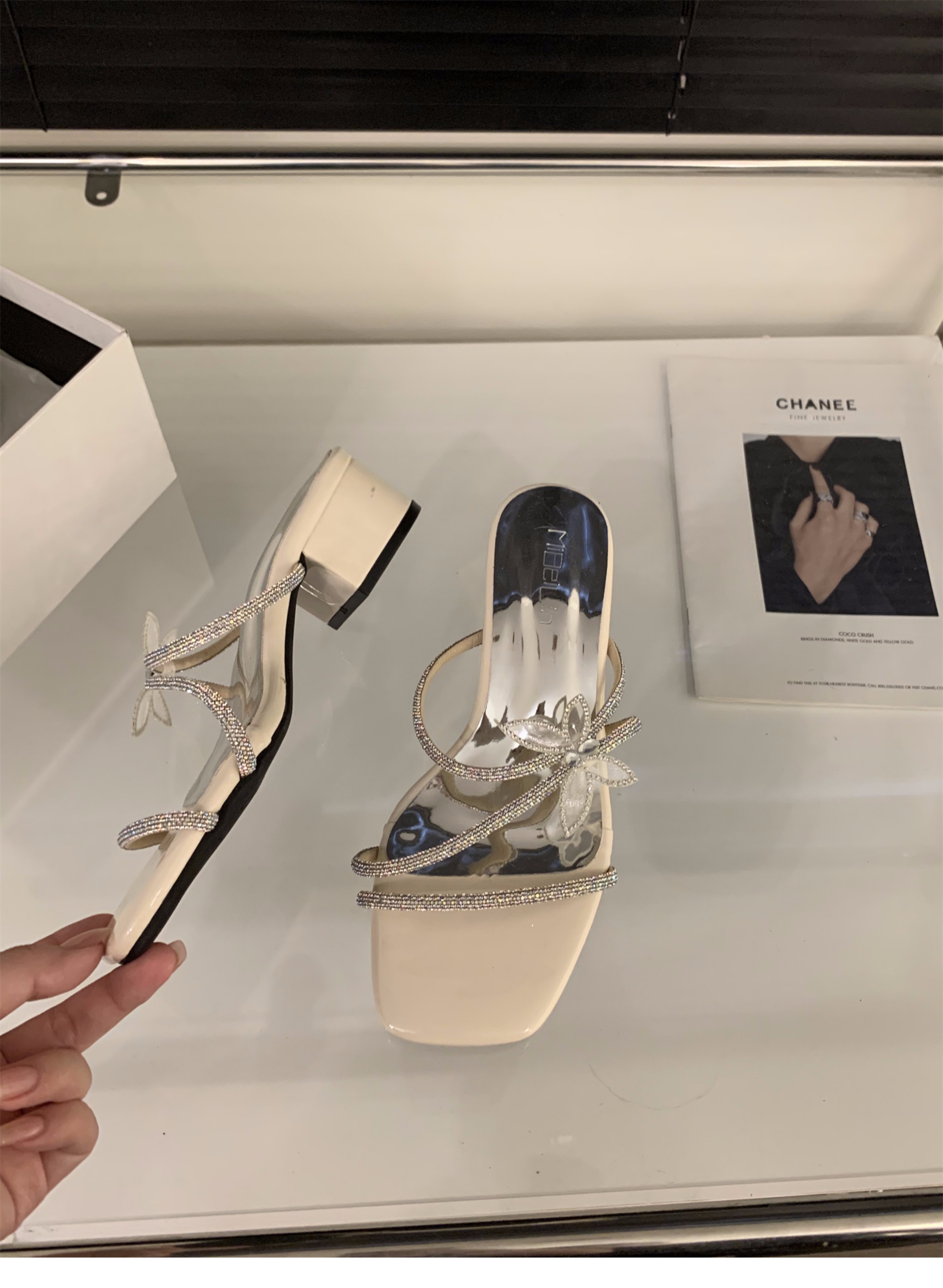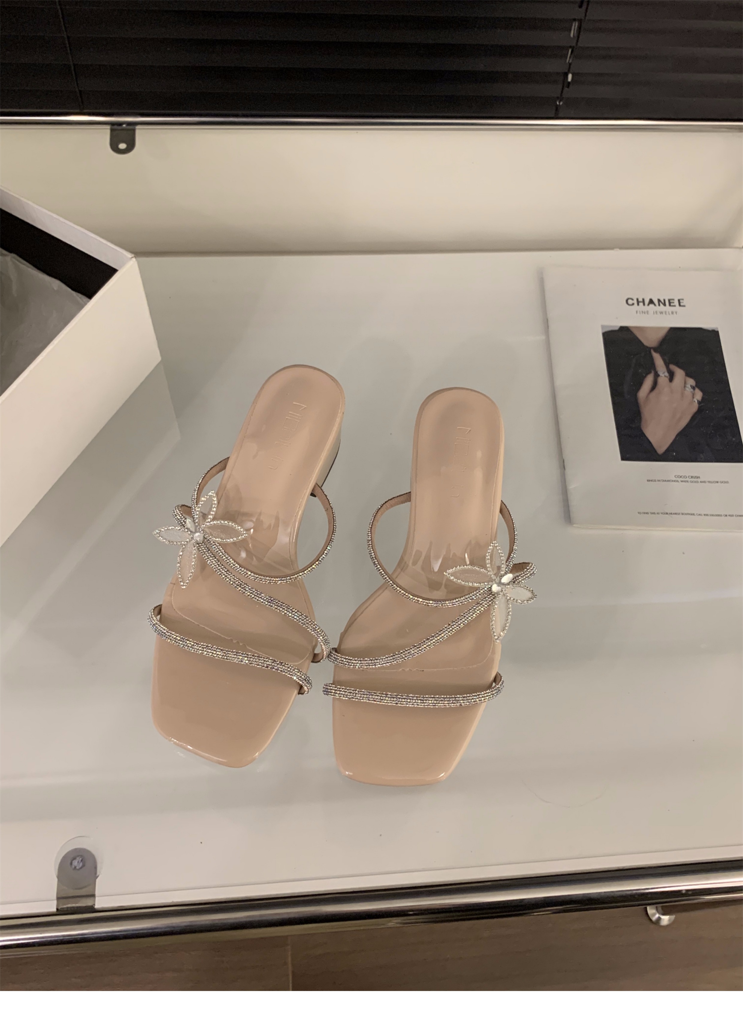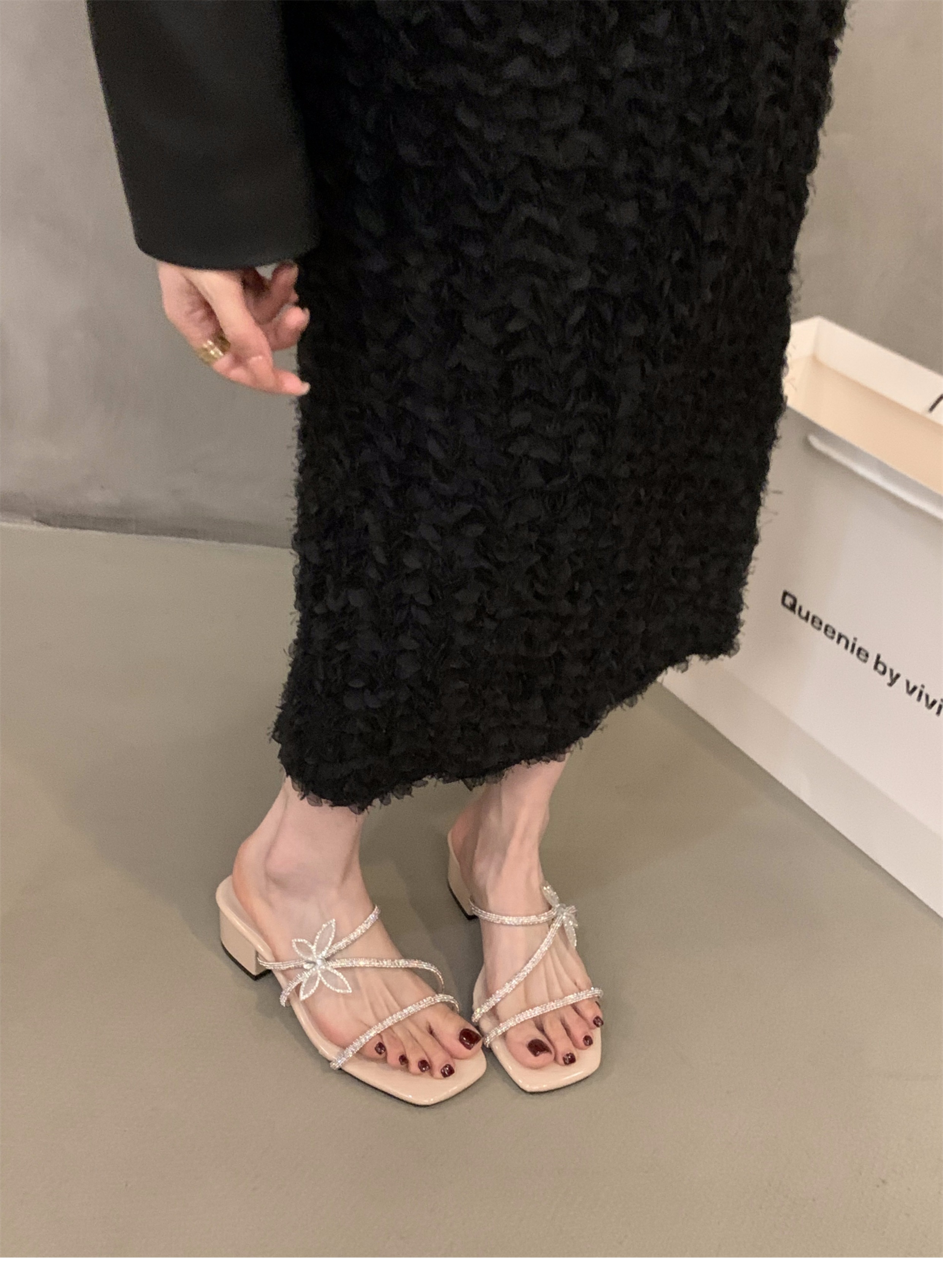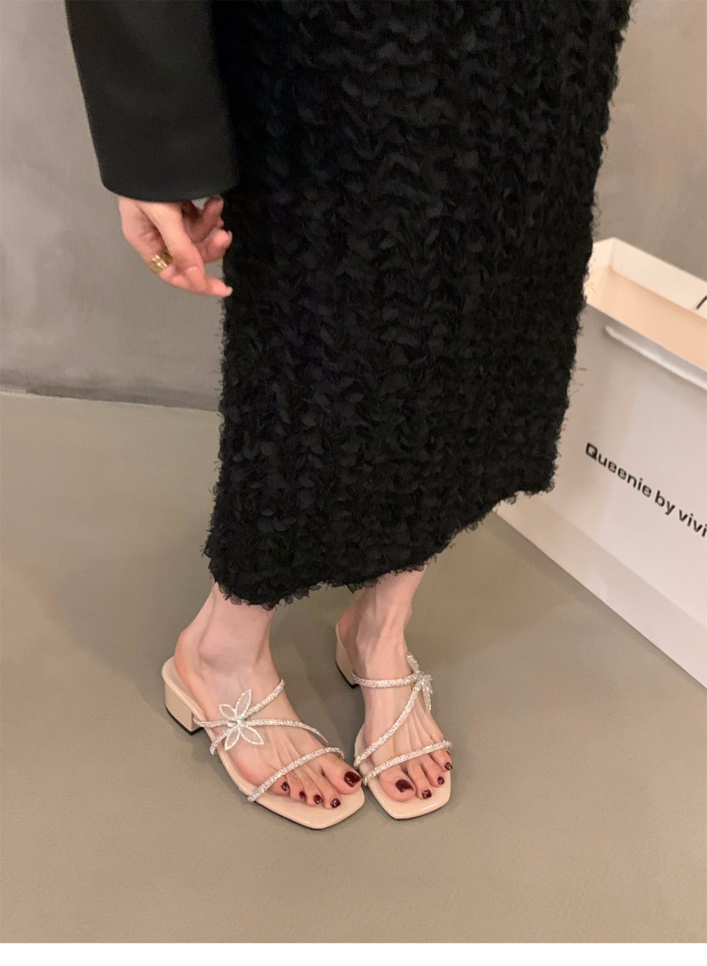 두꺼운 힐 프랑스 고급 기질 샌들 요정 신발 외부 착용 2025 여름 미드 힐 핑크 라인 스톤 샌들스토어 가기