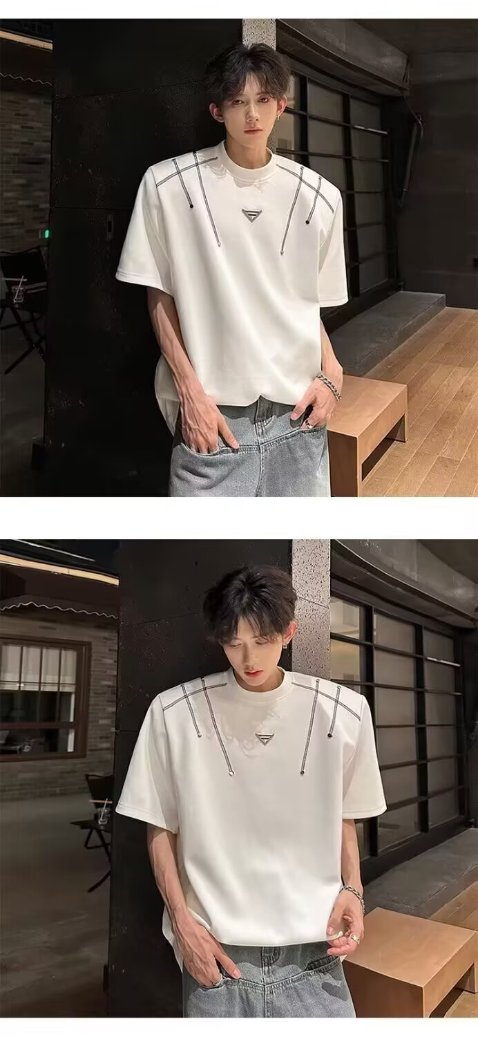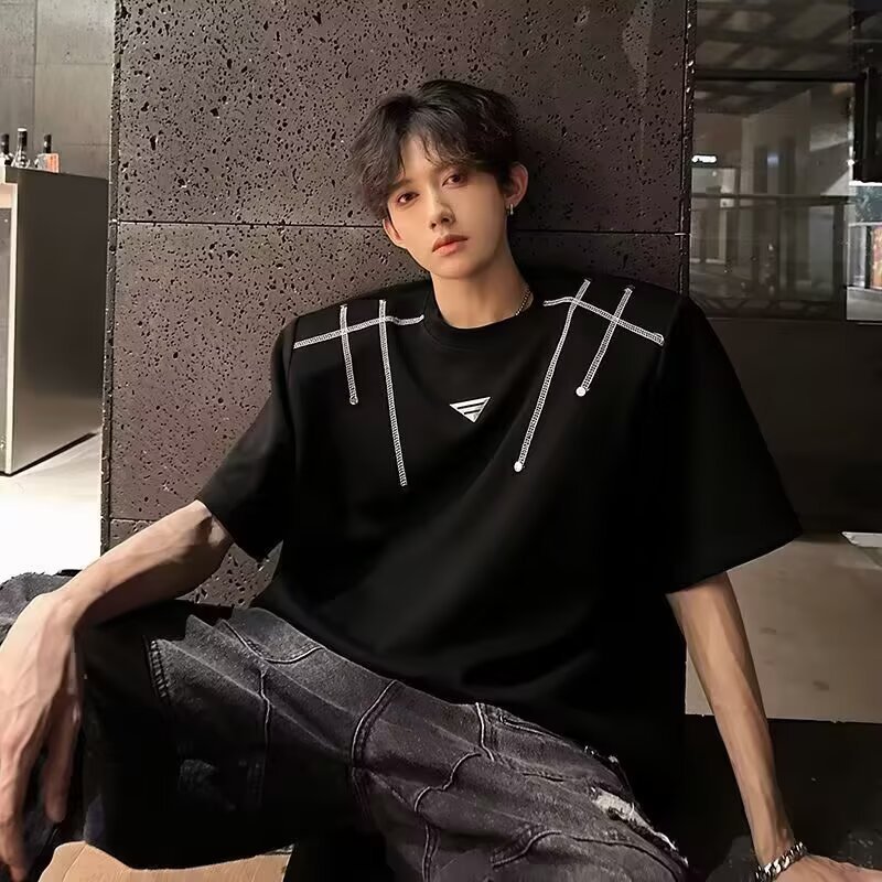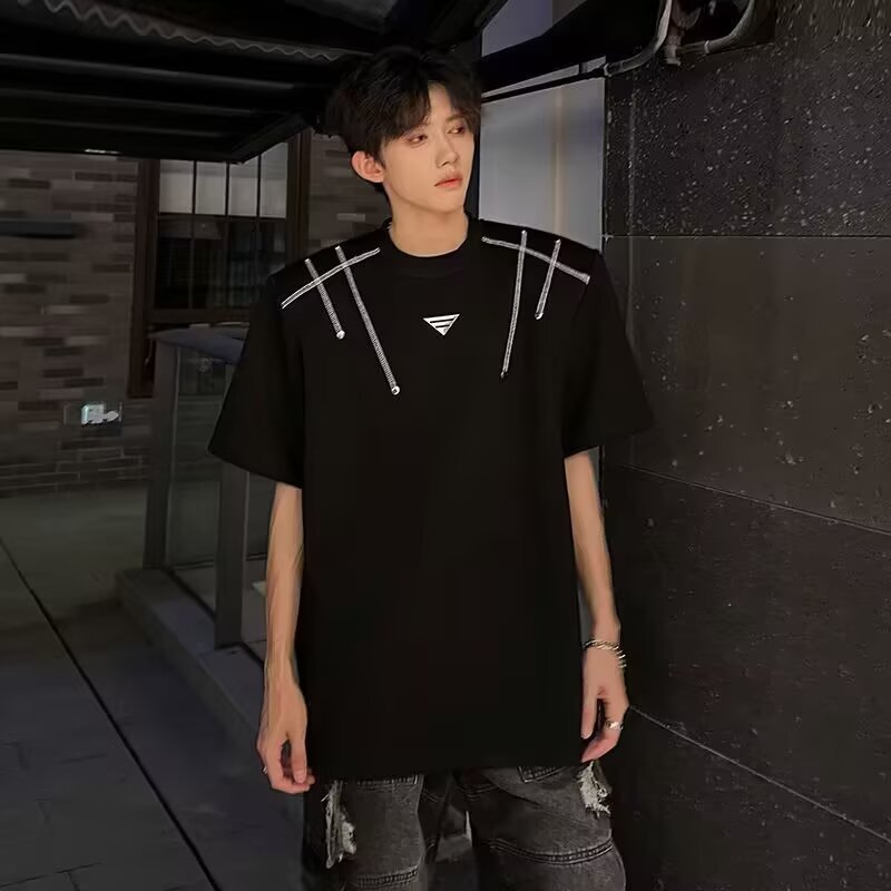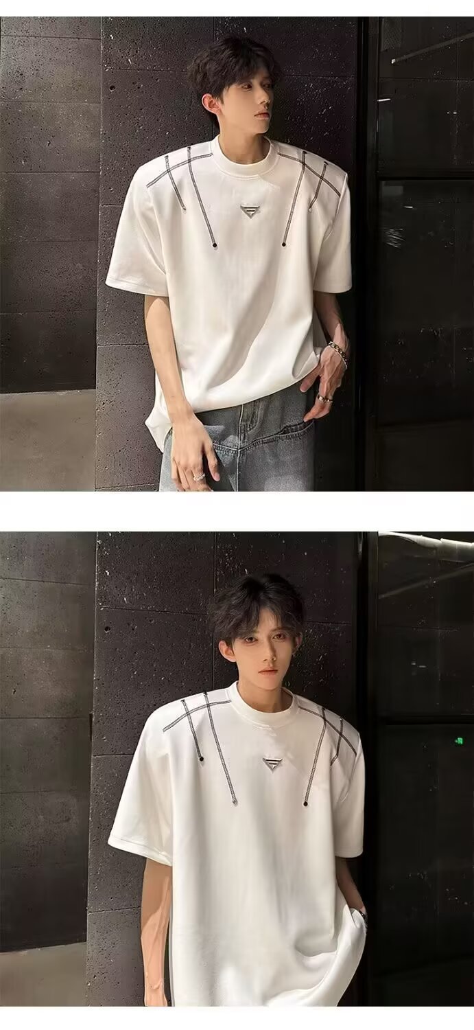 아메리칸 니치 헤비메탈 어깨 패드 디자인 반팔 티셔츠 남성 여름 반팔 루즈 탑스토어 가기