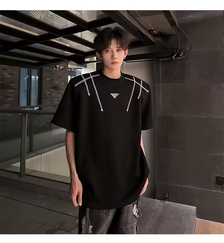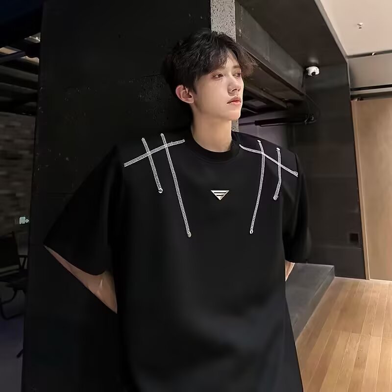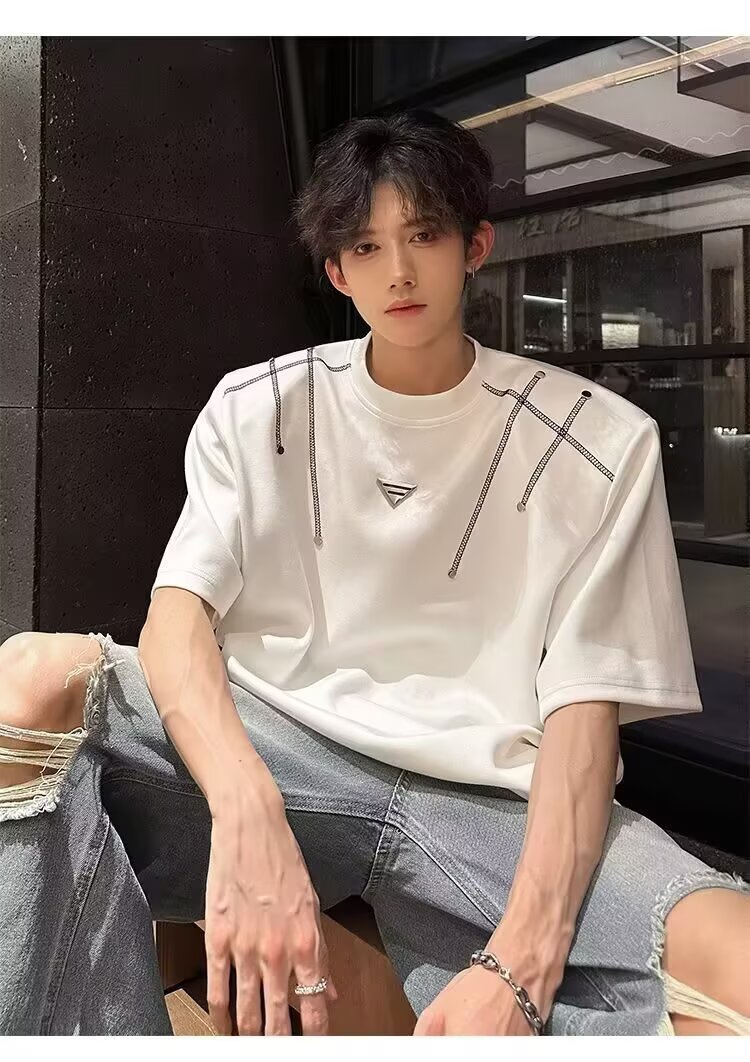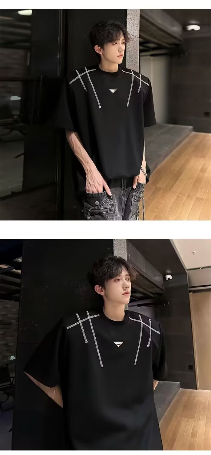 아메리칸 니치 헤비메탈 어깨 패드 디자인 반팔 티셔츠 남성 여름 반팔 루즈 탑스토어 가기