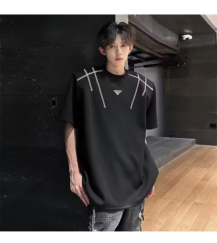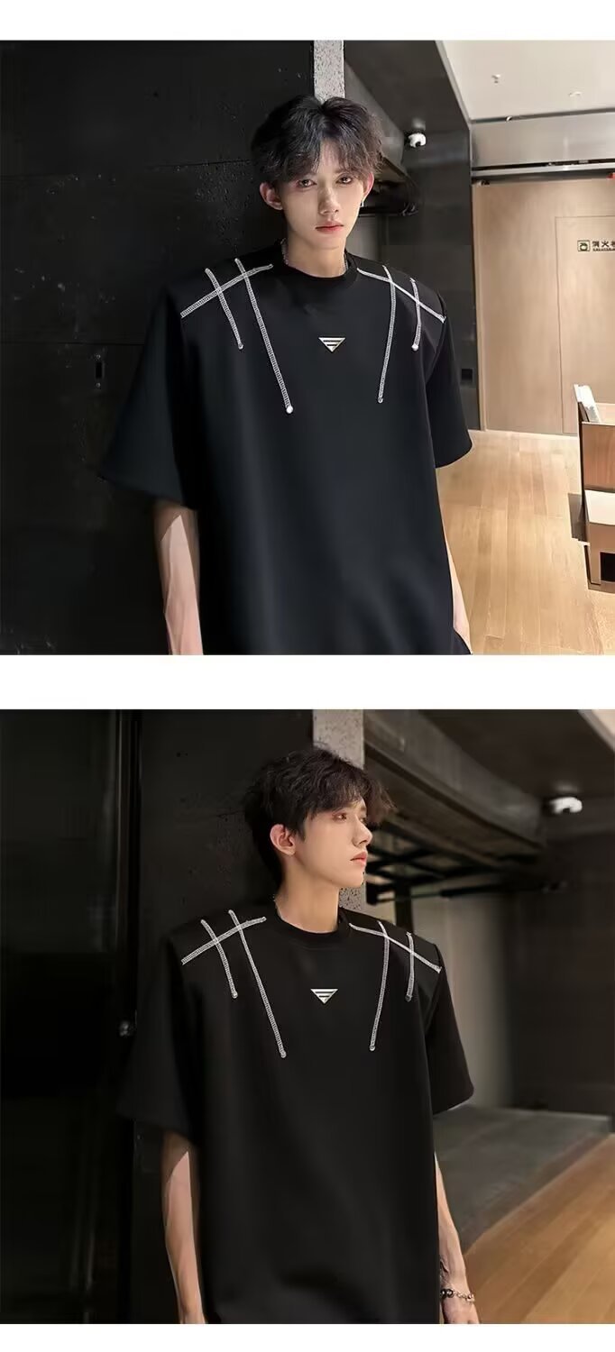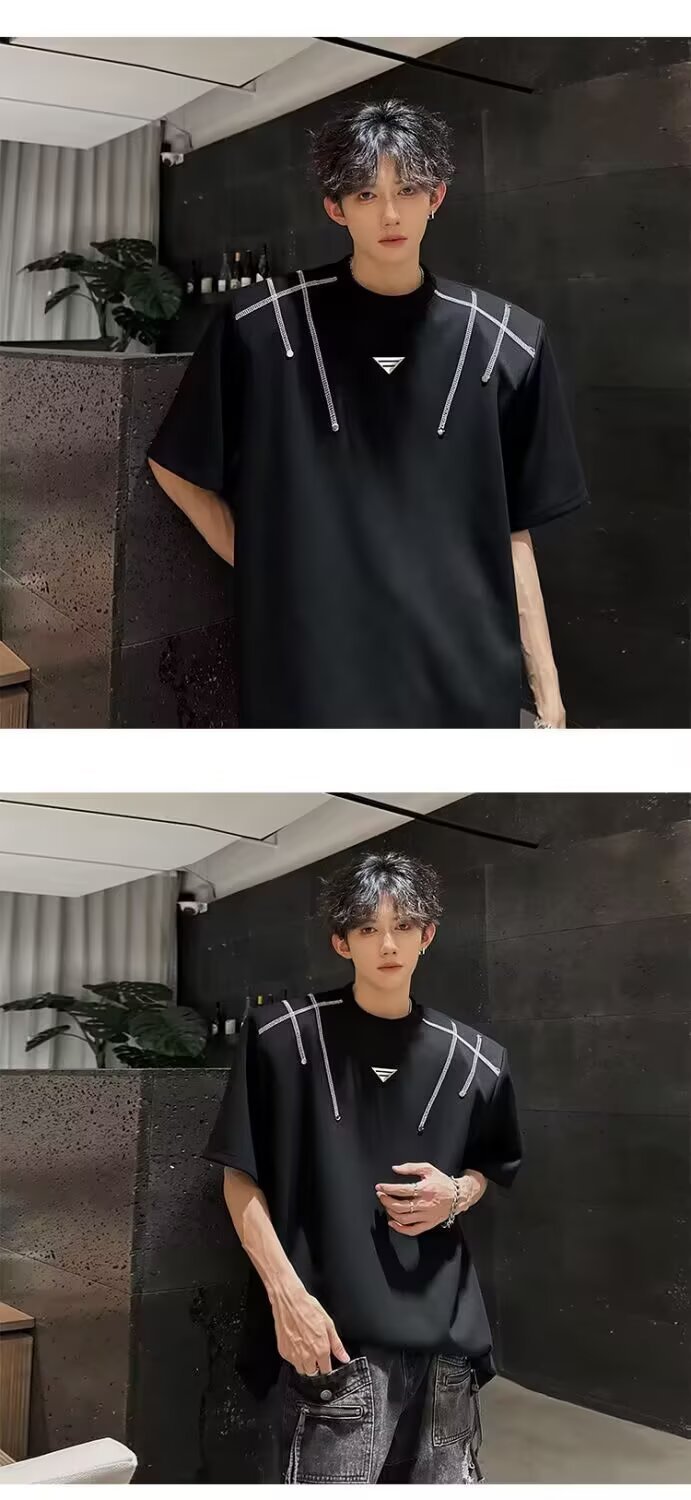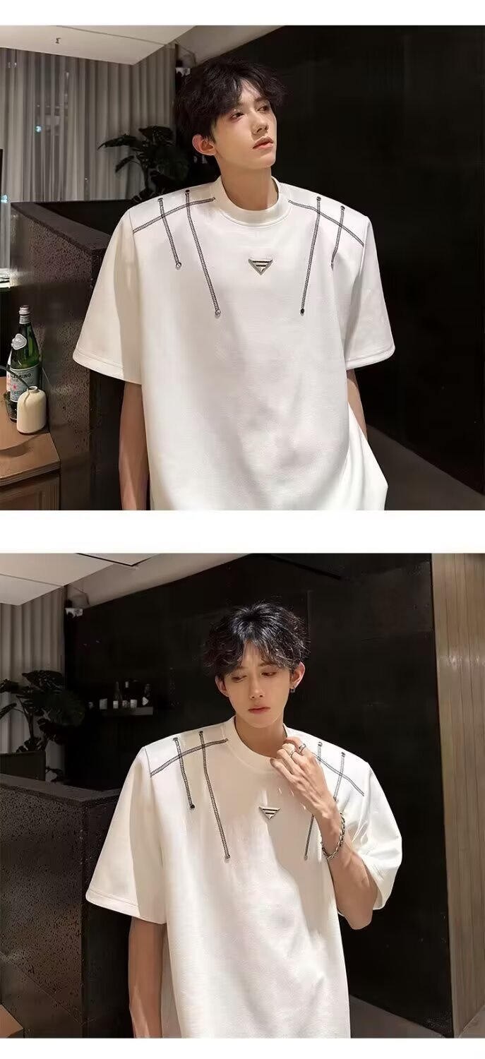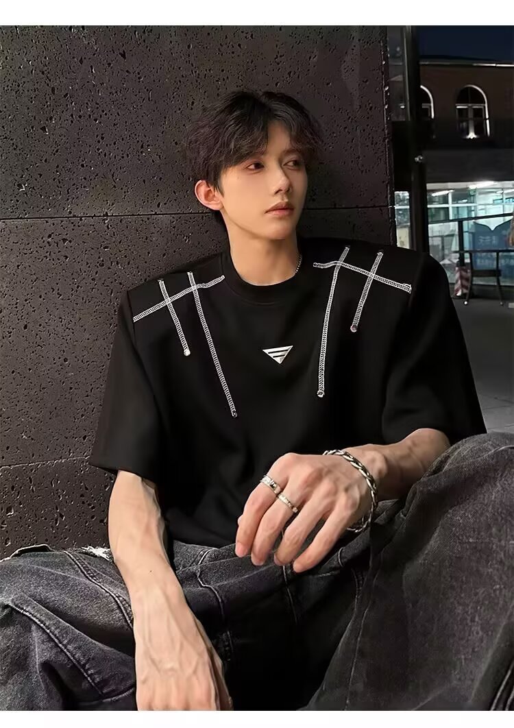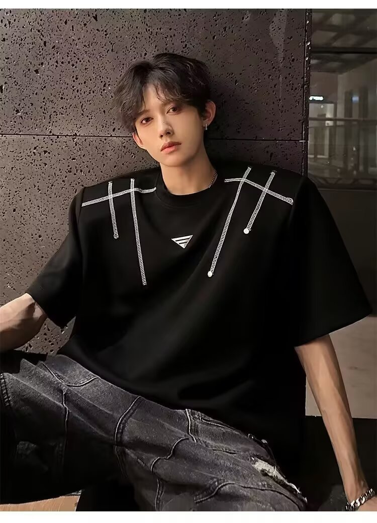 아메리칸 니치 헤비메탈 어깨 패드 디자인 반팔 티셔츠 남성 여름 반팔 루즈 탑