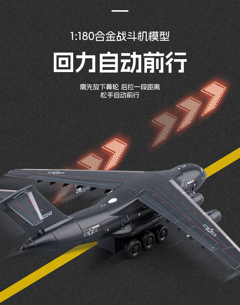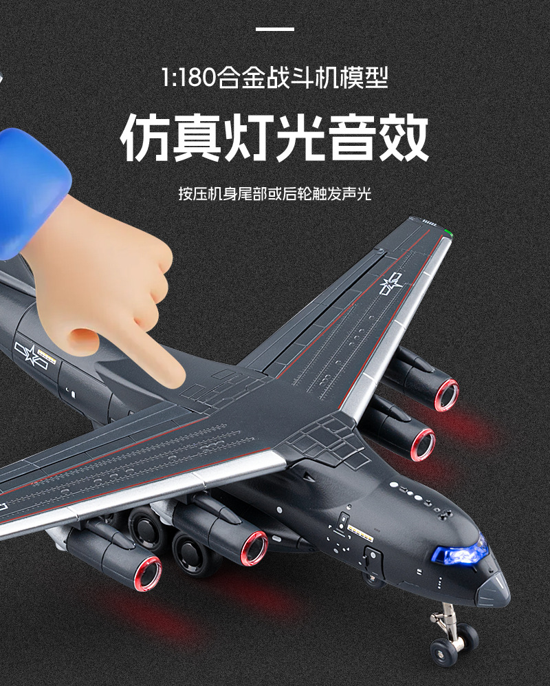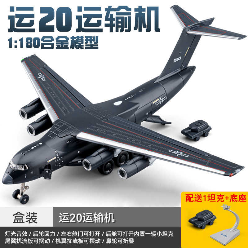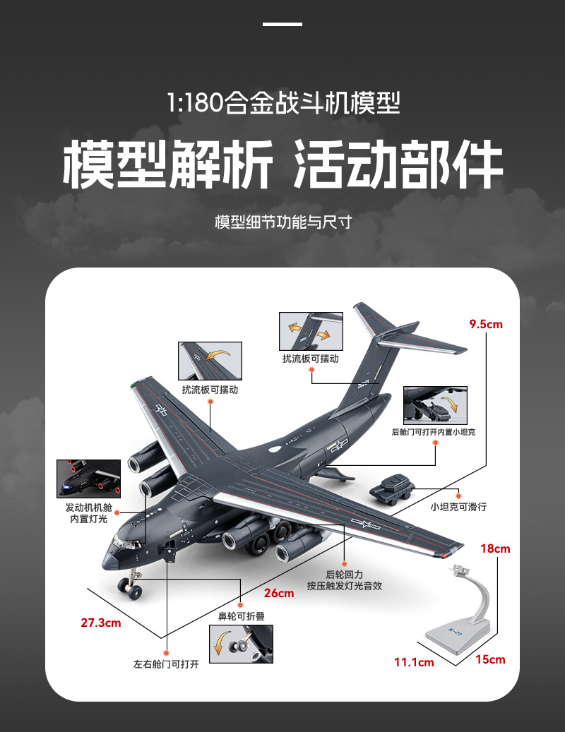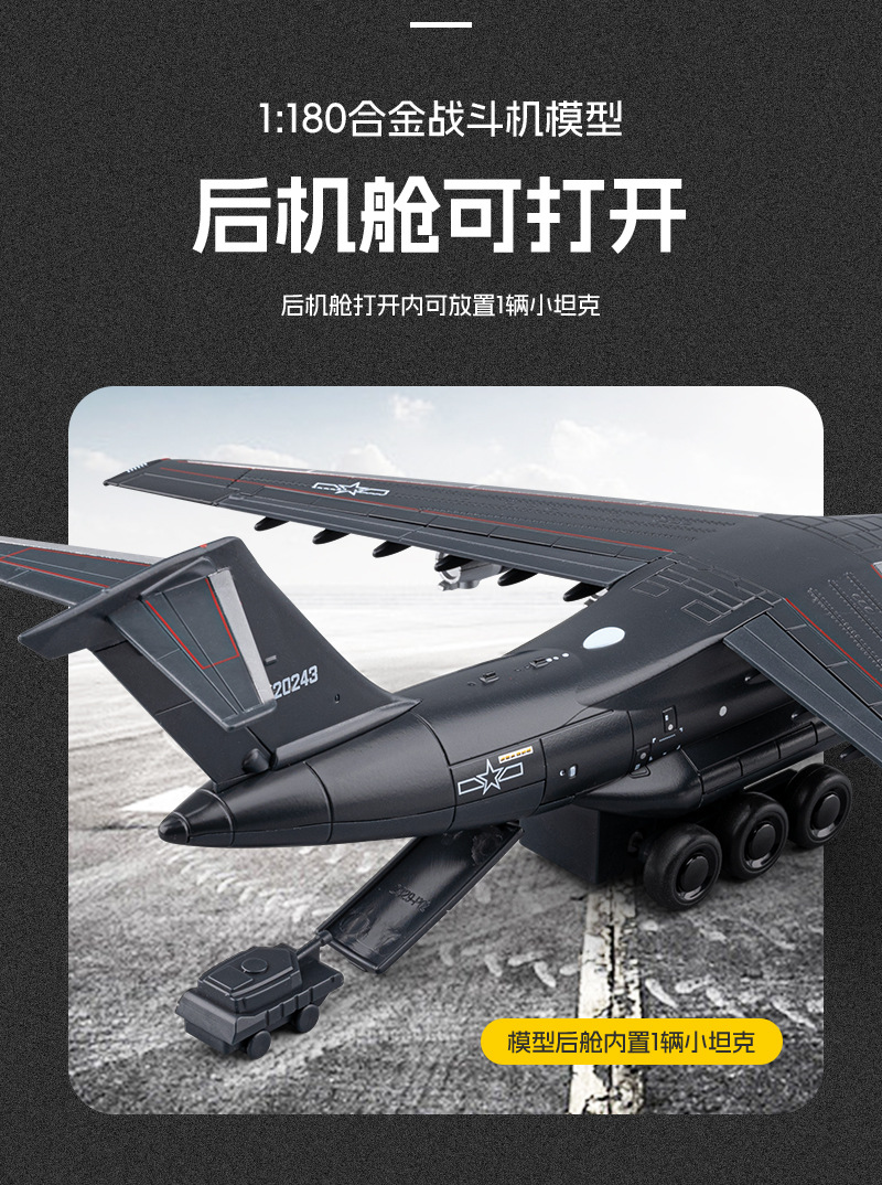 【商品功能】合金机身,声光回力功能左右舱门可以打开,鼻轮可折叠;扰流板均可摆动;发动机和驾驶舱内置灯光;货舱门可打开,内置坦克模型,坦克可以滑行;按压后轮可触发灯光和仿真音效;