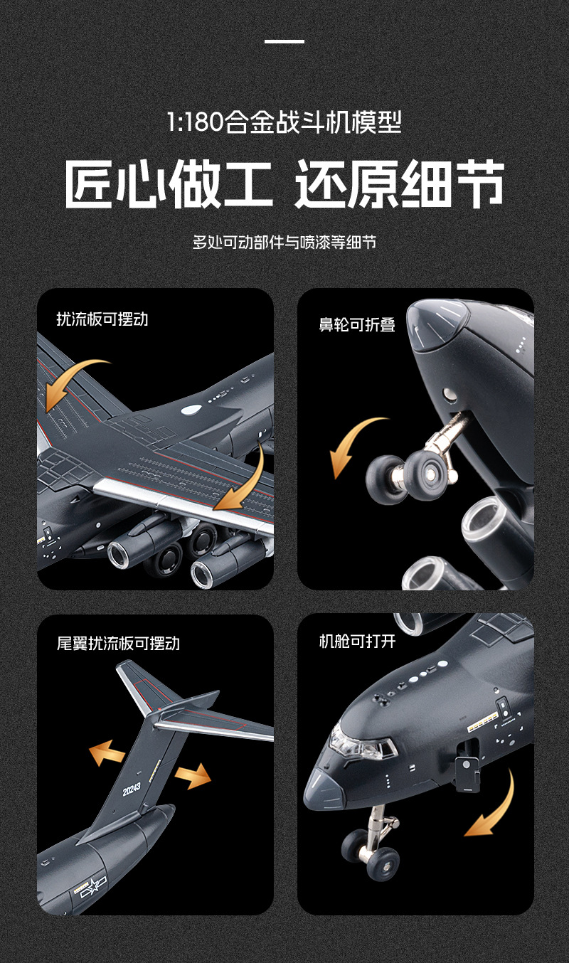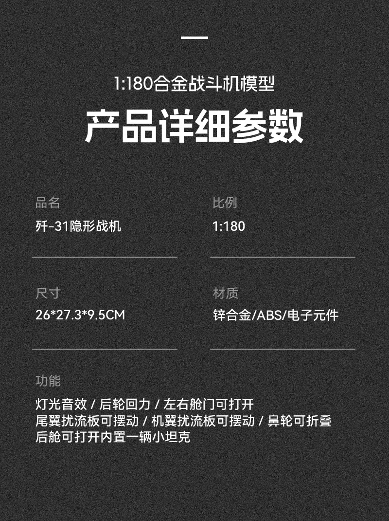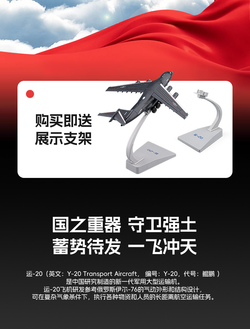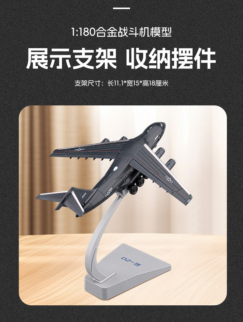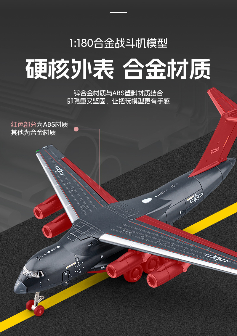 【商品功能】合金机身,声光回力功能左右舱门可以打开,鼻轮可折叠;扰流板均可摆动;发动机和驾驶舱内置灯光;货舱门可打开,内置坦克模型,坦克可以滑行;按压后轮可触发灯光和仿真音效;