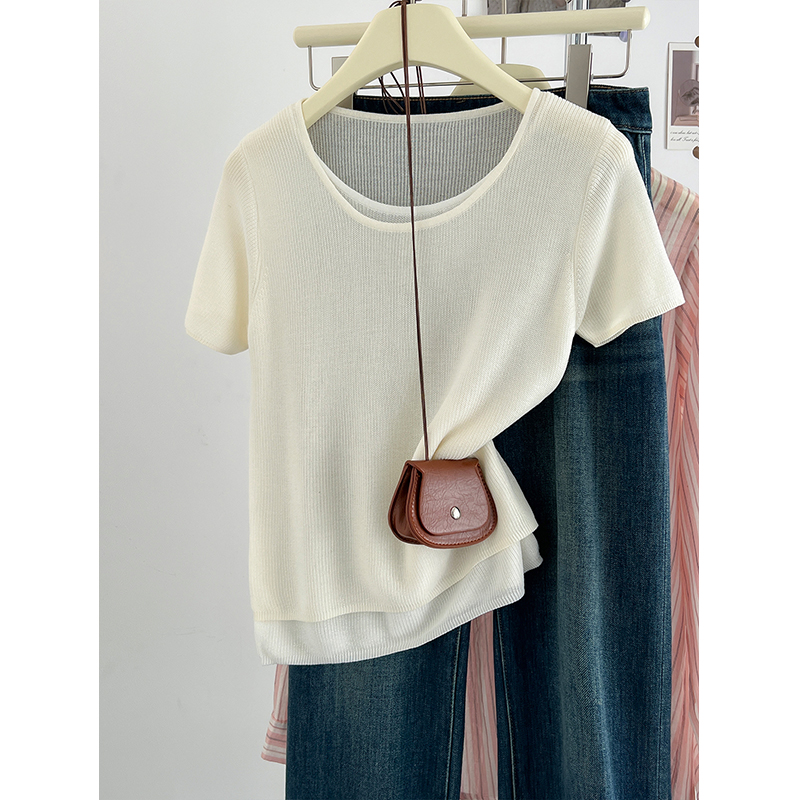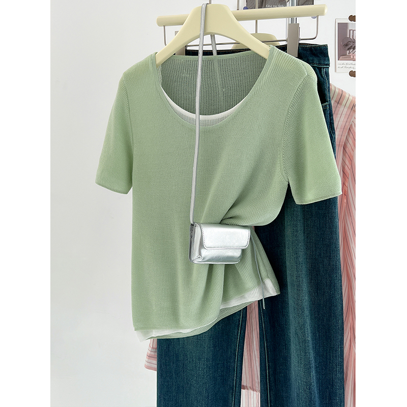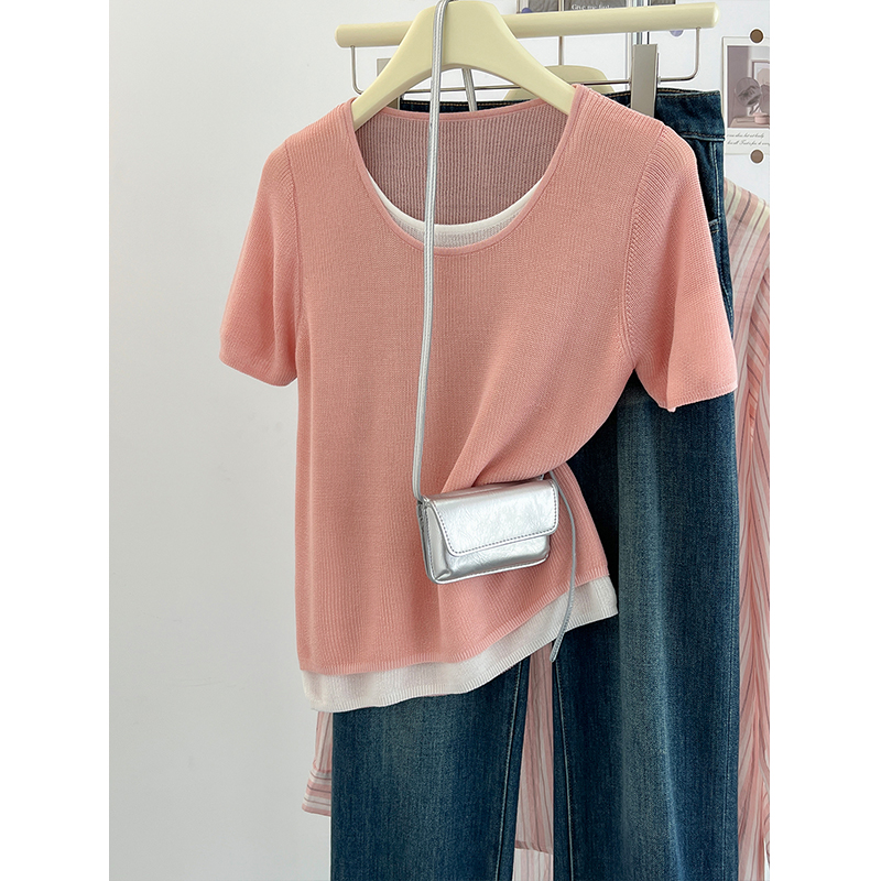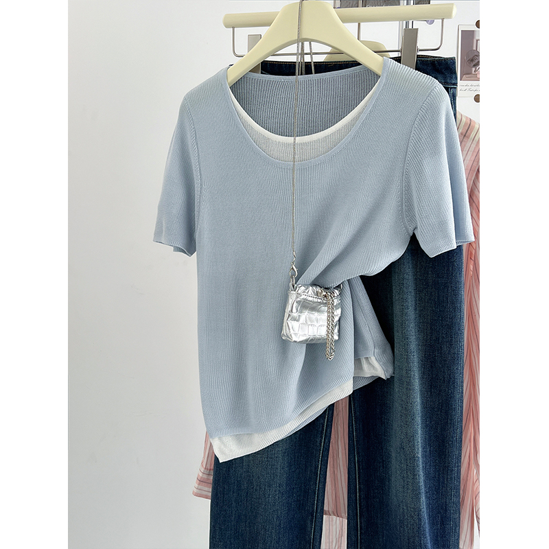 한국식 블루 페이크 투피스 아이스 실크 어깨 반소매 티셔츠 여성용 여름 디자인 컬러 대조 느슨한 짧은 니트 탑