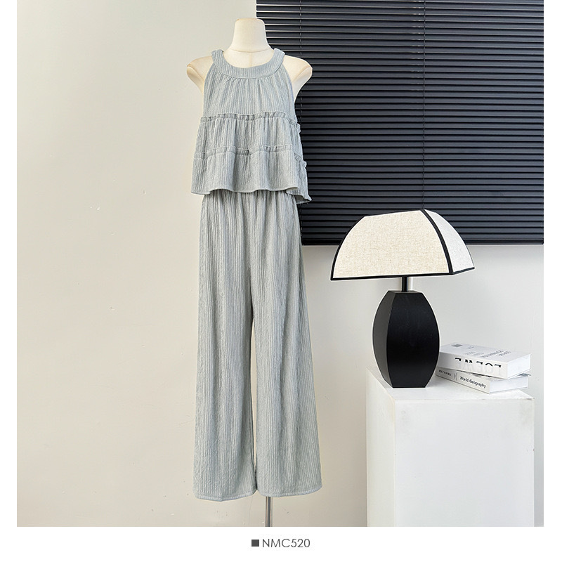 여름 뉴 에이지 감소 치바 캐주얼 세트 여성 게으른 스타일 아우터웨어 민소매 탑 하이 허리 와이드 레그 팬츠 투피스 세트스토어 가기