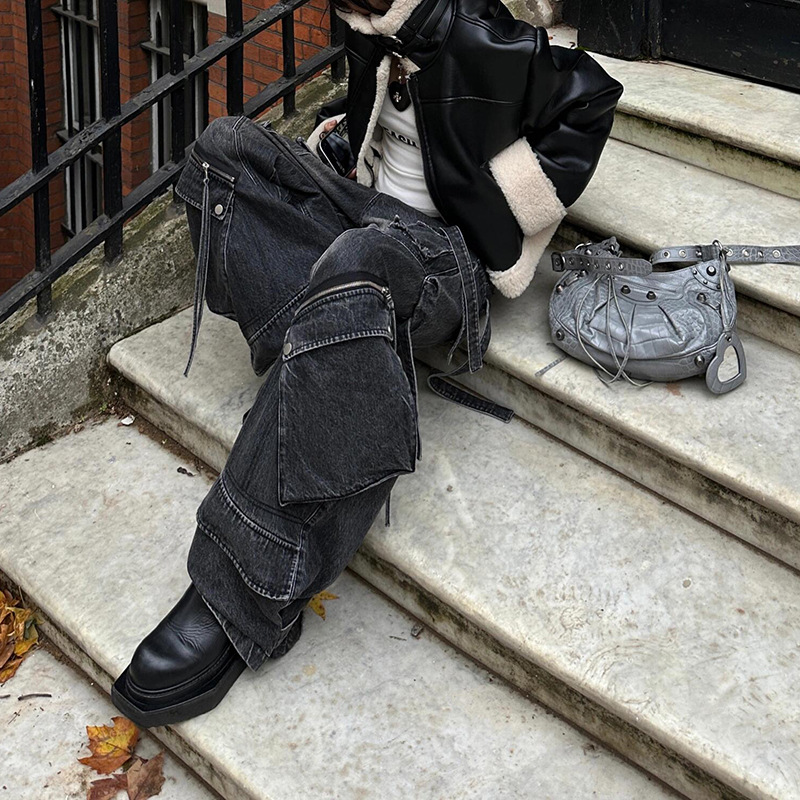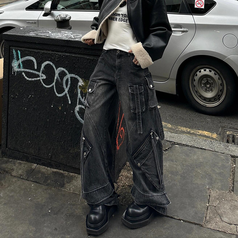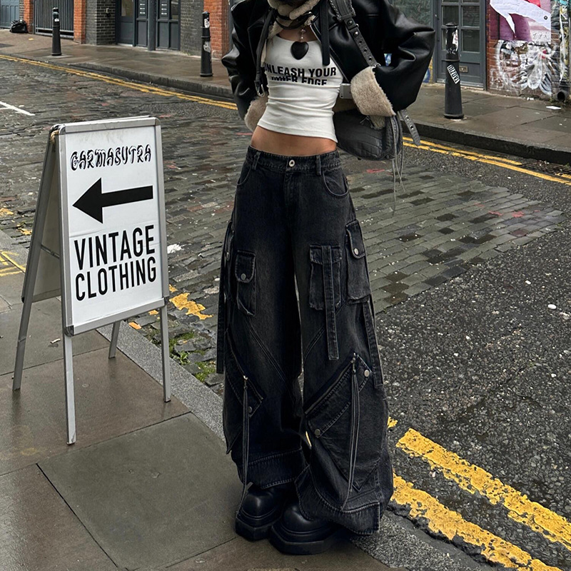 미국식 하이 스트리트 블랙 바지 청바지 여성용 느슨한 복고풍 바닥 걸레 와이드 레그 팬츠 멀티 포켓 스트리트 레트로 패션 브랜드스토어 가기