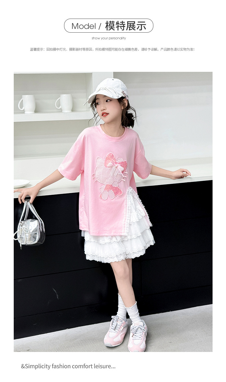 소녀의 세트 여름 2025 새로운 어린이 세련된 반팔 티셔츠 여름 소녀의 레이스 케이크 스커트 투피스 세트