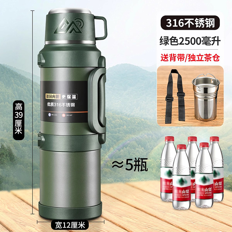 • [316 스테인레스 스틸] 밀리터리 그린 2.5리터(물 2.5kg리터) 스트랩 + 롱티칸 포함