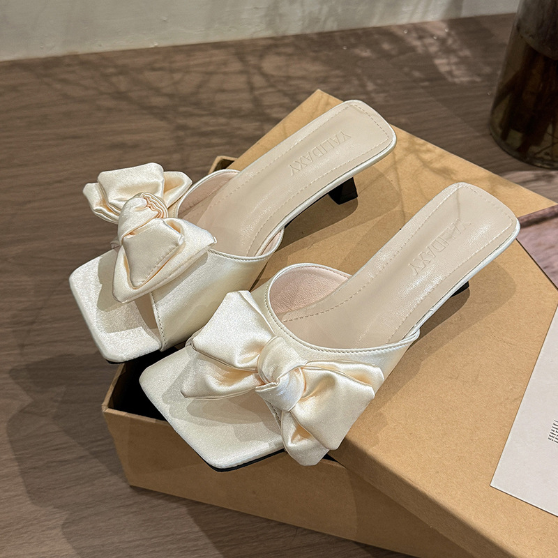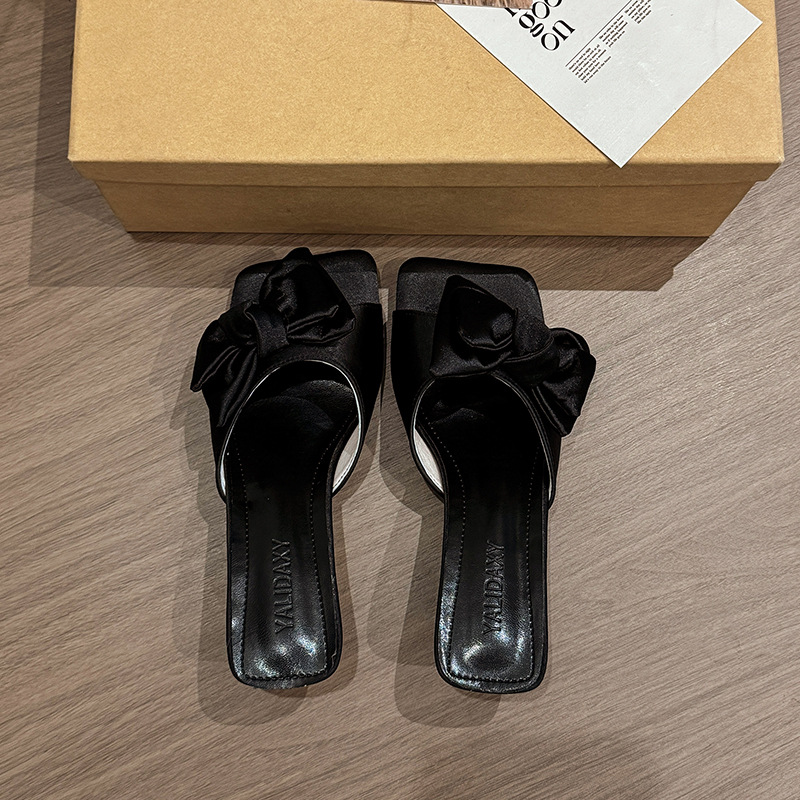 2025 여름 새로운 새틴 대형 활 슬라이드 신발 오픈 발가락 얇은 낮은 뒤꿈치 샌들 및 슬리퍼 스타일