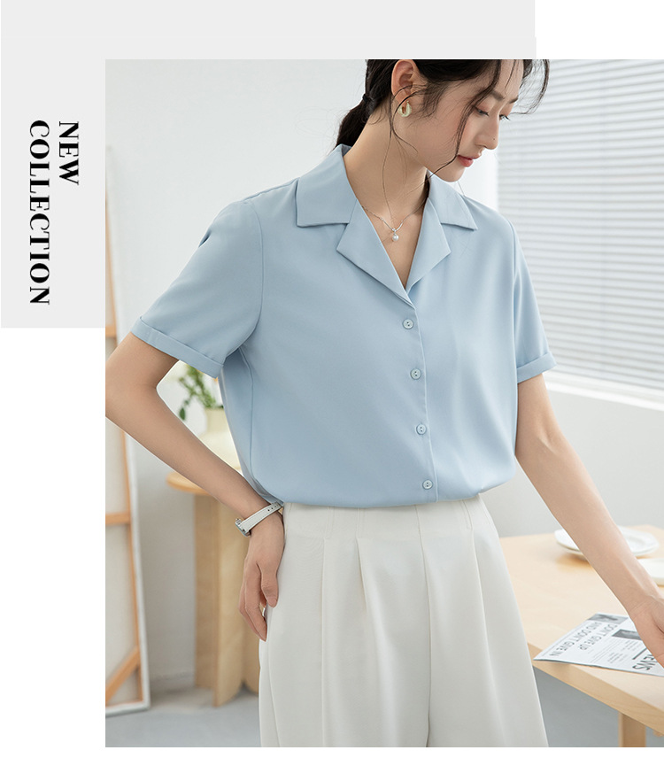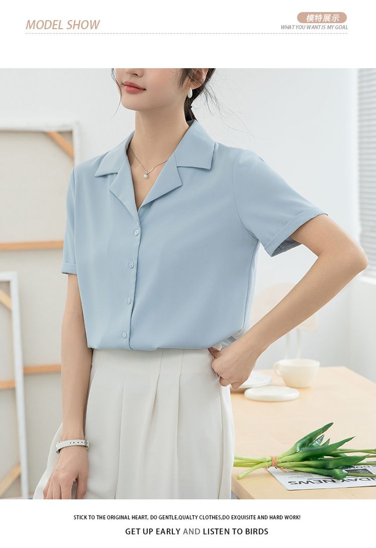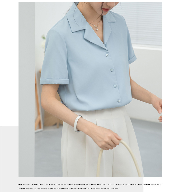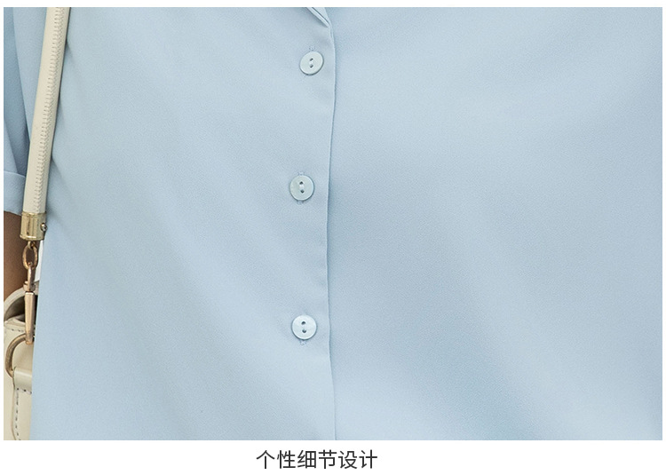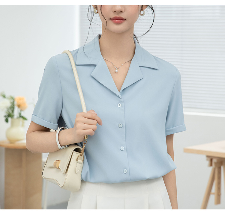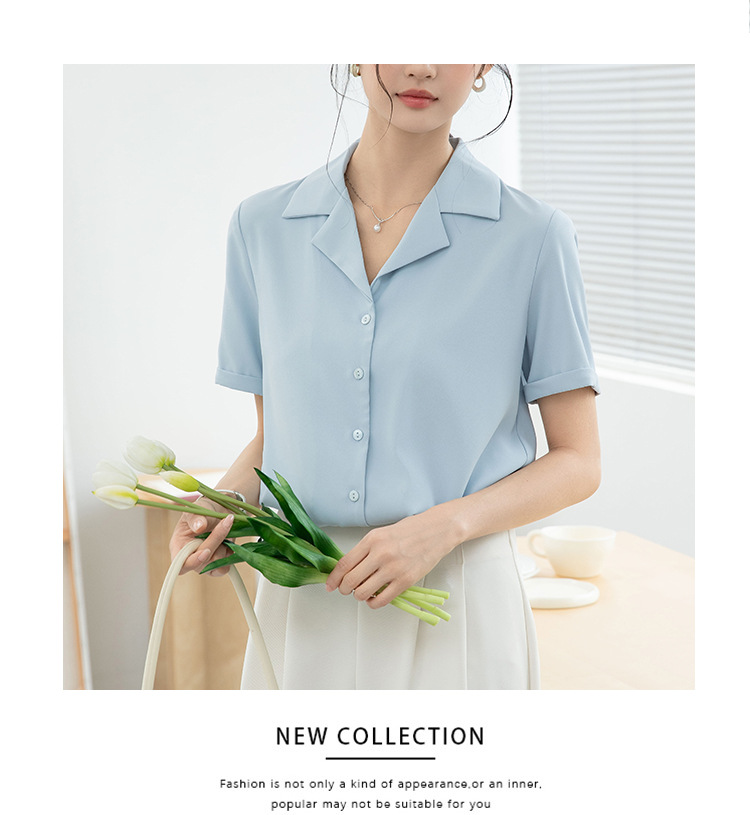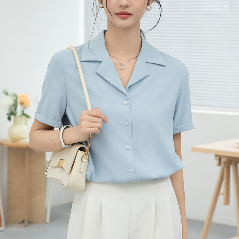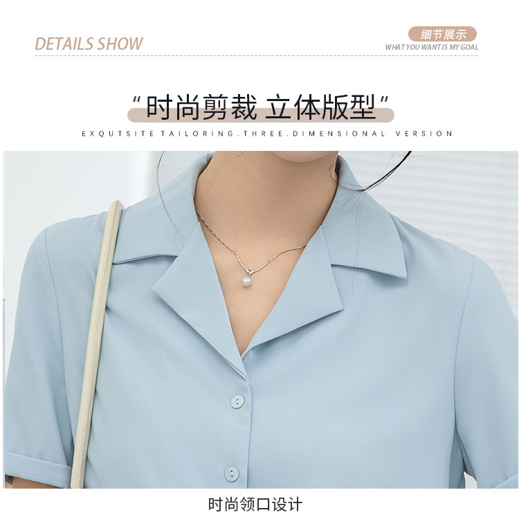 리얼 샷 뉴 블루 반팔 셔츠 여자 리틀 세트 칼라 프로 통근 시폰 인터뷰 탑