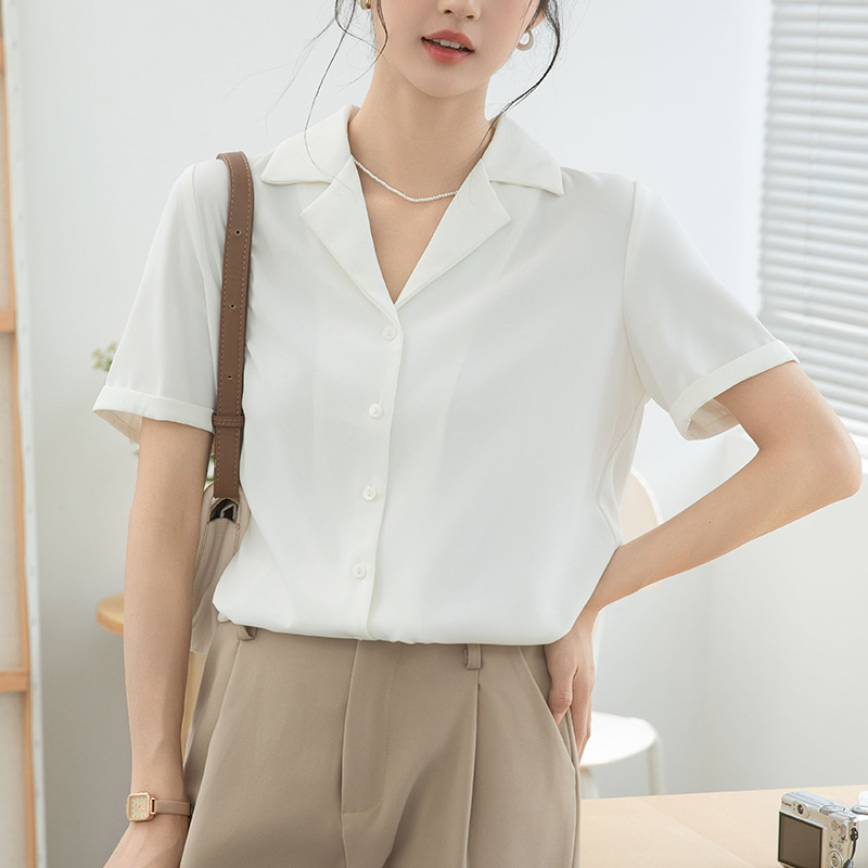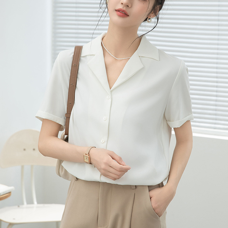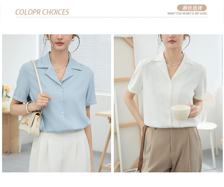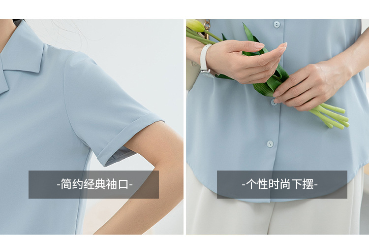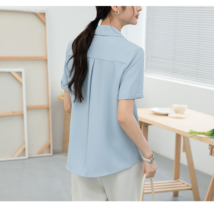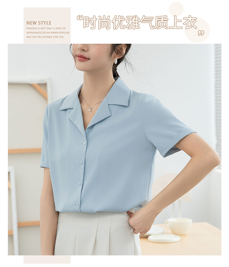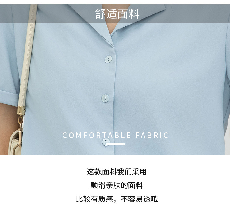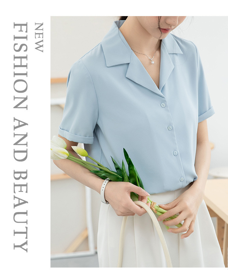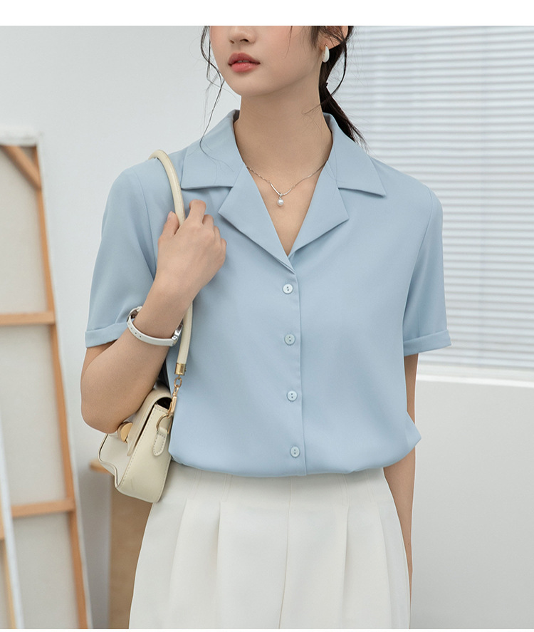 리얼 샷 뉴 블루 반팔 셔츠 여자 리틀 세트 칼라 프로 통근 시폰 인터뷰 탑