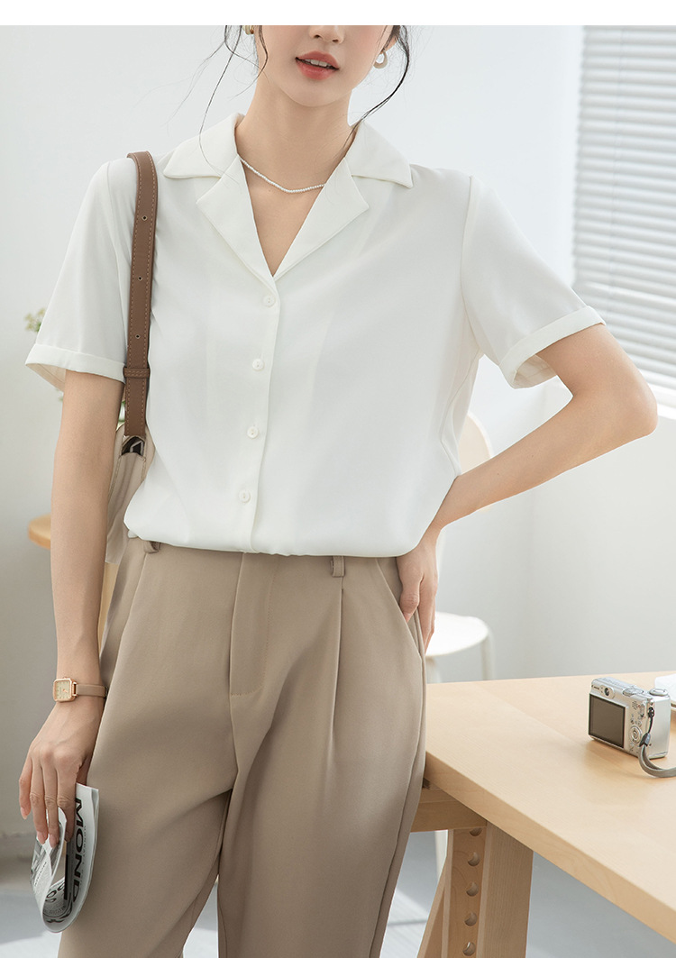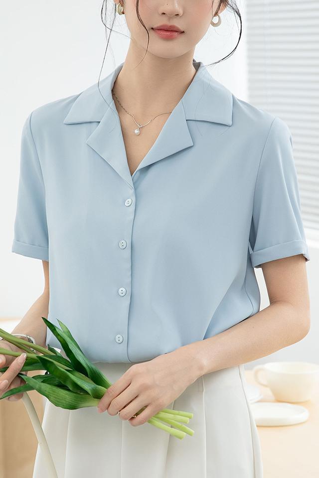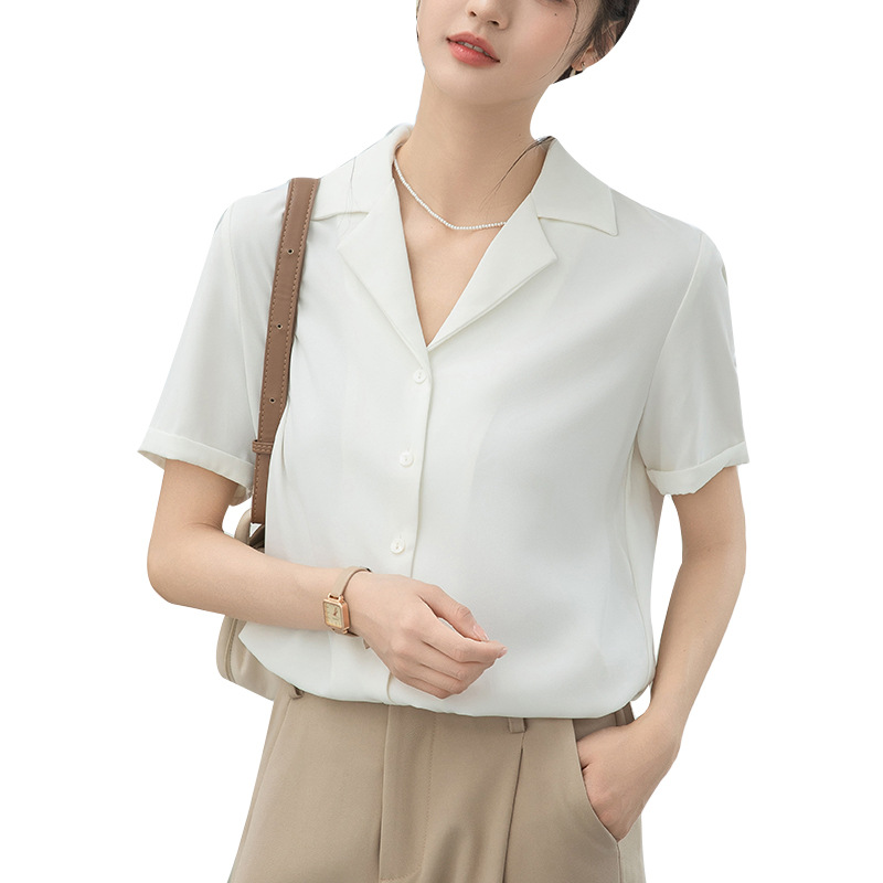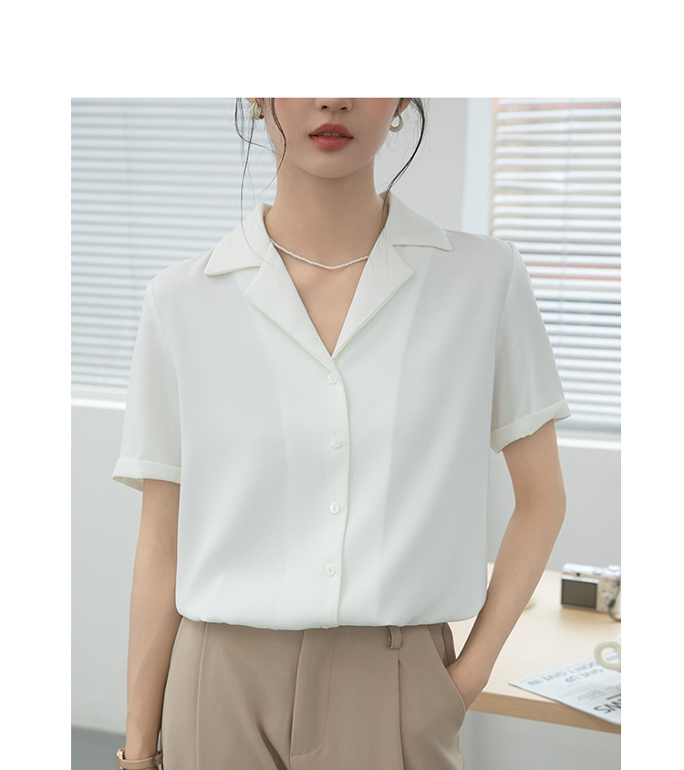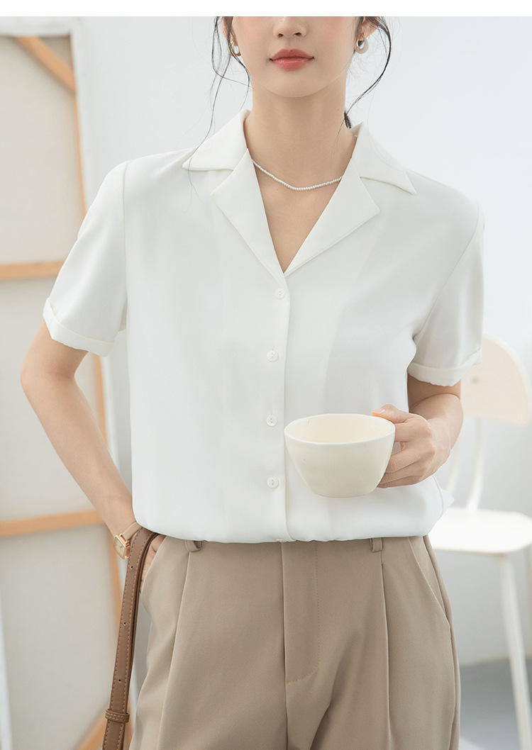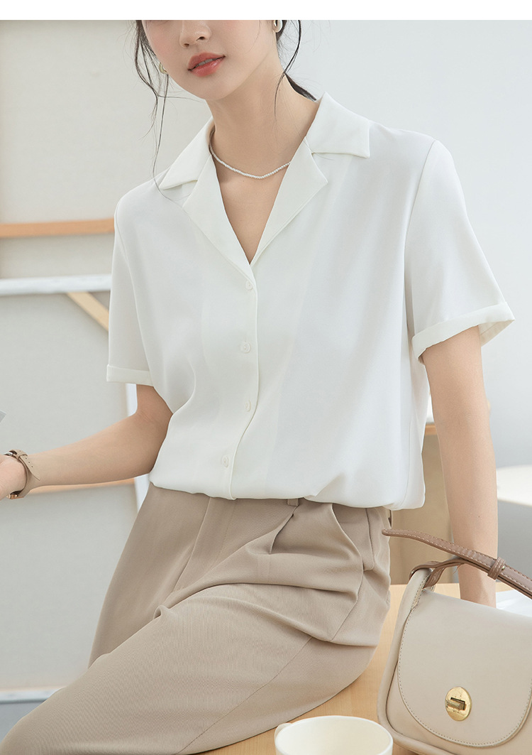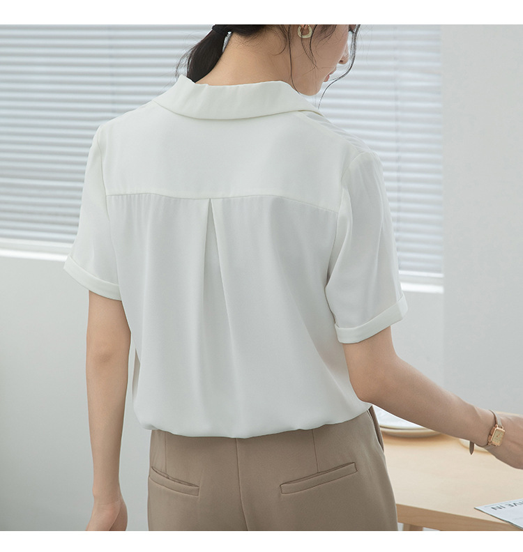 리얼 샷 뉴 블루 반팔 셔츠 여자 리틀 세트 칼라 프로 통근 시폰 인터뷰 탑