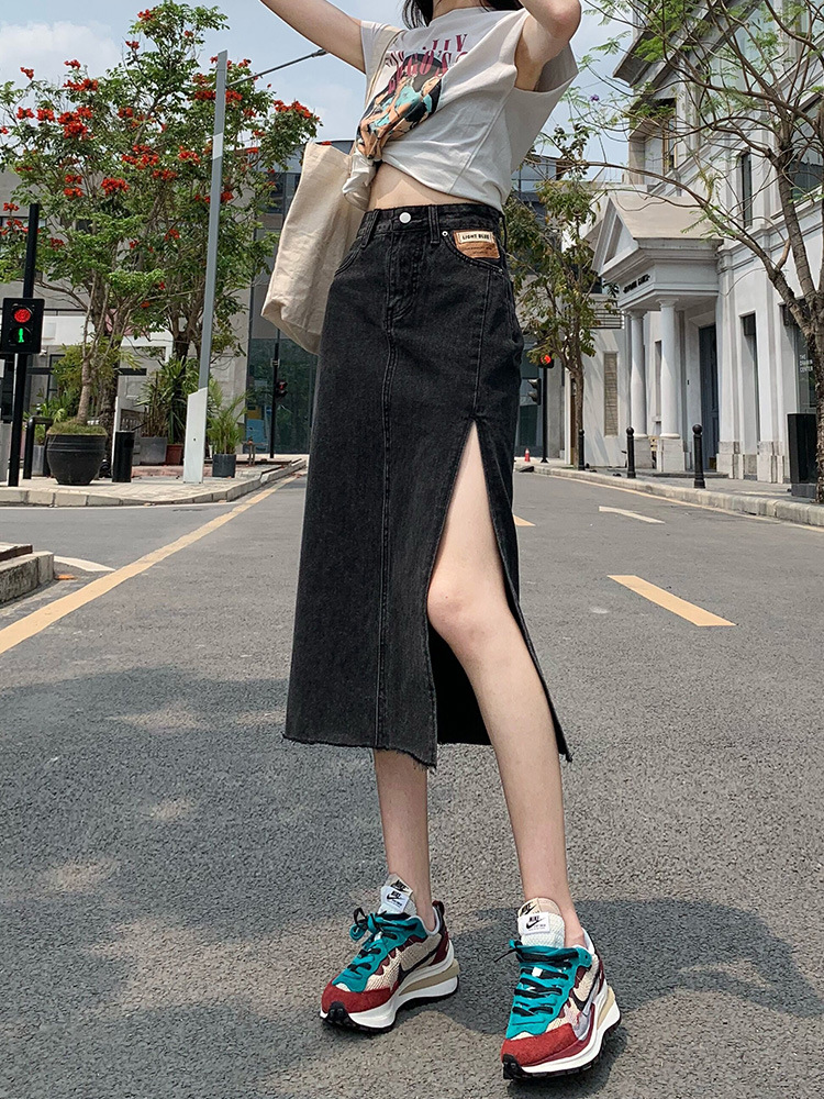 플러스 사이즈 뚱뚱한 mm 초가을 블랙 데님 스커트 여성스러운 봄 여름 하이 웨이스트 슬리밍 슬릿 중간 길이 a 라인 스커트스토어 가기