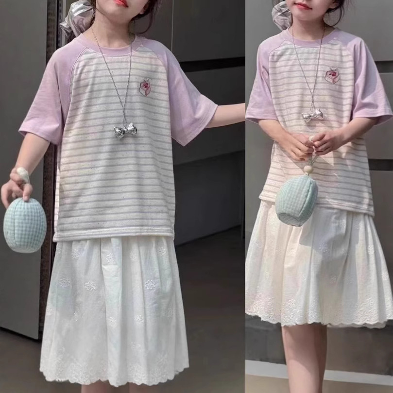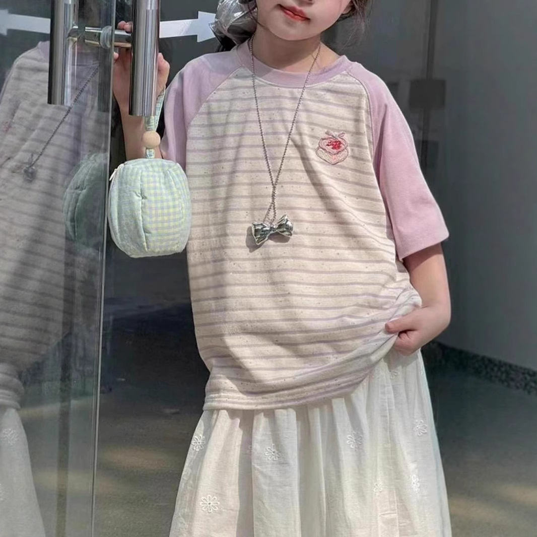 소녀 여름 코튼 스트라이프 반팔 티셔츠 2025 새로운 라운드 넥 릭백 반소매 캐주얼 탑인 어린 소녀 용스토어 가기