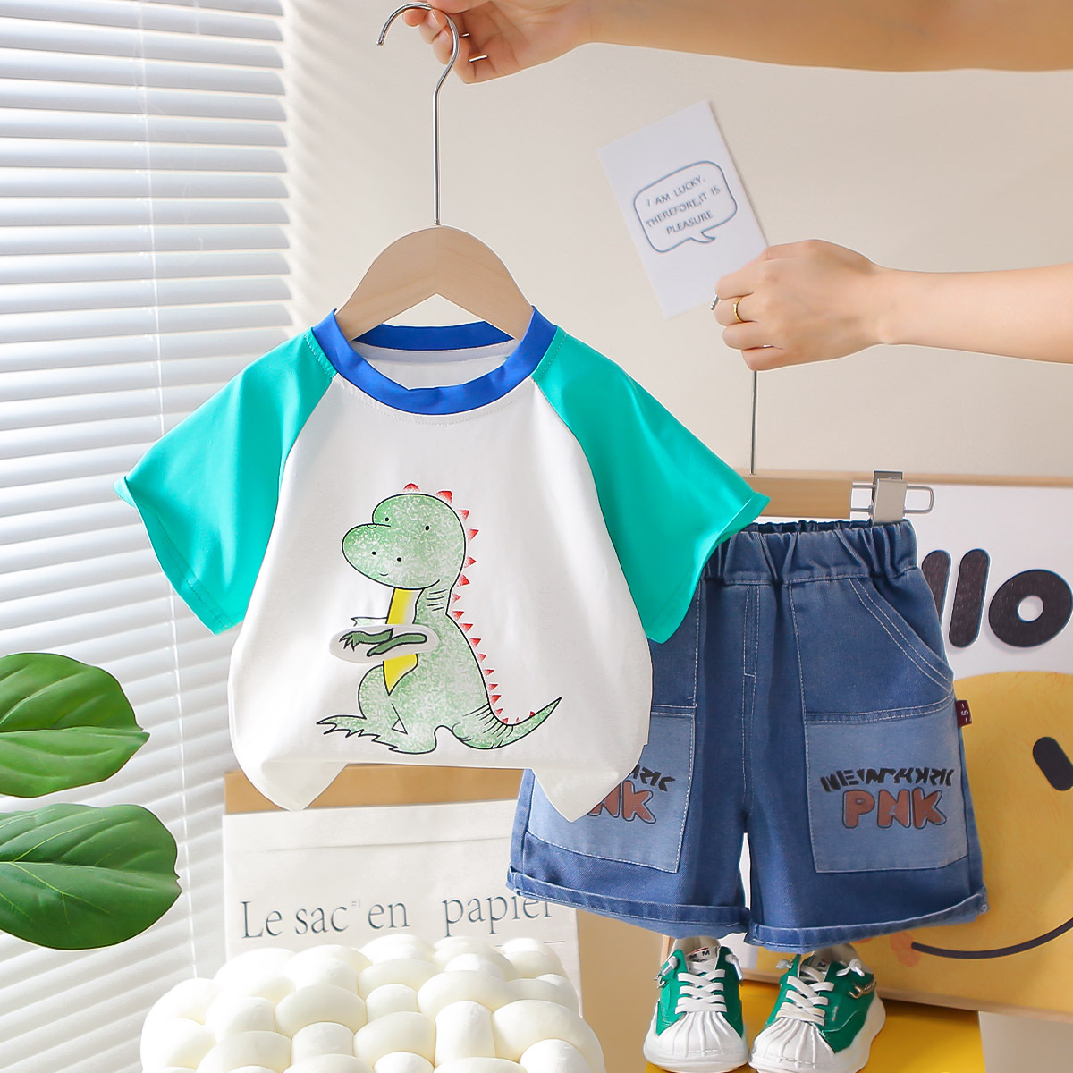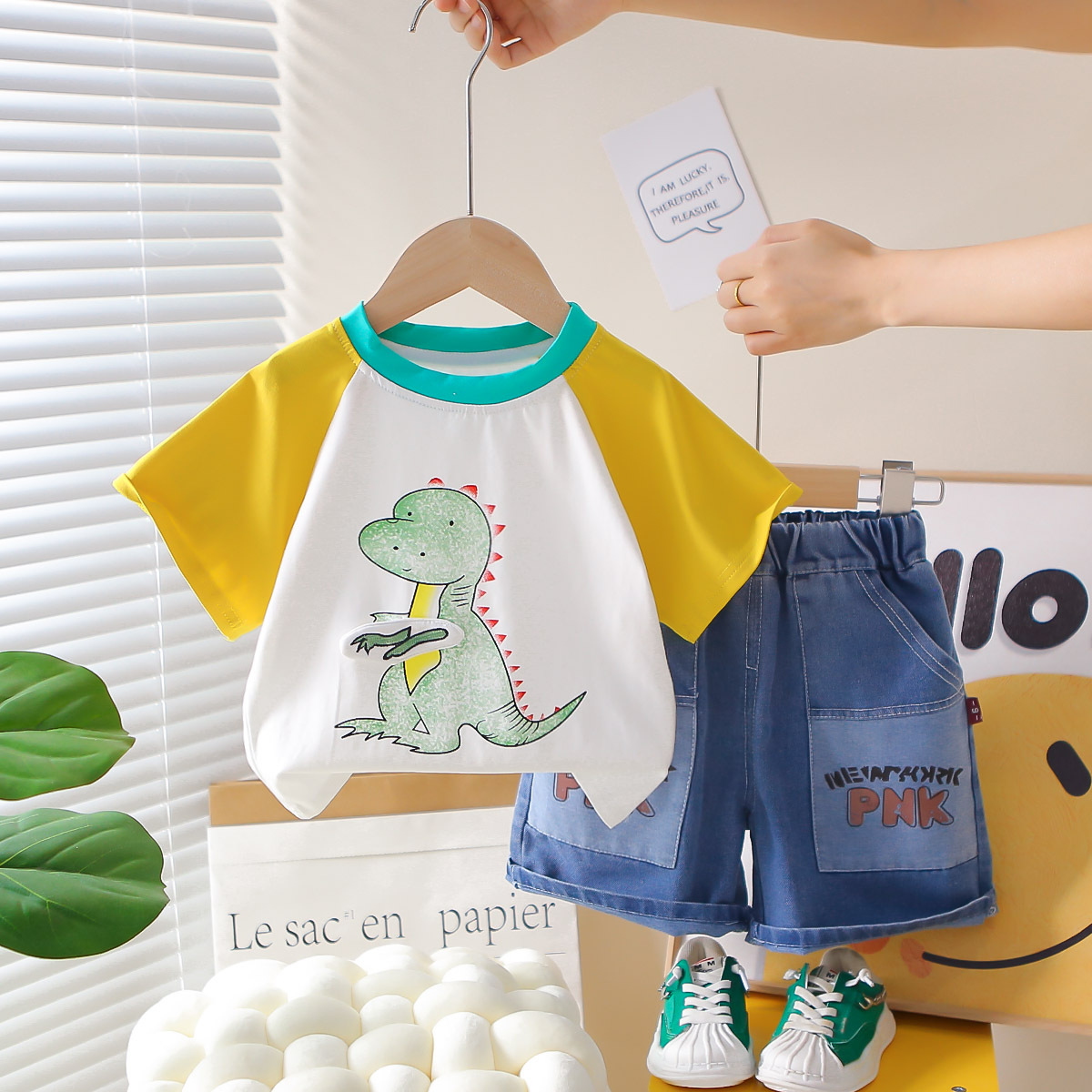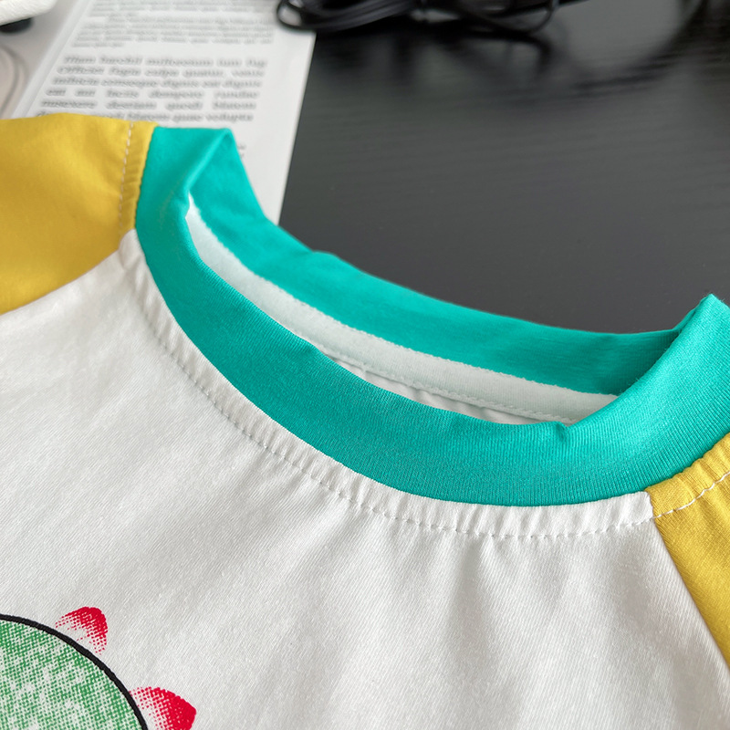 한국 스타일 여름 새로운 패션 서양식 공룡 크루 넥 반팔 소년 아기 유행 투피스 세트 어린 소년을위한 아동복스토어 가기
