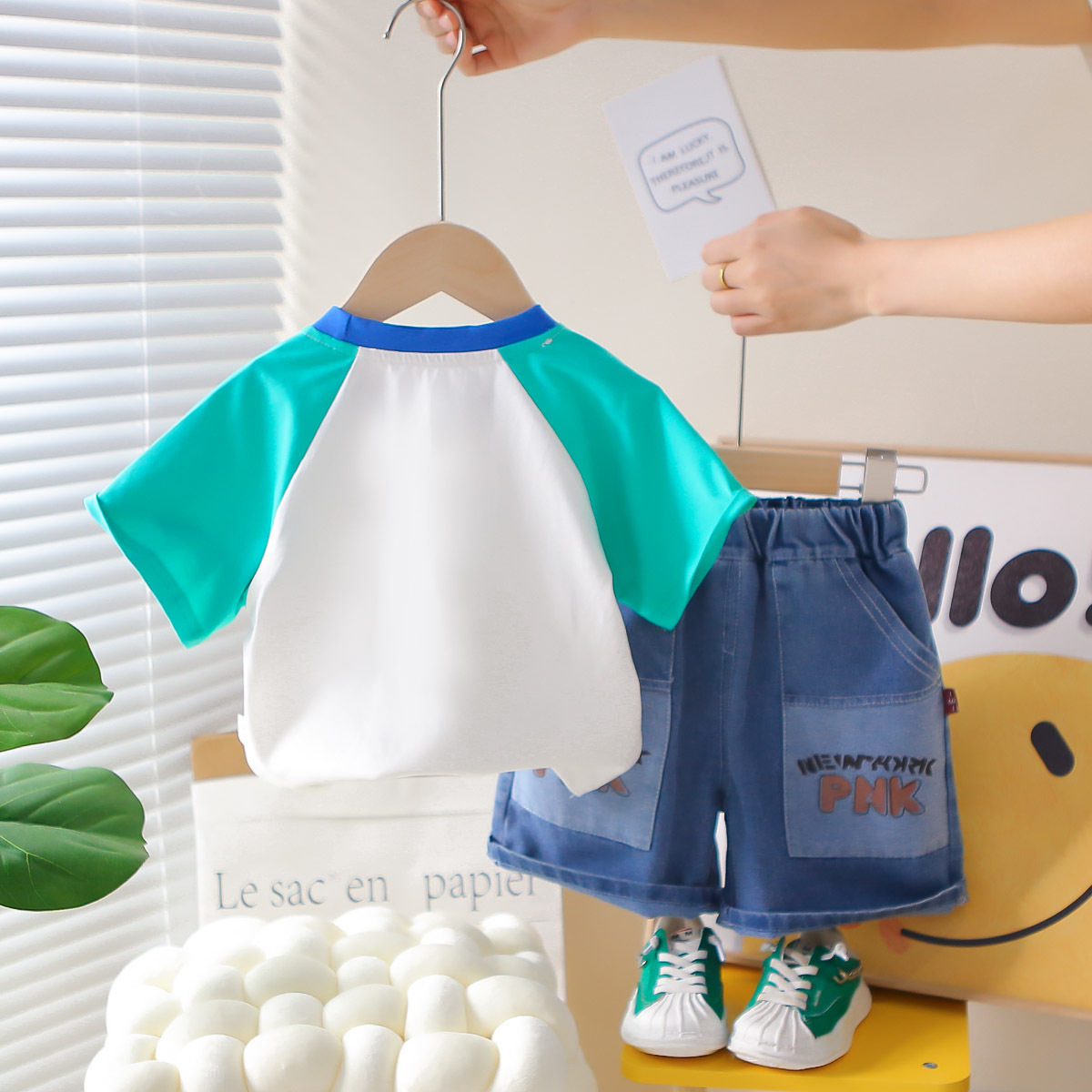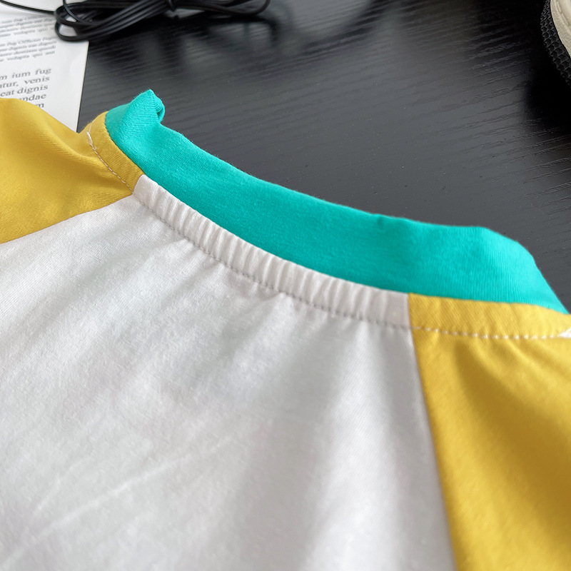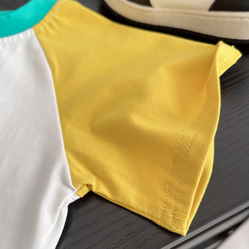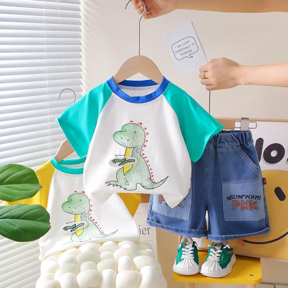 한국 스타일 여름 새로운 패션 서양식 공룡 크루 넥 반팔 소년 아기 유행 투피스 세트 어린 소년을위한 아동복스토어 가기