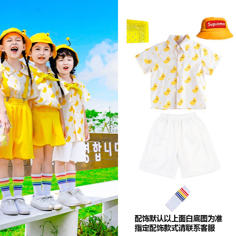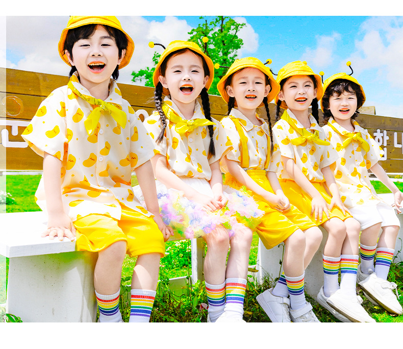 • A685 노란색 반팔 셔츠 + B24 노란색 반바지 + 노란색 사각 스카프 + 무지개 양말 + 노란색 어부 모자
