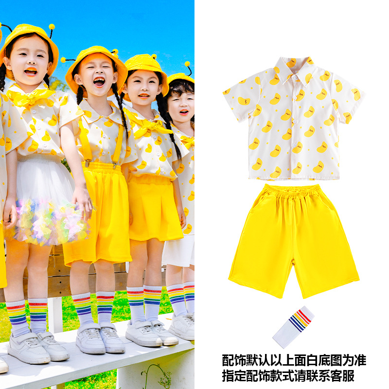 • A685 노란색 반팔 셔츠 + B24 노란색 반바지 + 노란색 멜빵 + 무지개 양말
