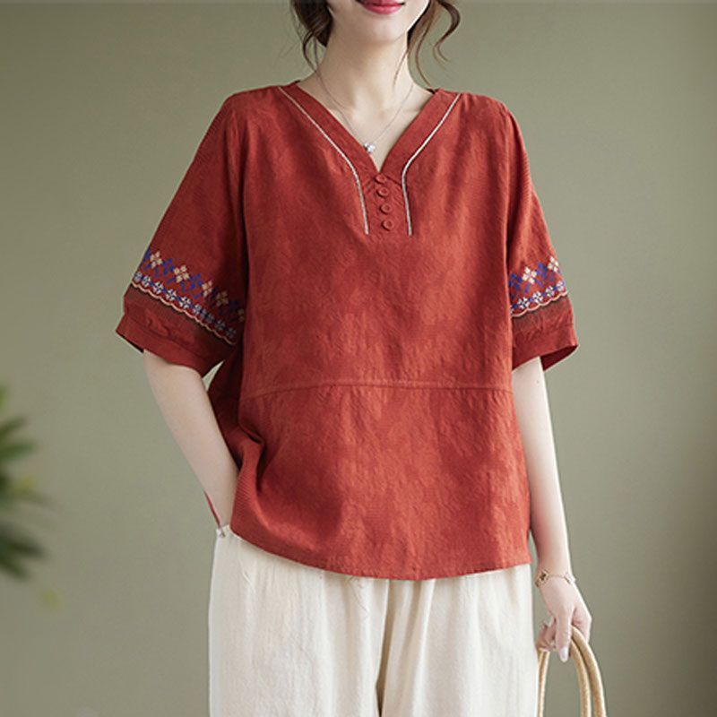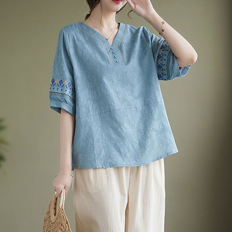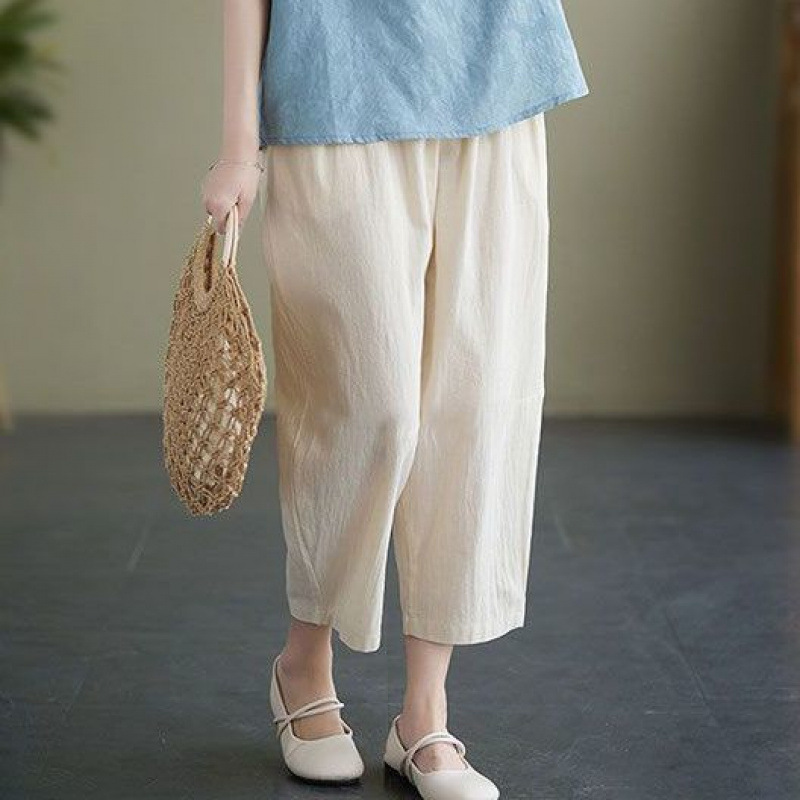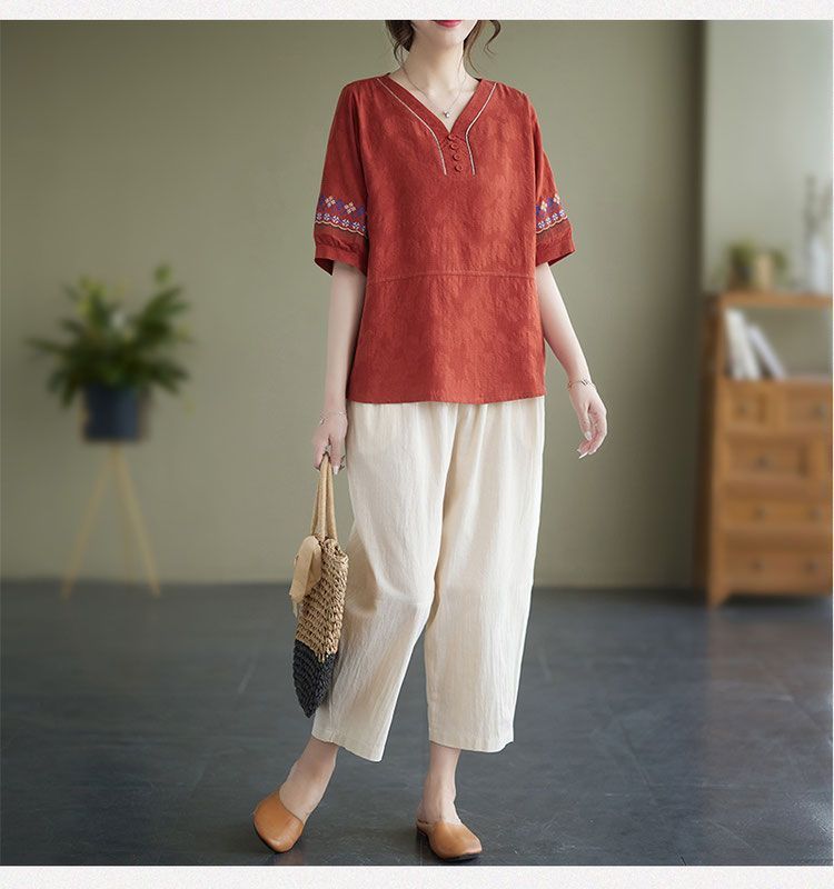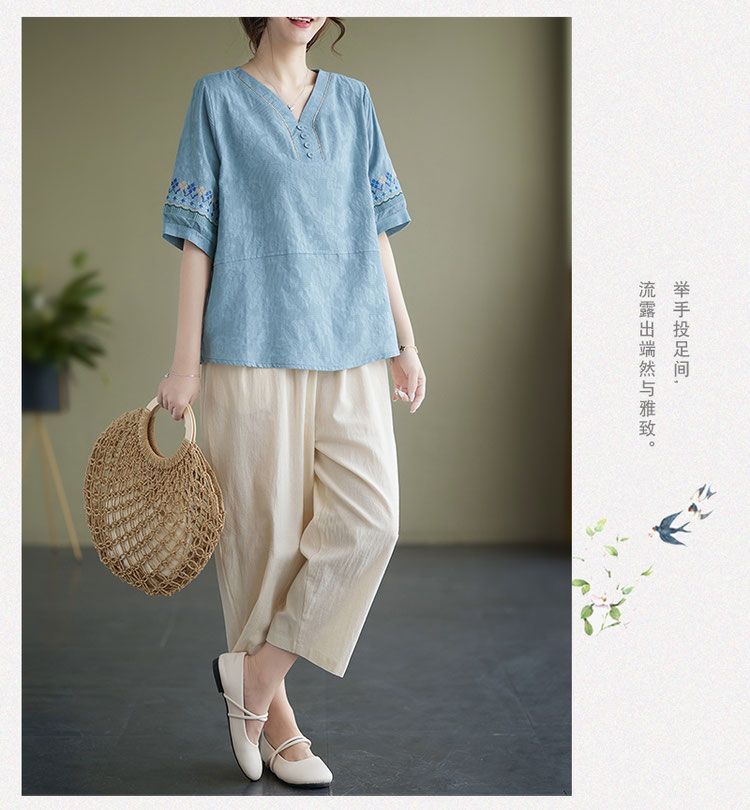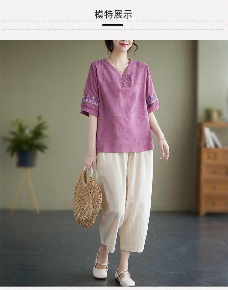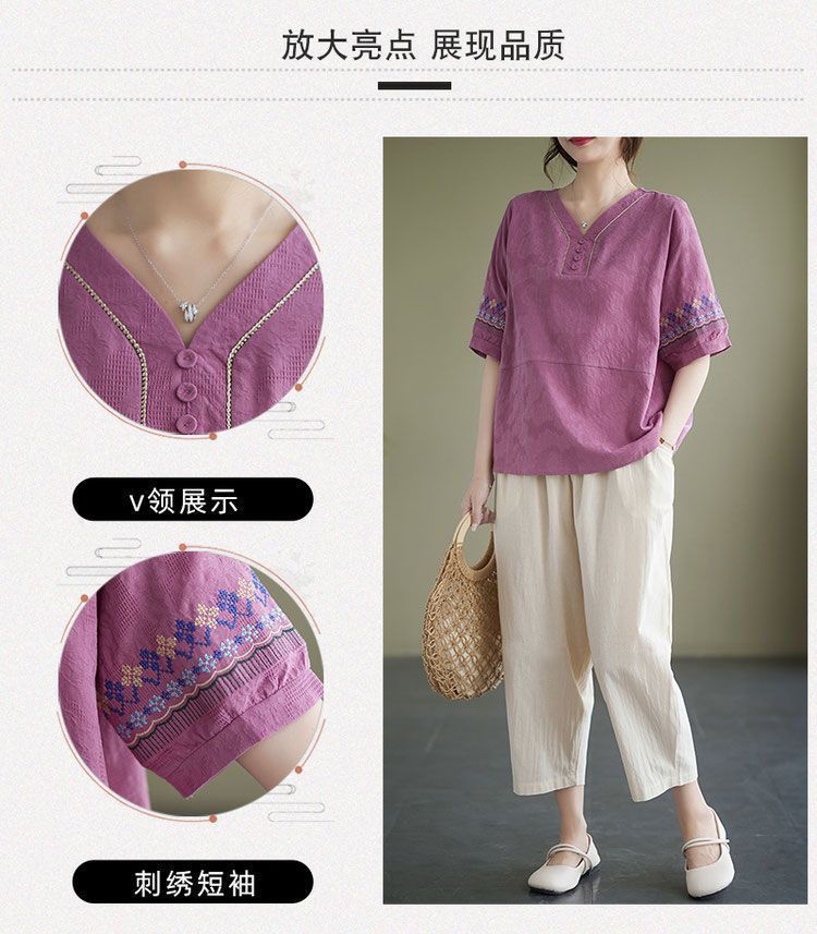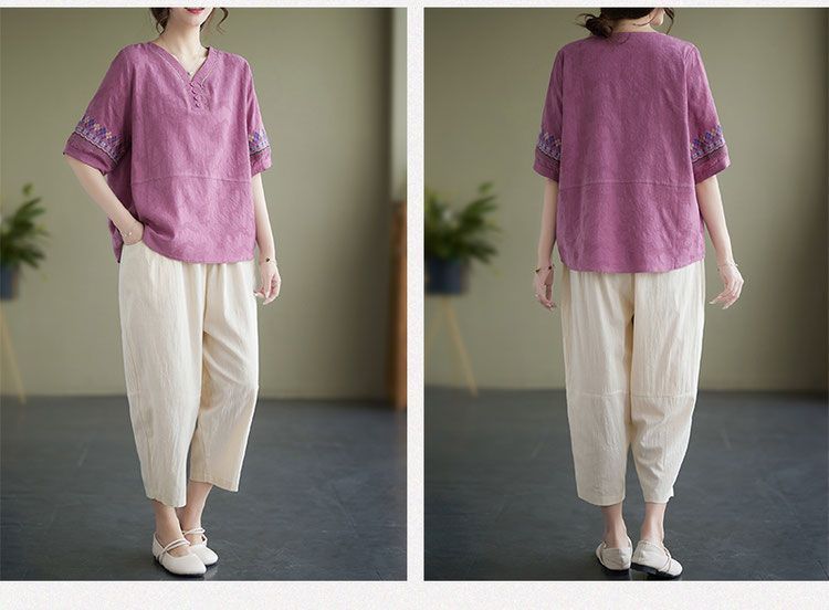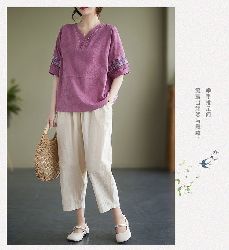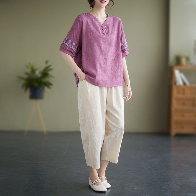 빈티지 민족 여름 패션 어머니 코튼 리넨 우아한 느슨한 슬리밍 세트 탑 와이드 다리 바지 투피스 세트