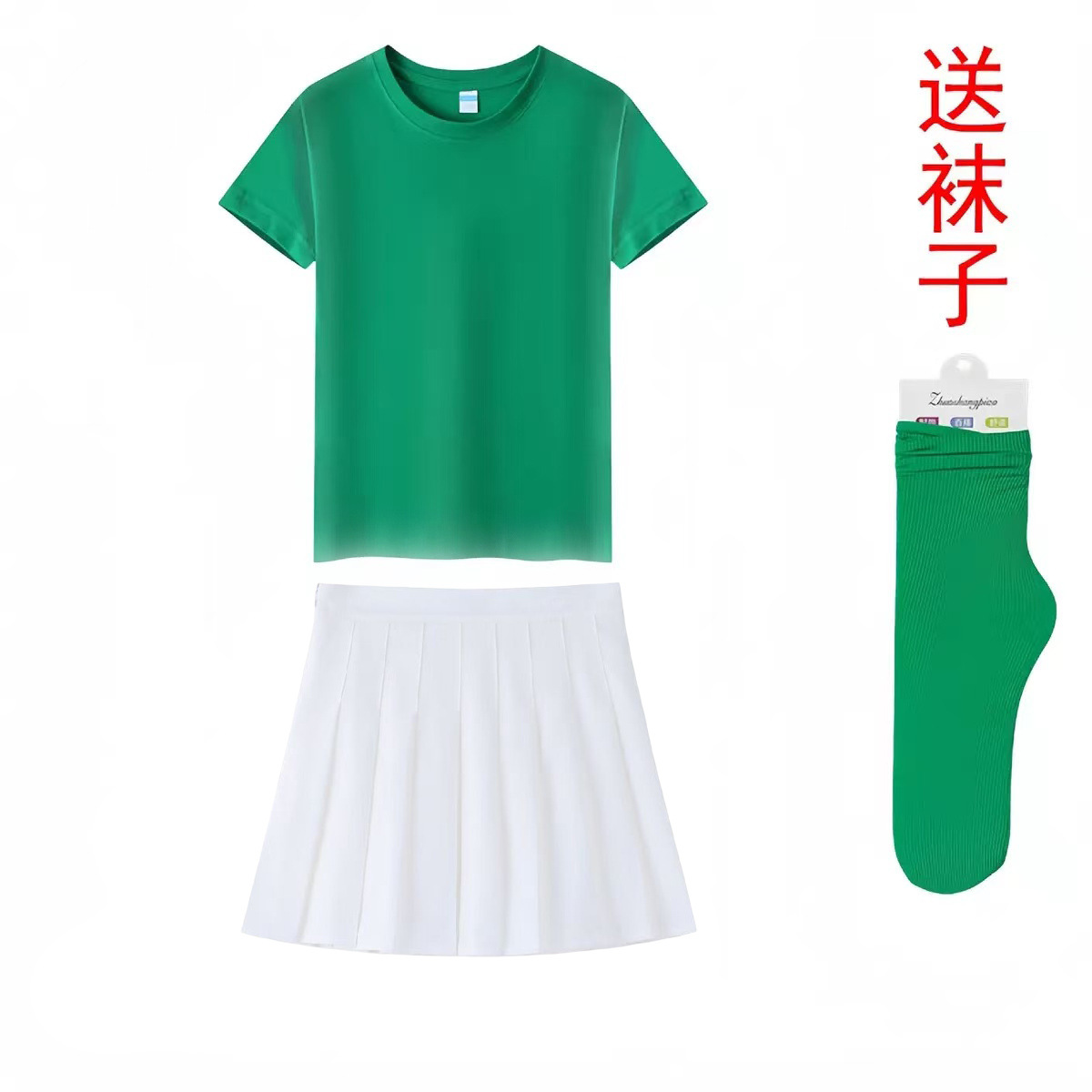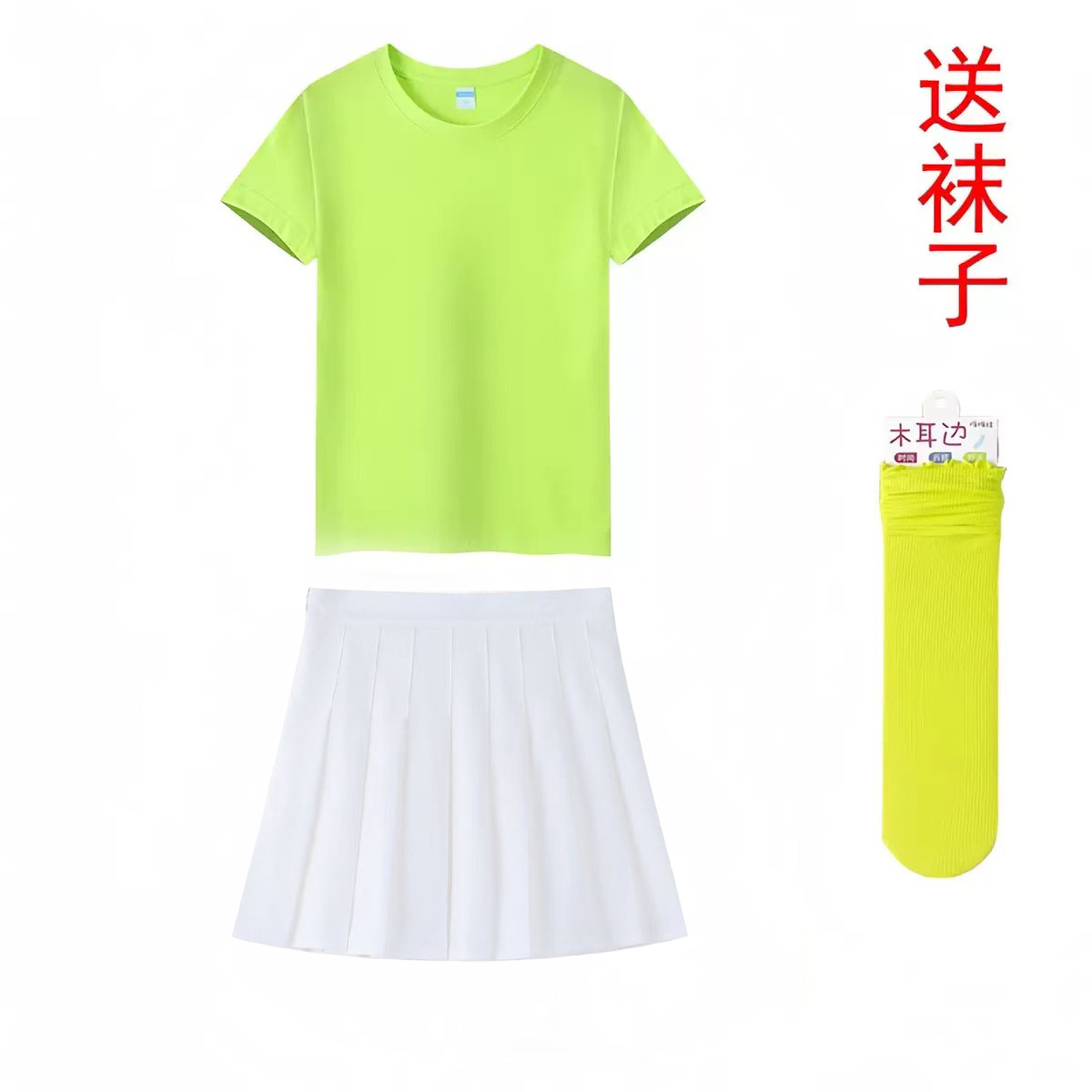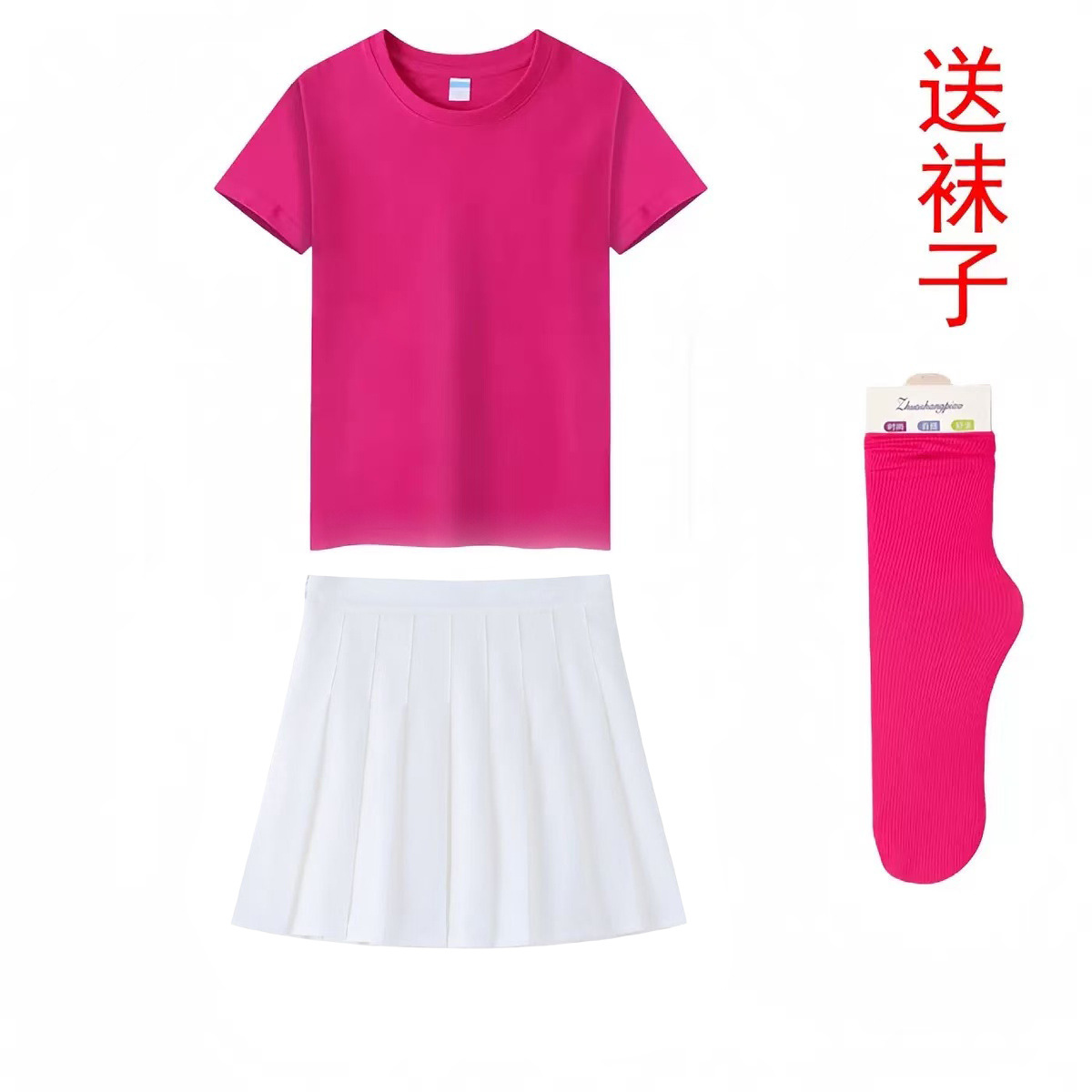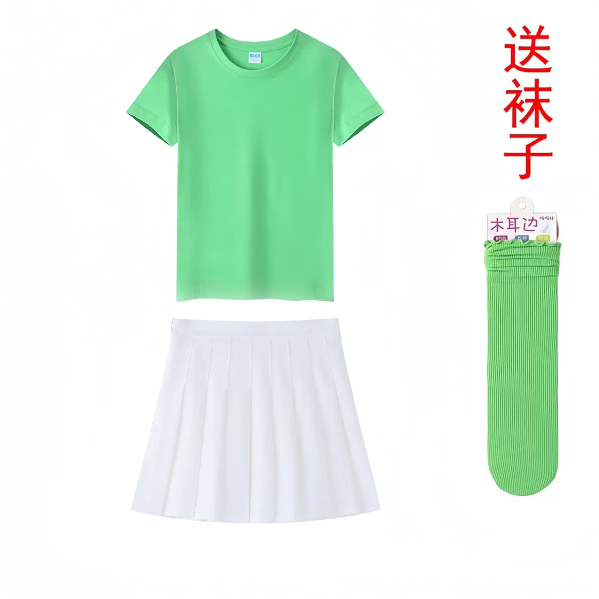 180 캔디 컬러 여성 티셔츠 크루 넥 느슨한 졸업 클래스 소녀 공연 옷 옷 주름 치마 세트