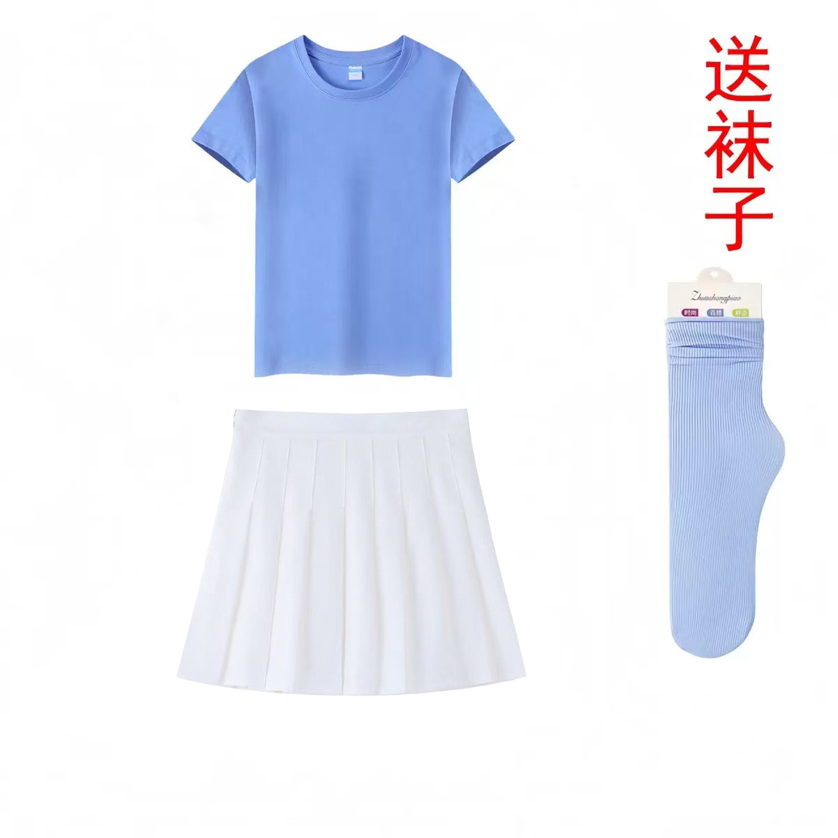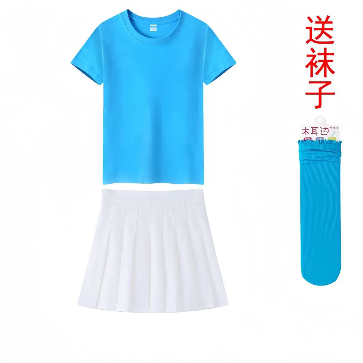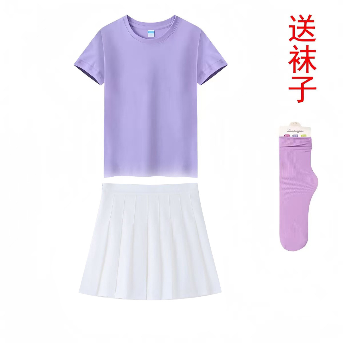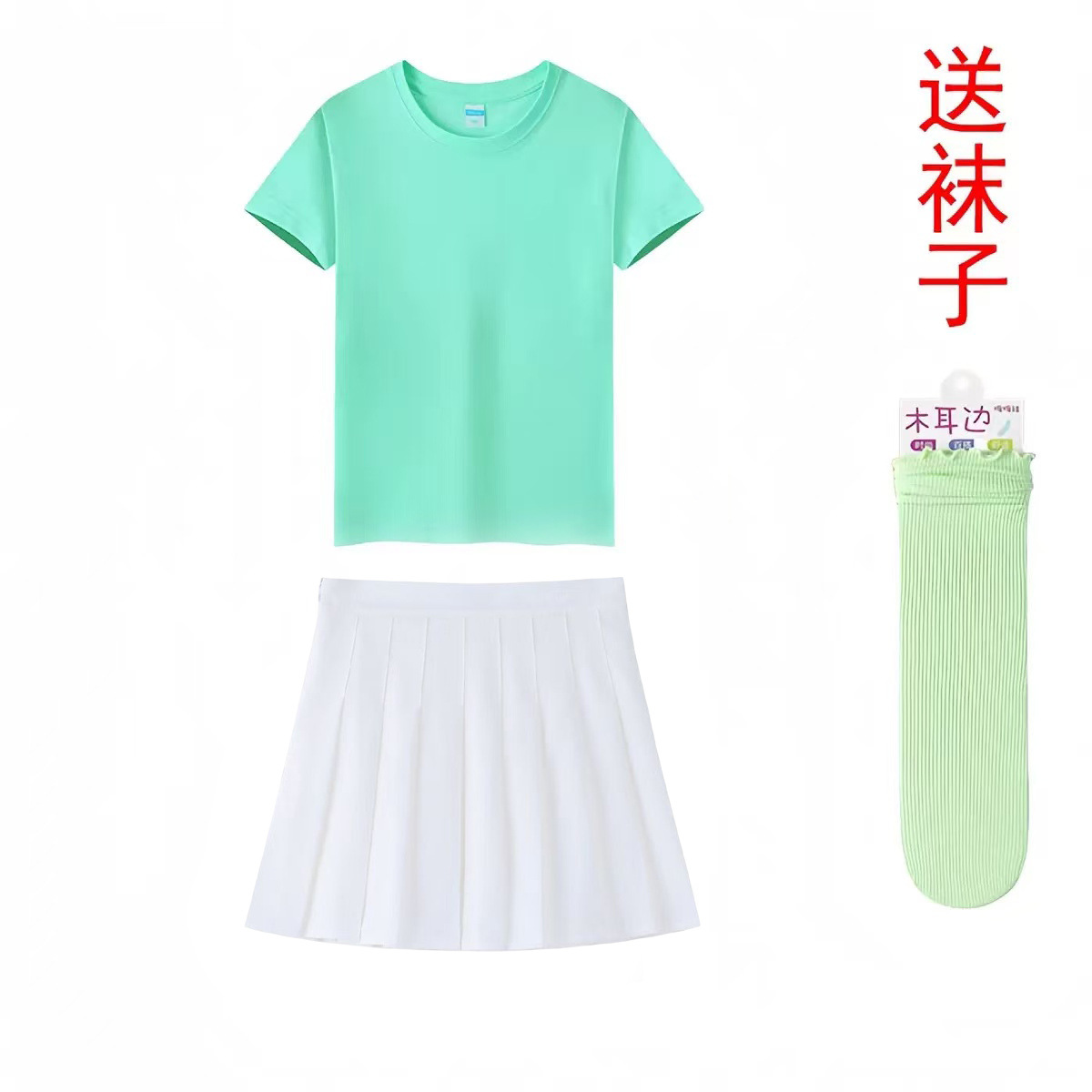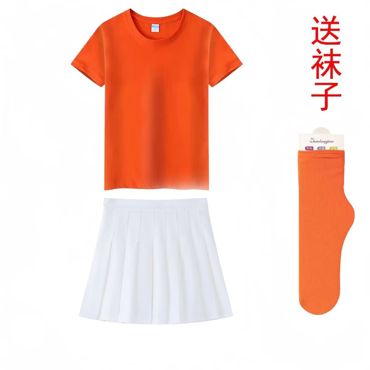180 캔디 컬러 여성 티셔츠 크루 넥 느슨한 졸업 클래스 소녀 공연 옷 옷 주름 치마 세트