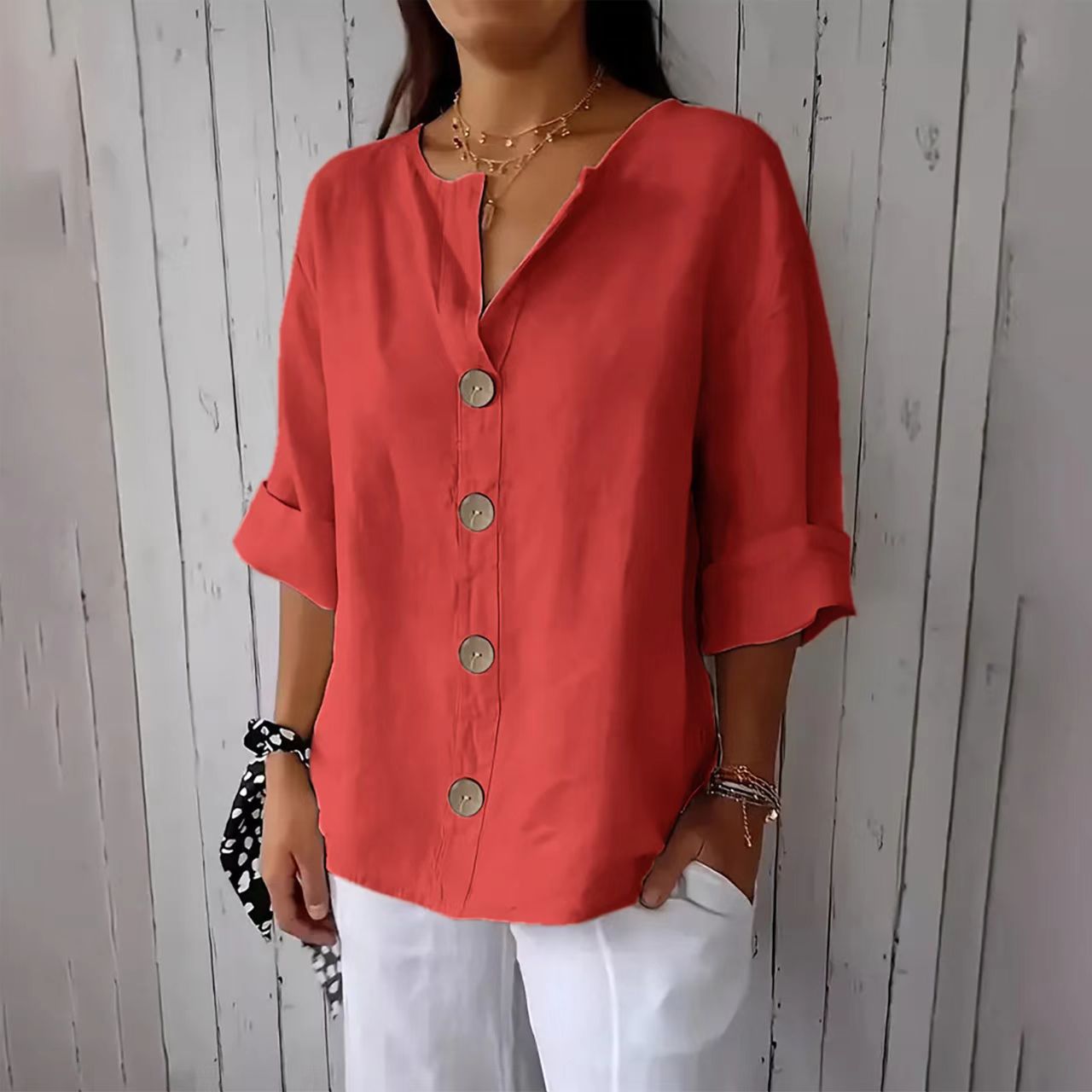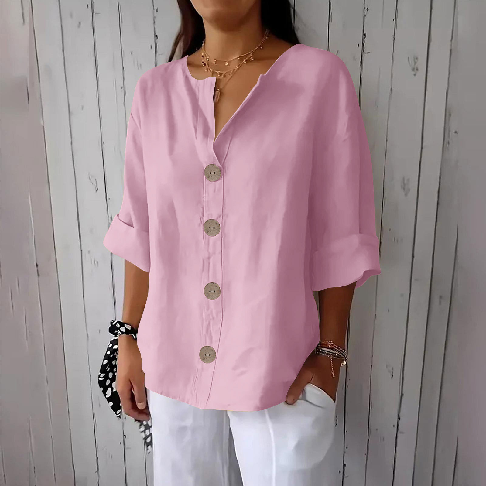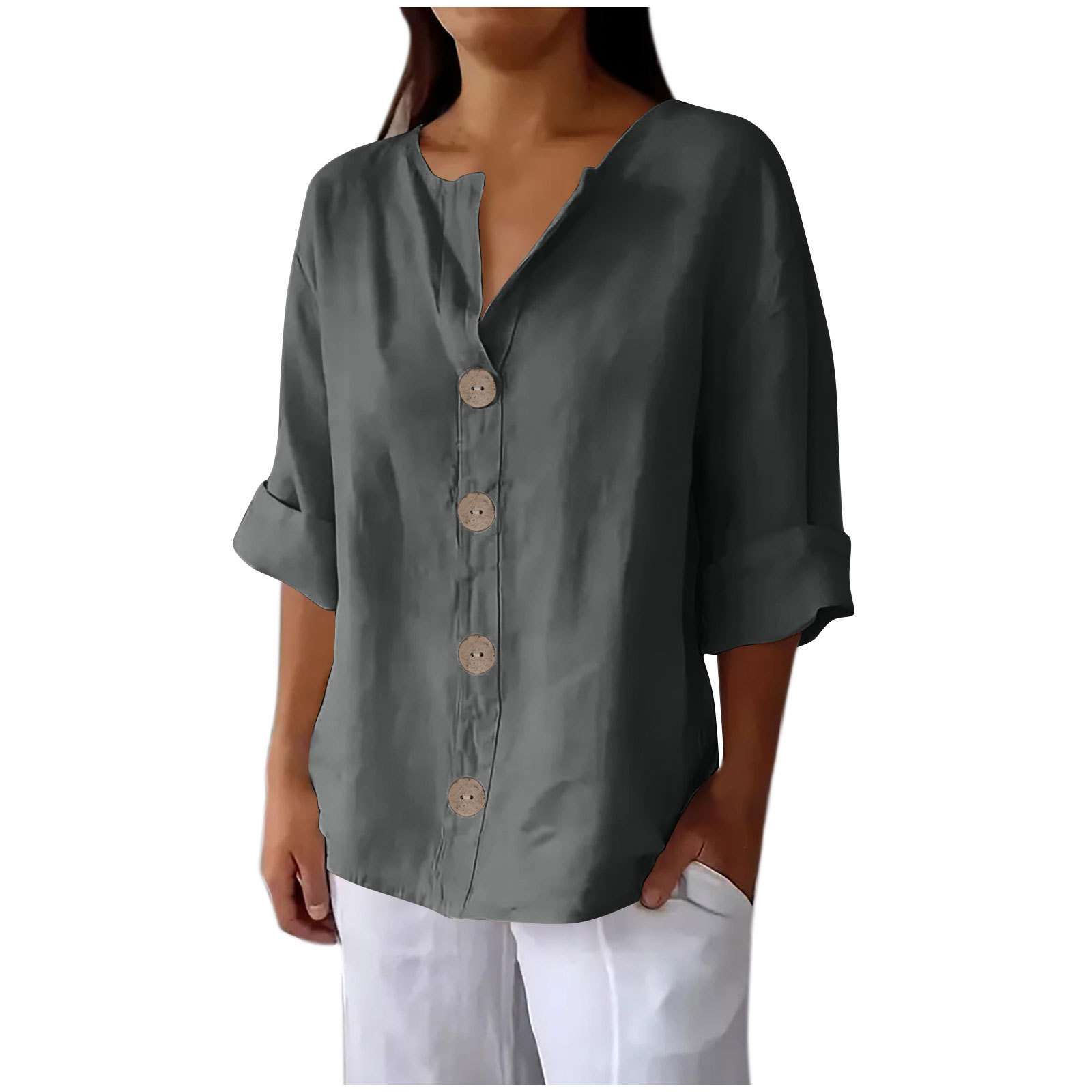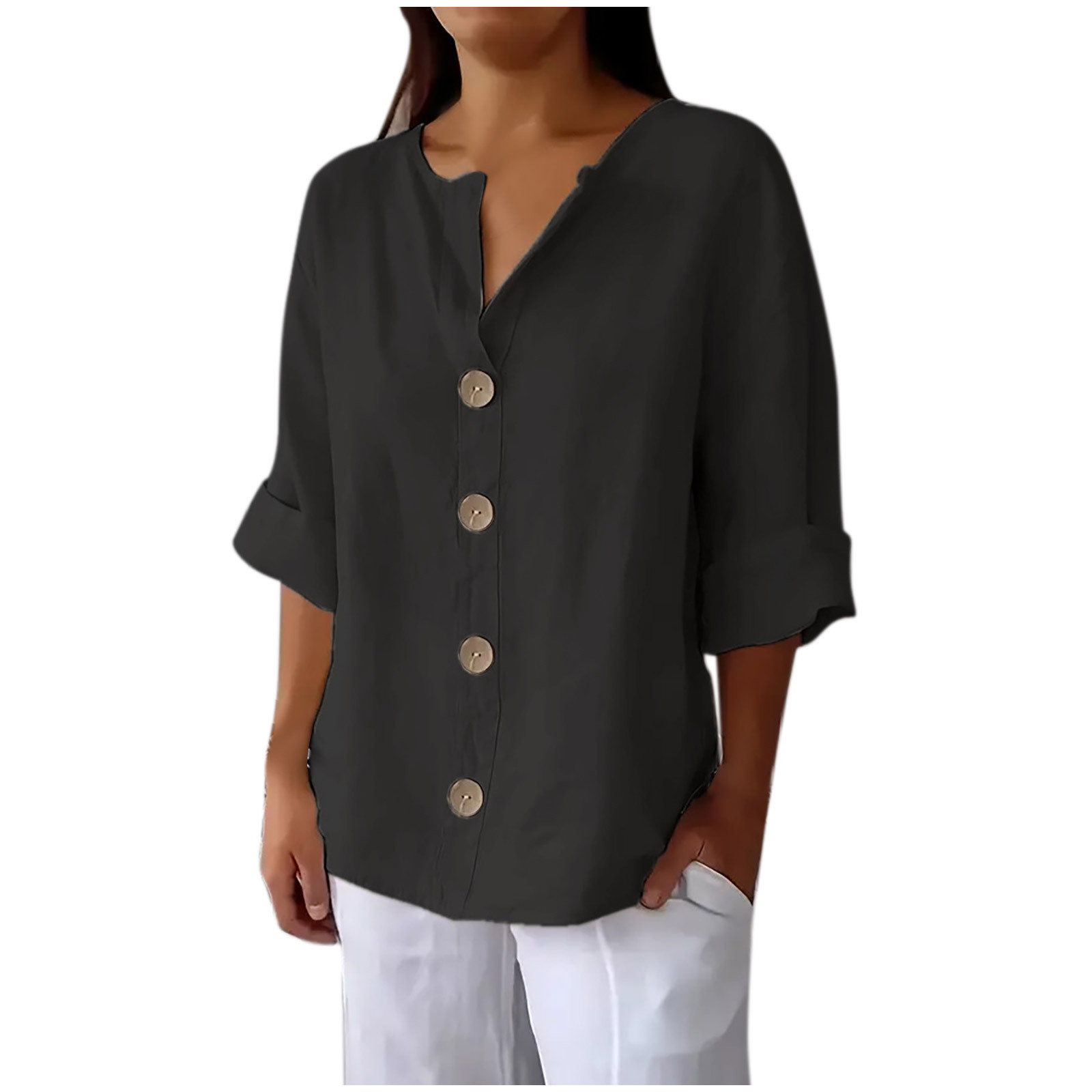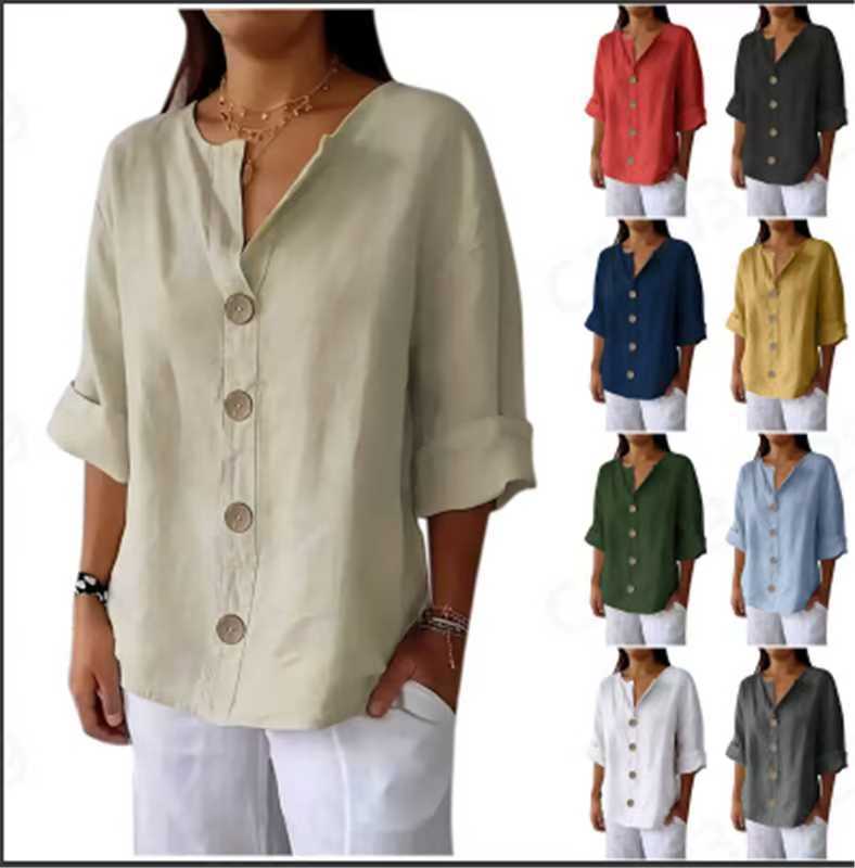 Amazon 유럽과 미국의 v 넥 크로스 보더 셔츠 여성 버튼 반팔 탑 여름 패션 다재다능한 캐주얼 다재다능함