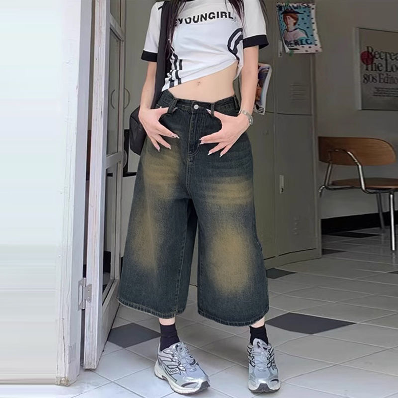 여성을위한 미국 복고풍 하이 스트리트 데님 반바지 여름 새로운 스타일 워시 올드 루즈 핫 소녀 크롭 바지 와이드 레그 바지스토어 가기