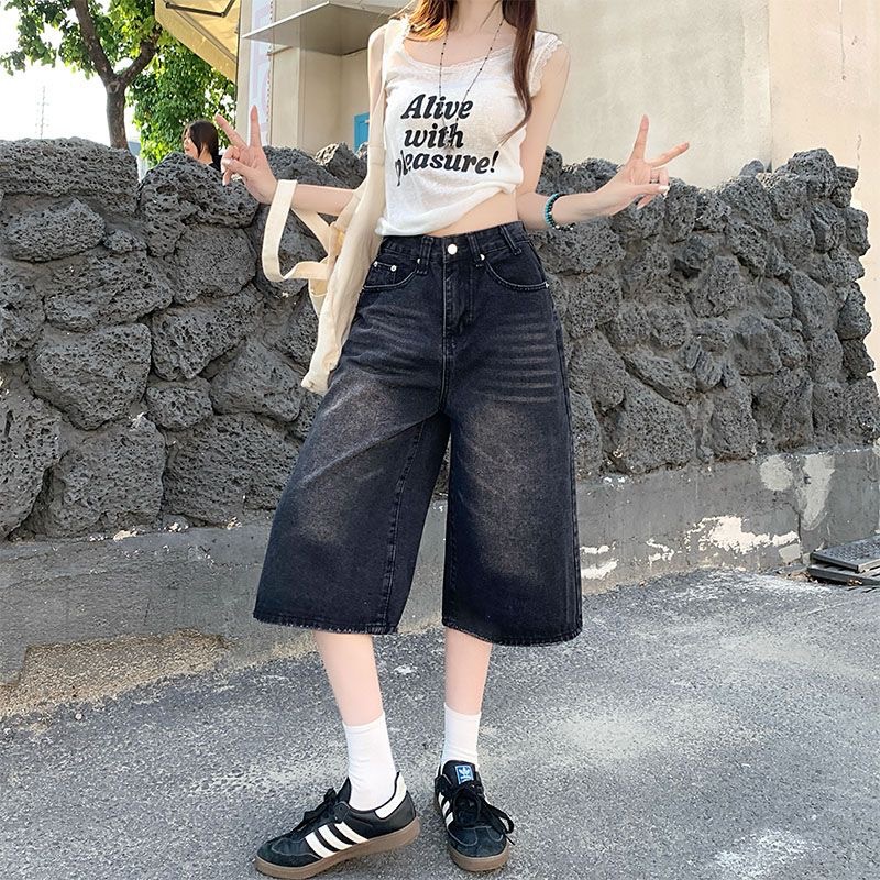 여성을위한 미국 복고풍 하이 스트리트 데님 반바지 여름 새로운 스타일 워시 올드 루즈 핫 소녀 크롭 바지 와이드 레그 바지