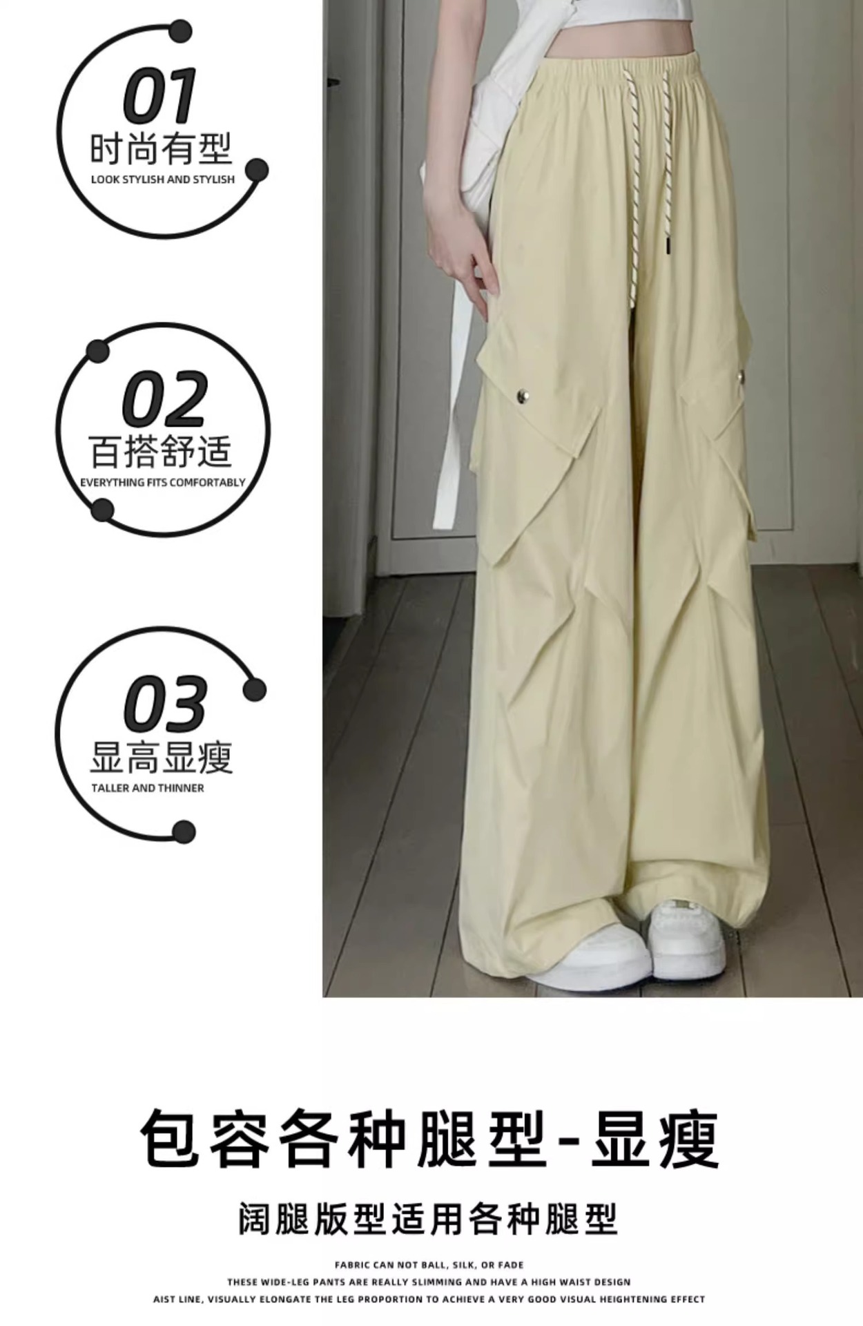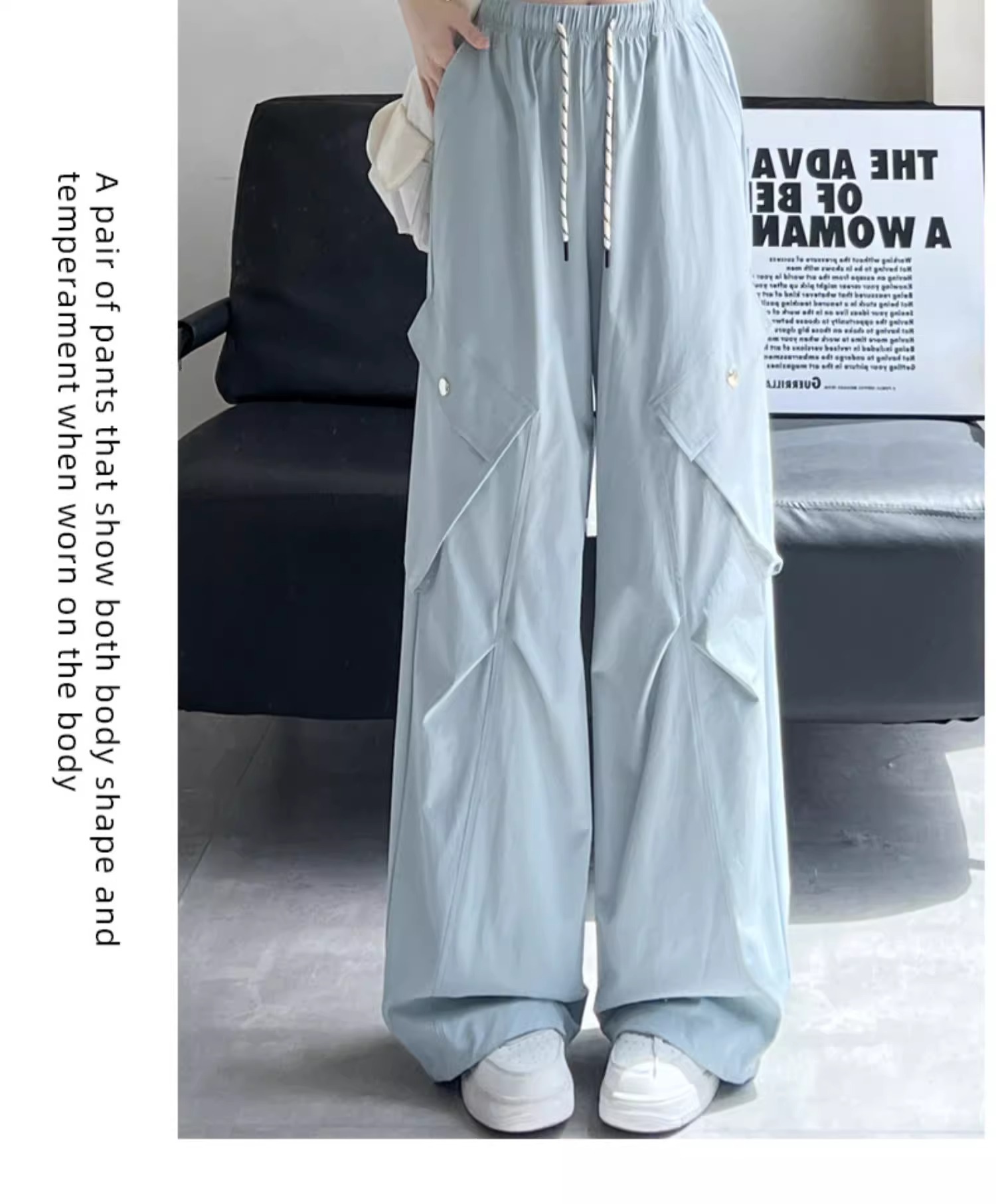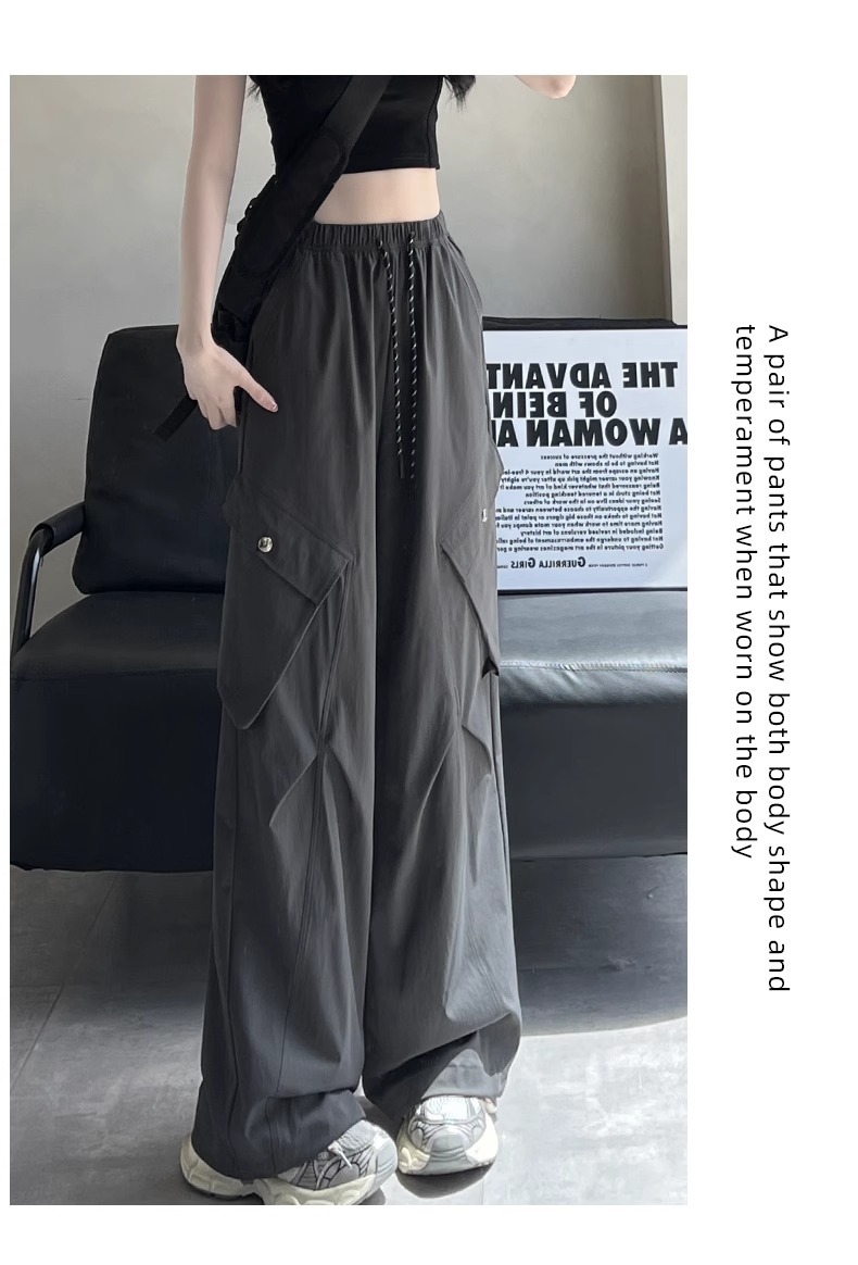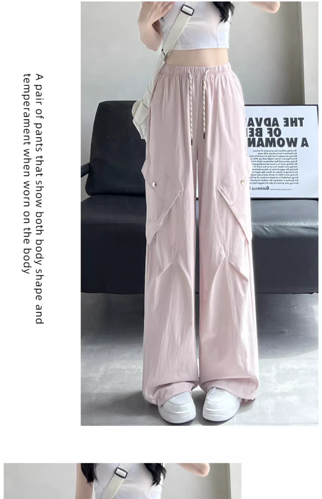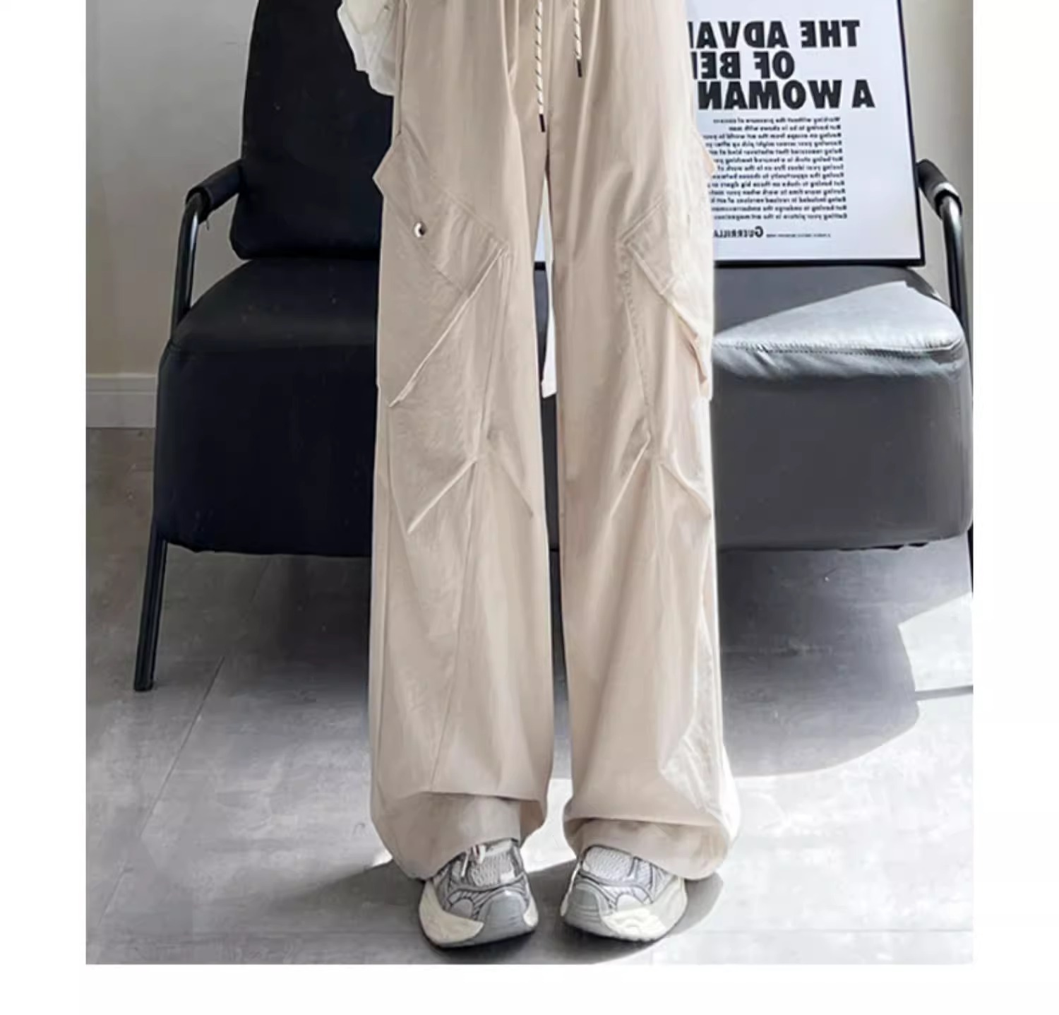 미국 스타일의 대형 포켓 크레인 바지 여성 여름 2025 새로운 높은 허리 슬리밍 휴식 빠른 건조 스포츠 와이드 다리 바지