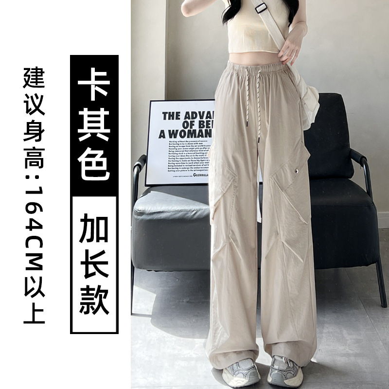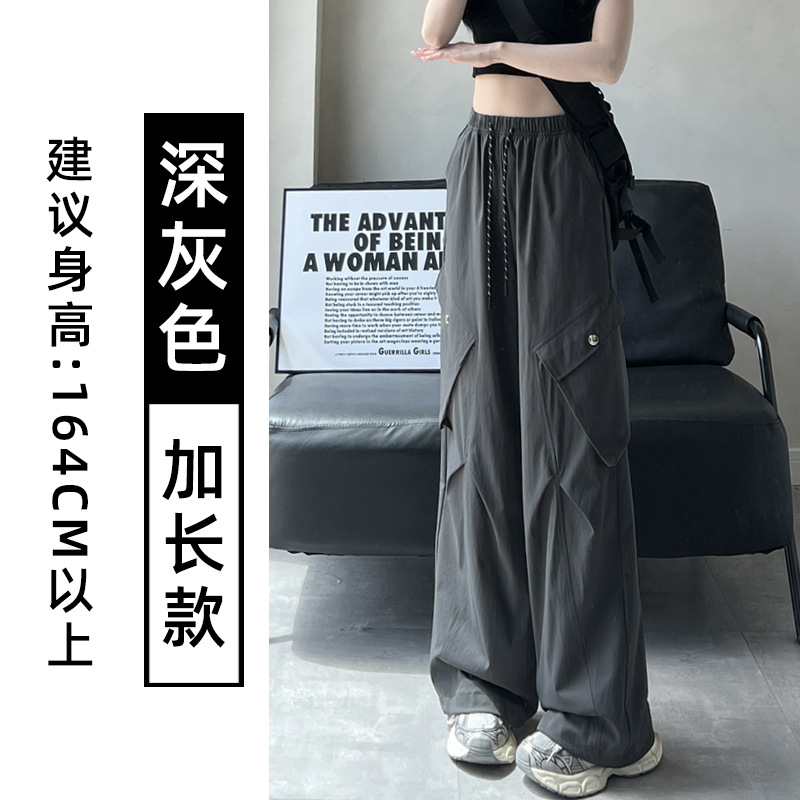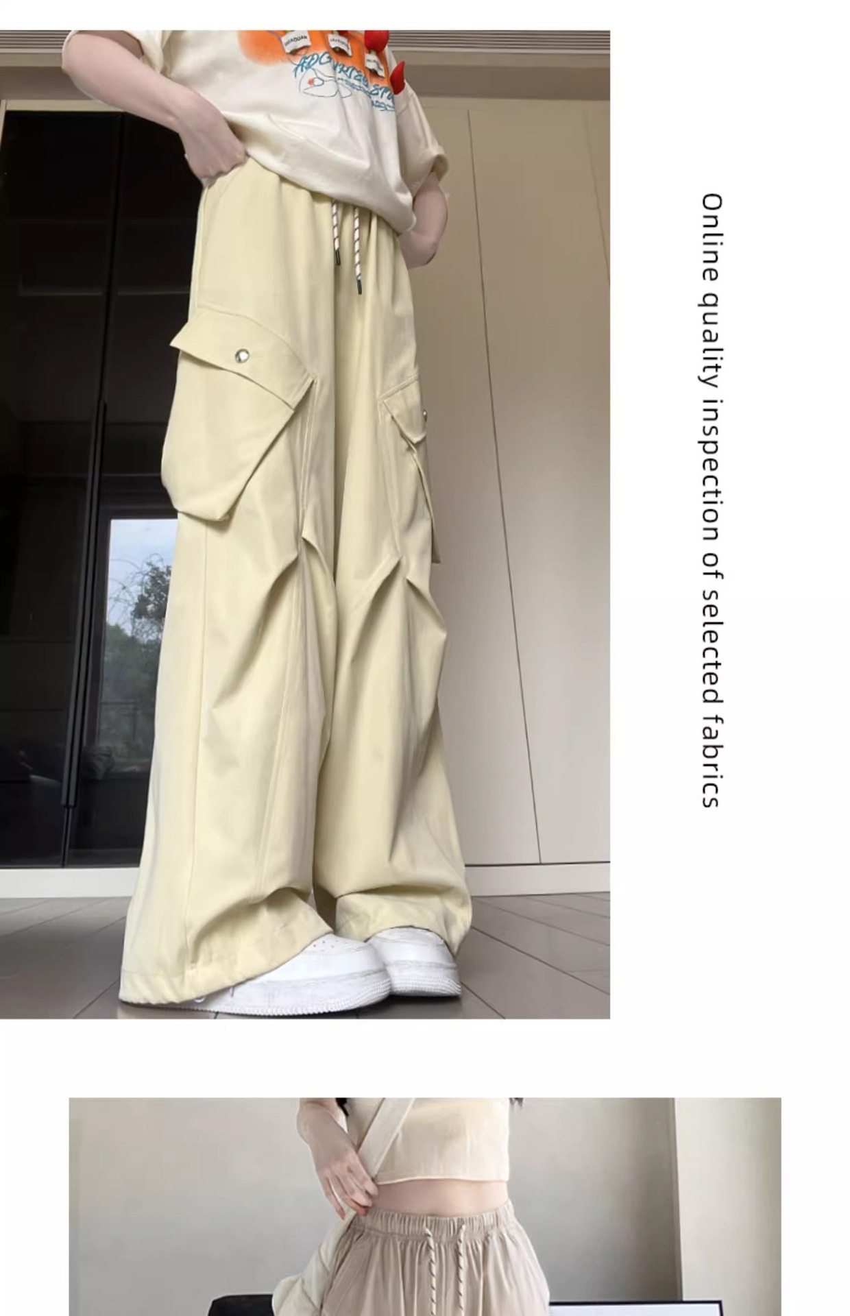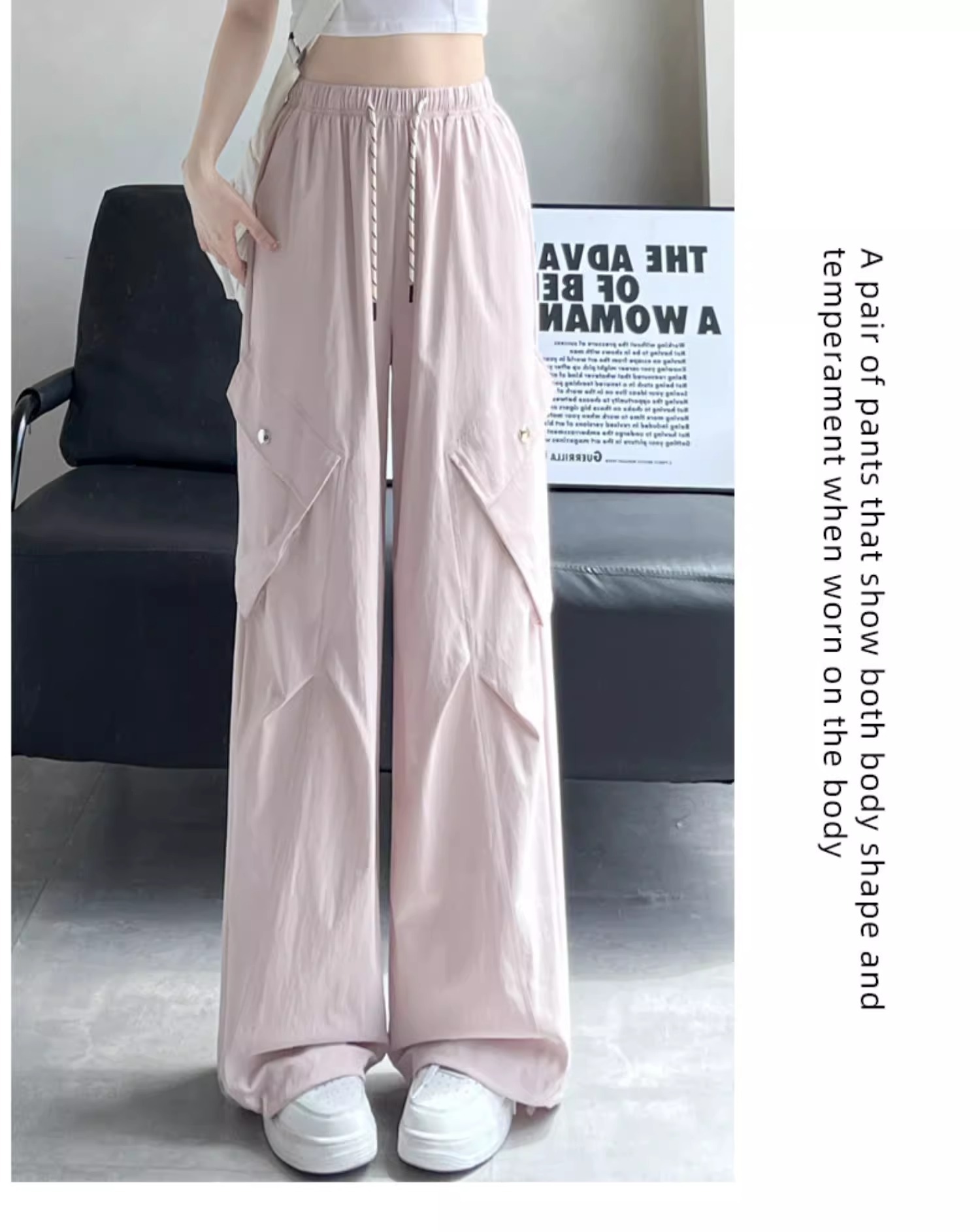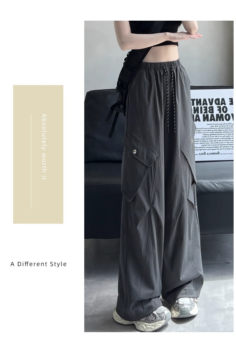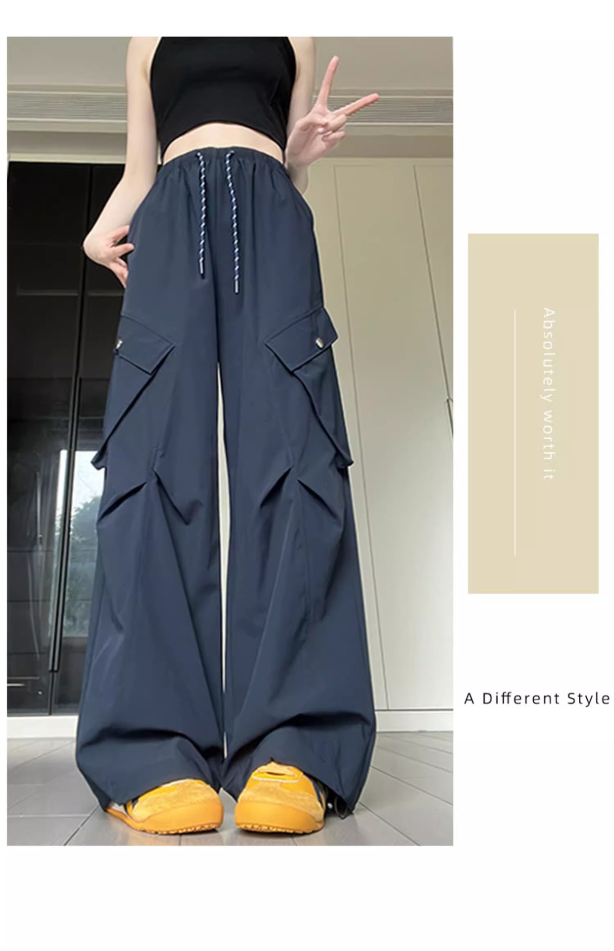 미국 스타일의 대형 포켓 크레인 바지 여성 여름 2025 새로운 높은 허리 슬리밍 휴식 빠른 건조 스포츠 와이드 다리 바지