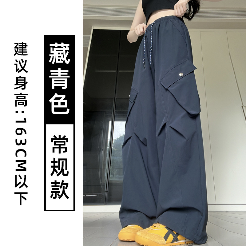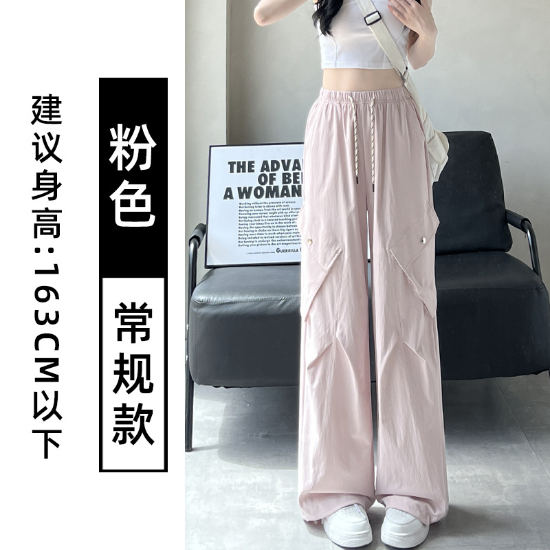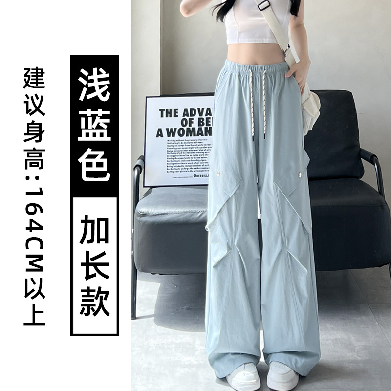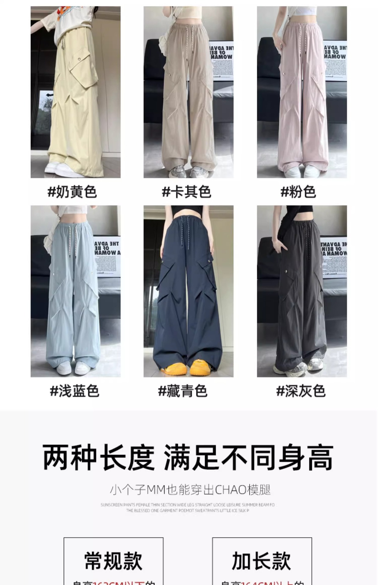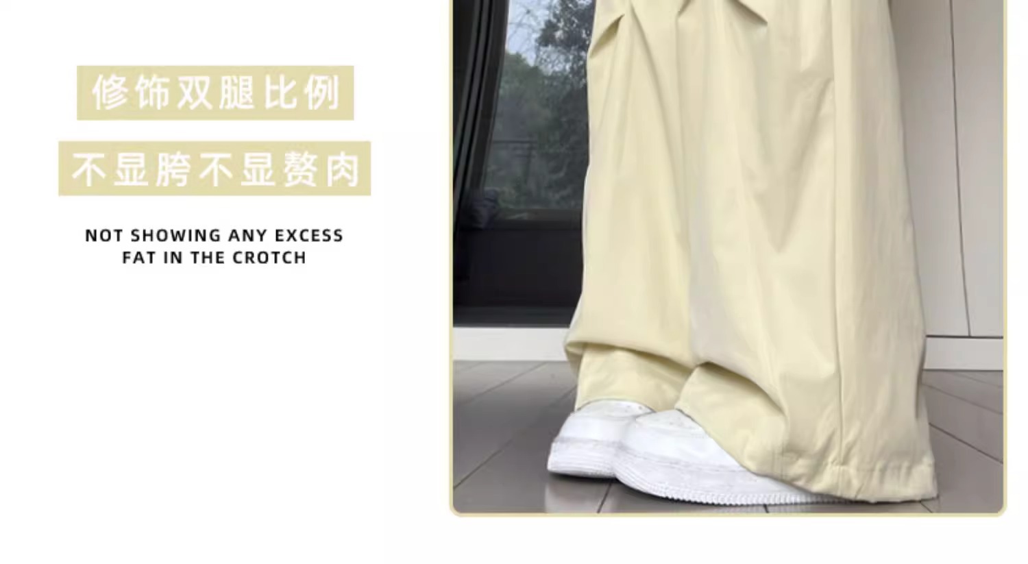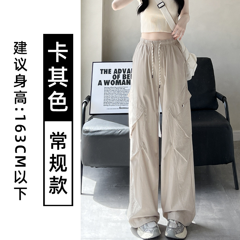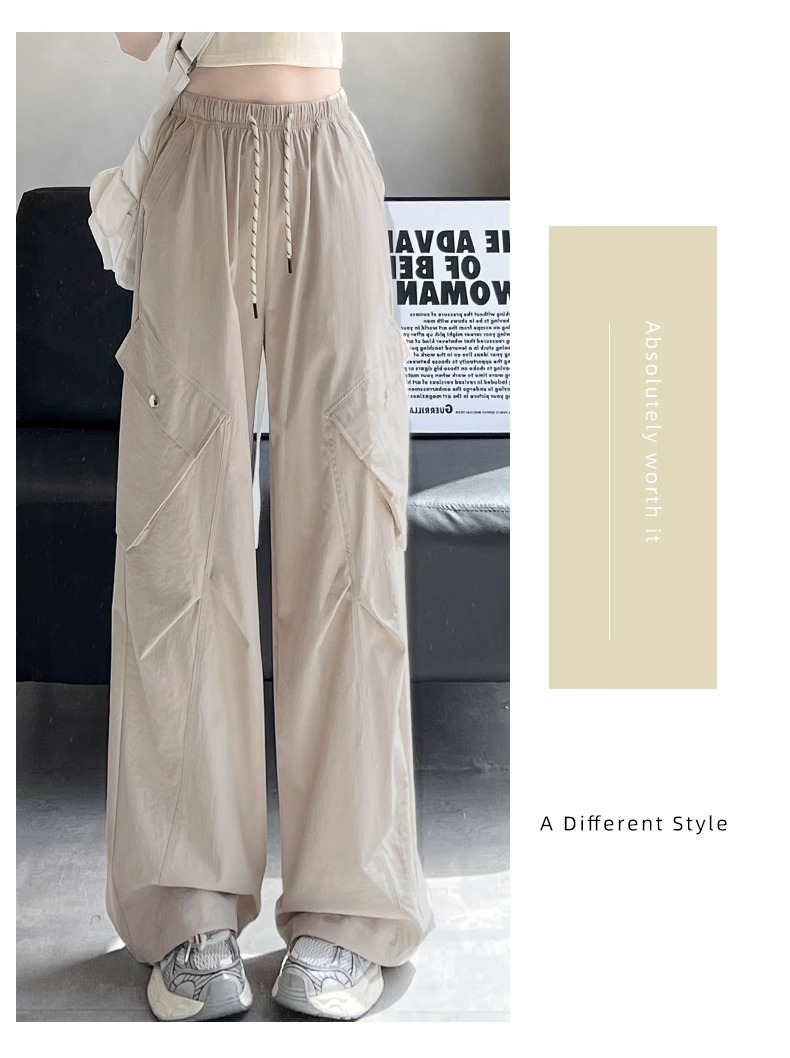 미국 스타일의 대형 포켓 크레인 바지 여성 여름 2025 새로운 높은 허리 슬리밍 휴식 빠른 건조 스포츠 와이드 다리 바지