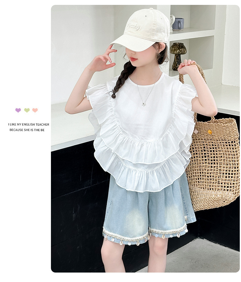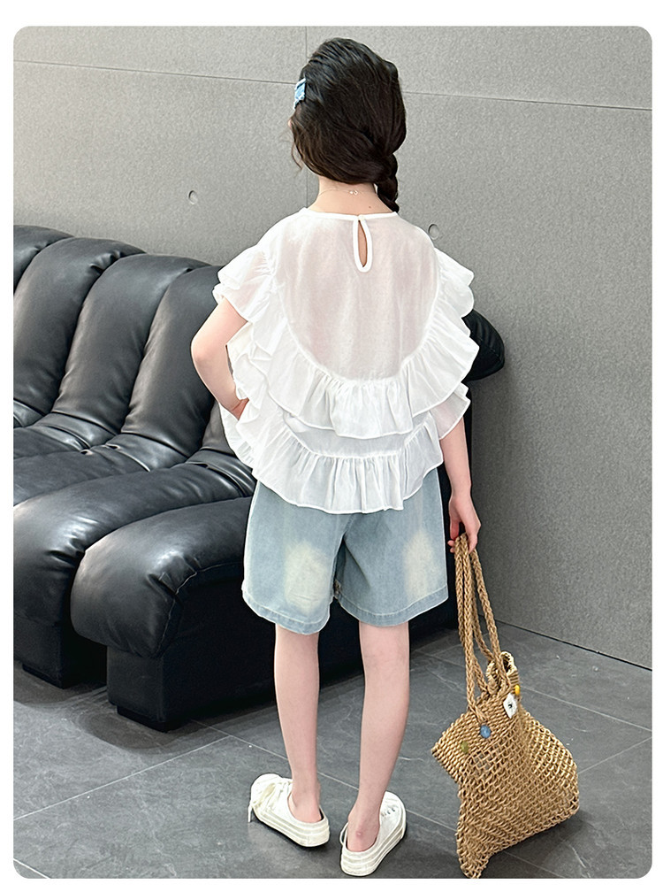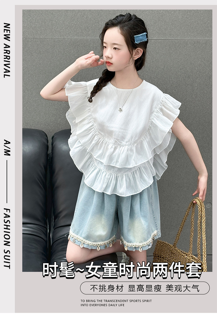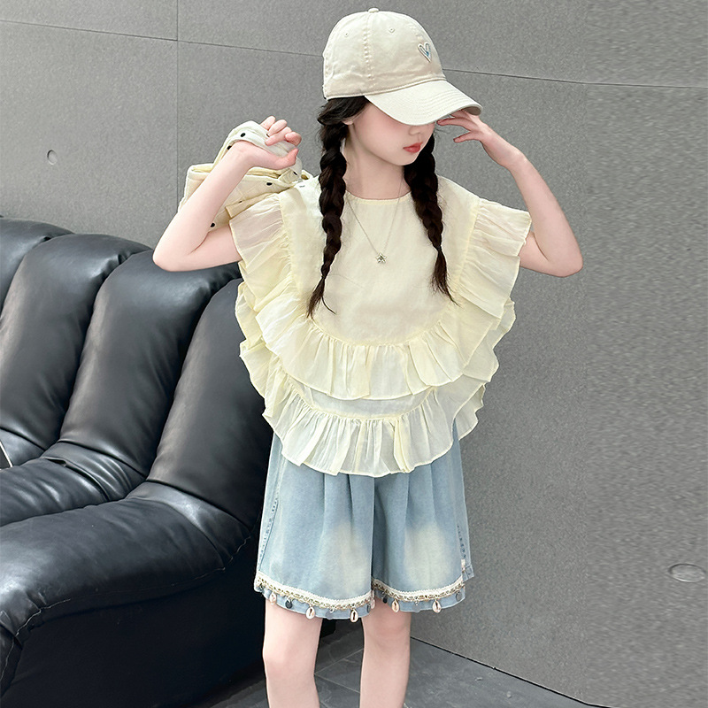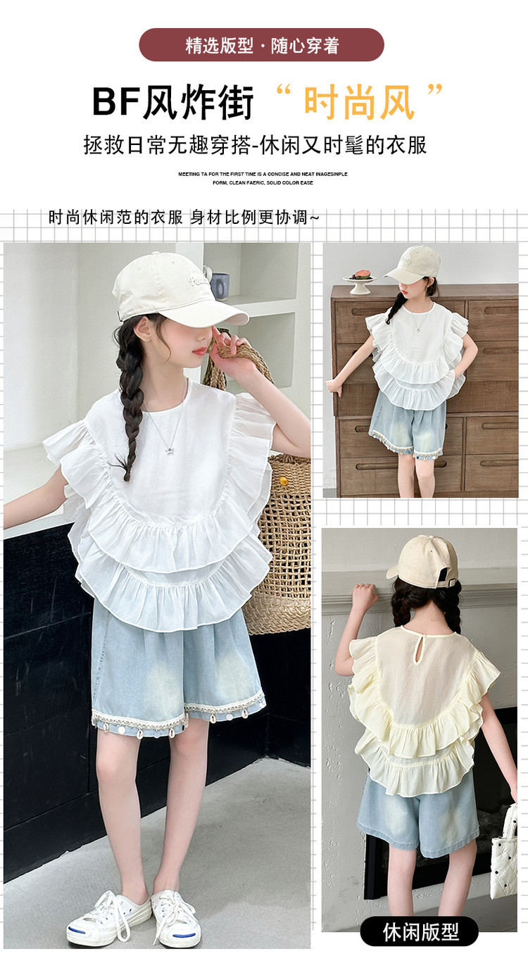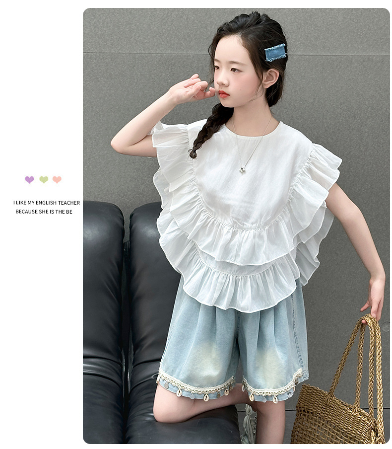 소녀 레이스 인형 셔츠 반바지 짧은 소매 세트 2025 여름 비행 소매 셔츠 데님 넓은 다리 핫 바지