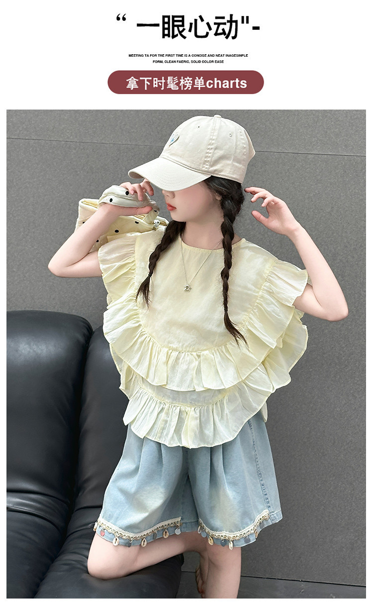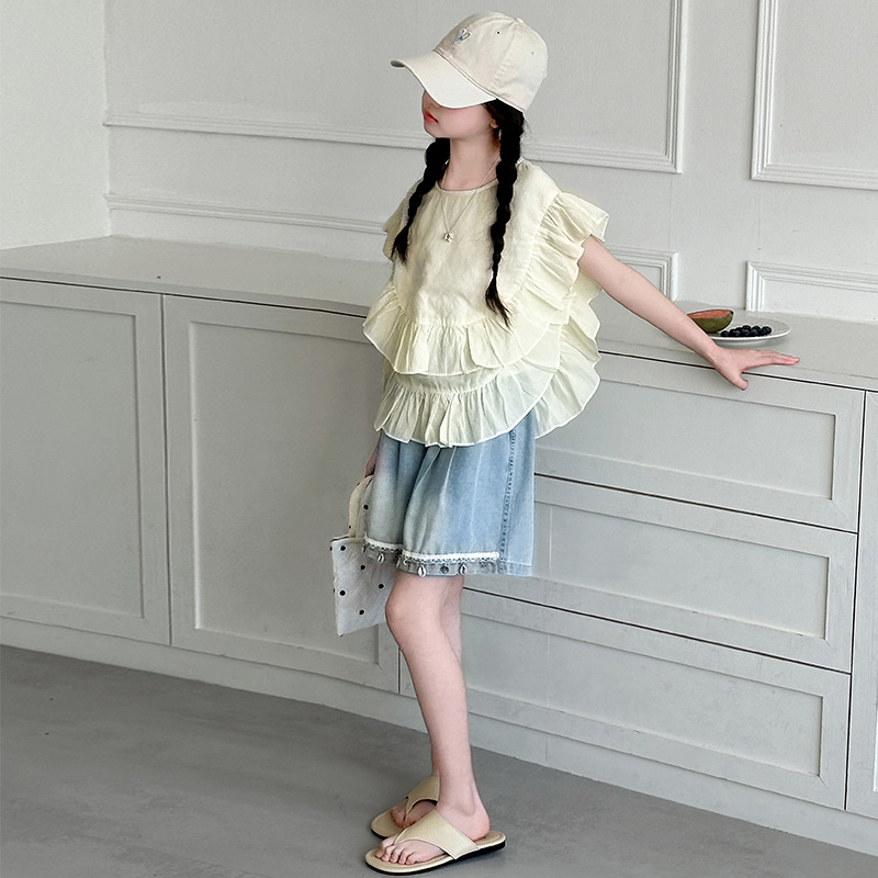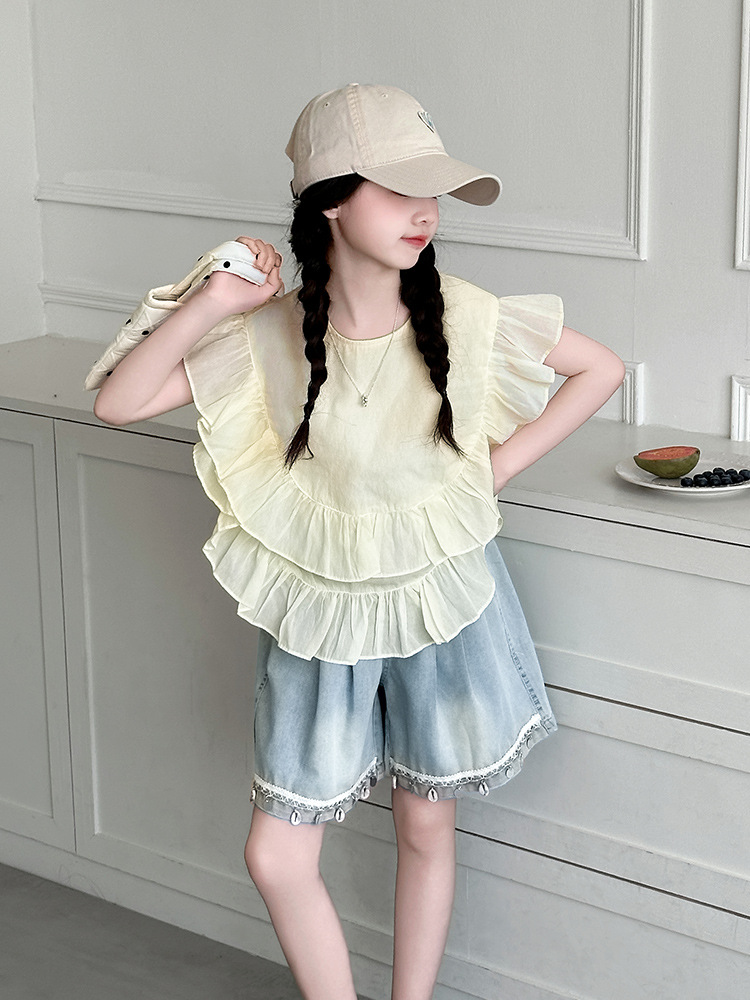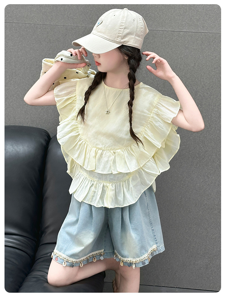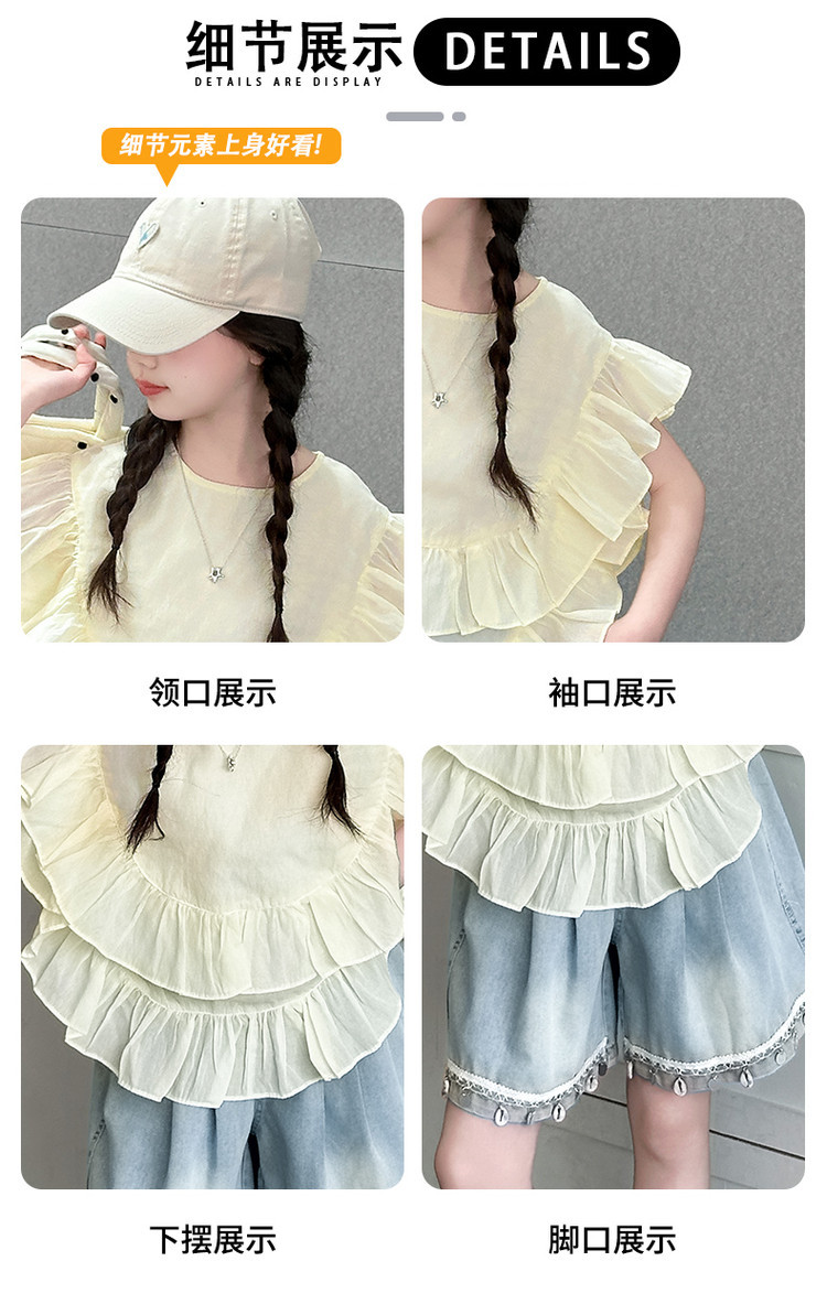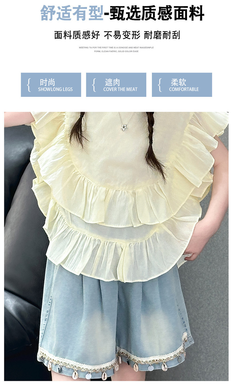 소녀 레이스 인형 셔츠 반바지 짧은 소매 세트 2025 여름 비행 소매 셔츠 데님 넓은 다리 핫 바지