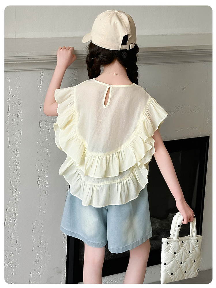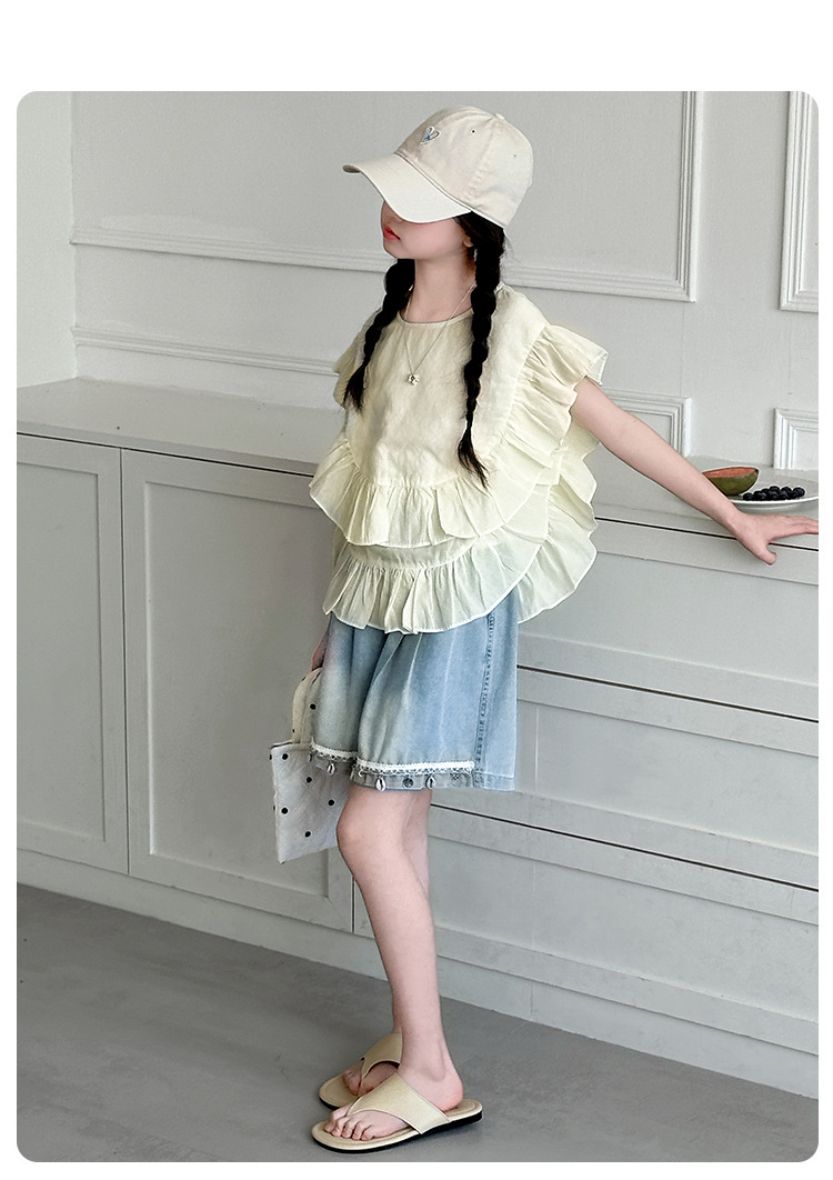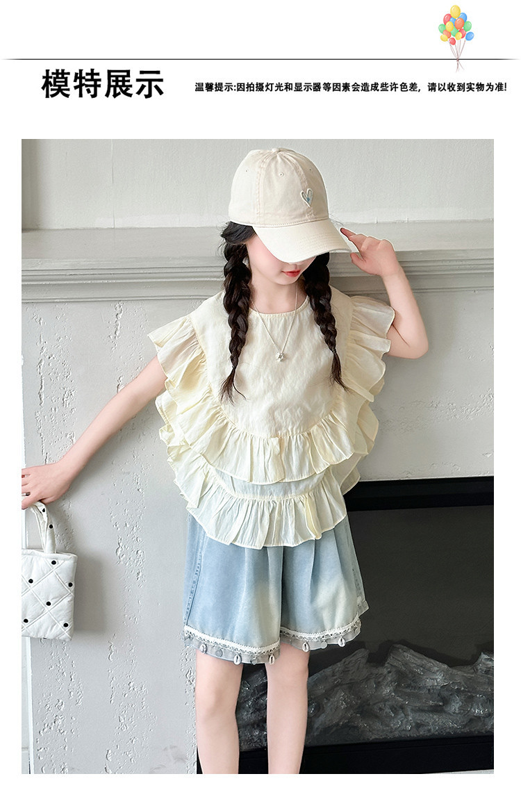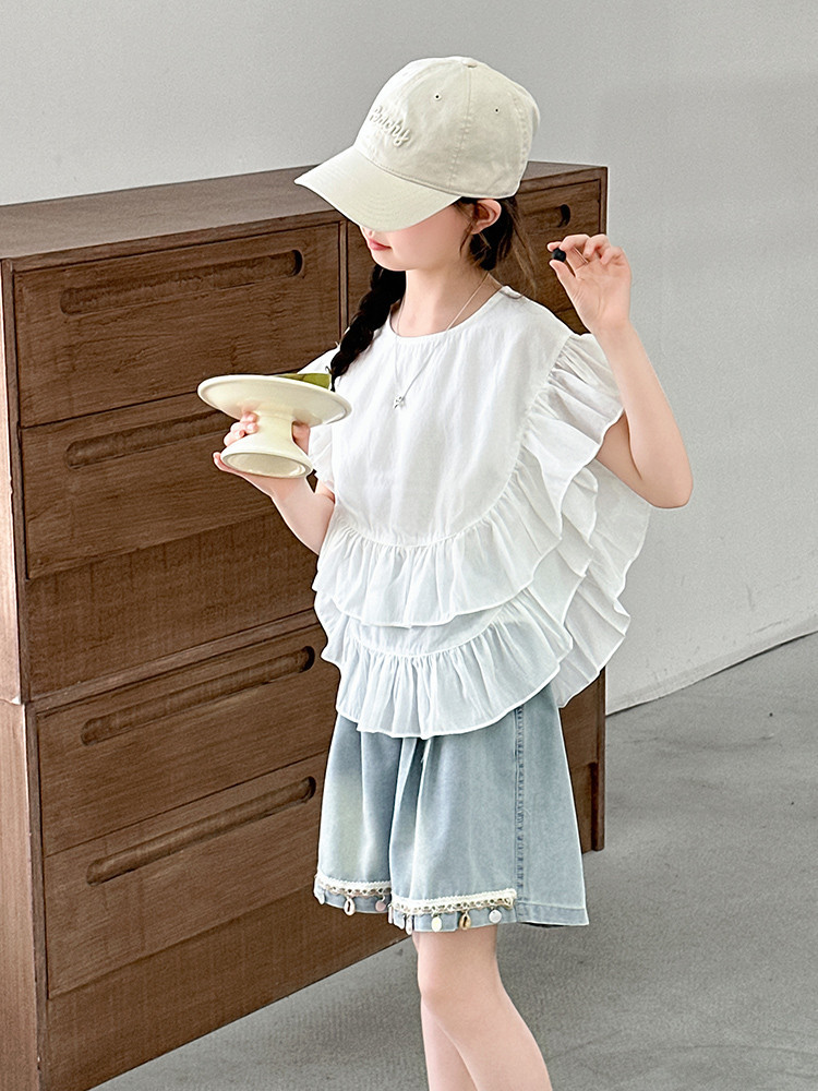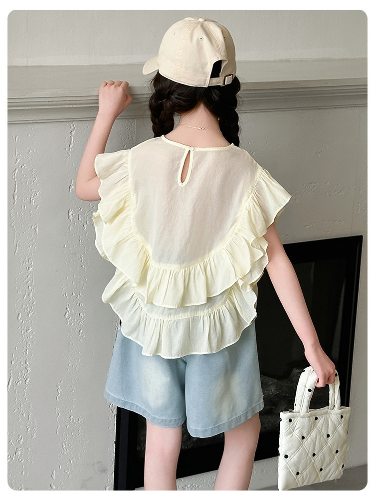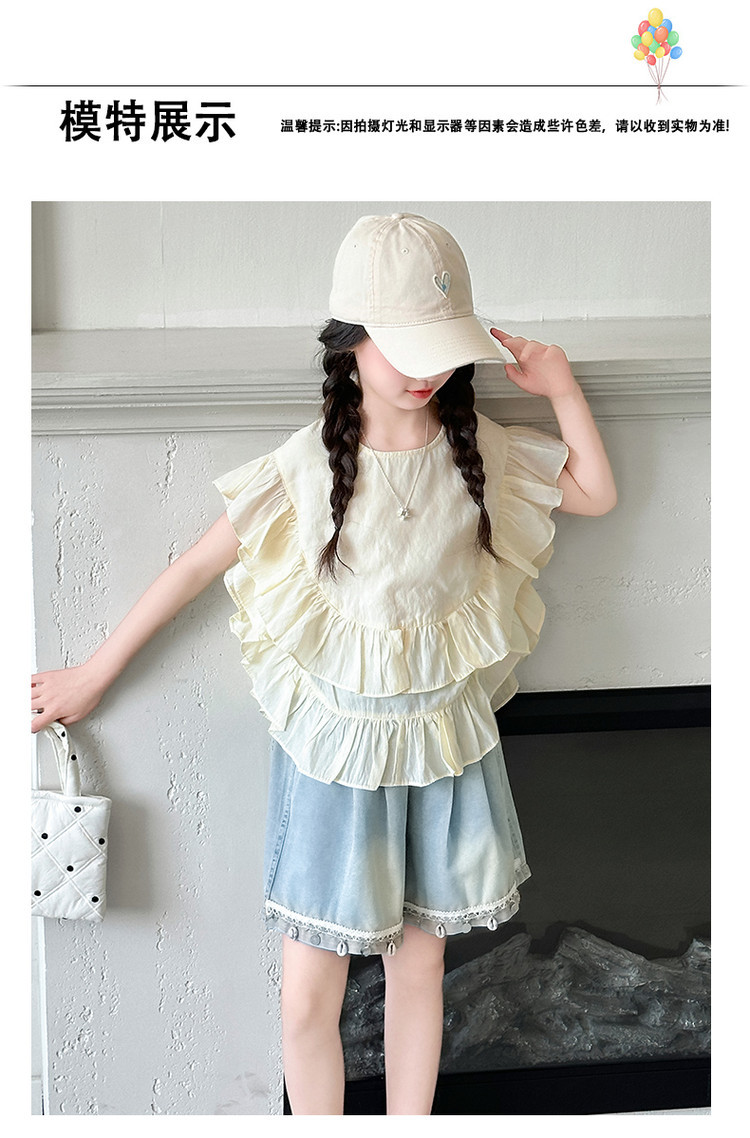 소녀 레이스 인형 셔츠 반바지 짧은 소매 세트 2025 여름 비행 소매 셔츠 데님 넓은 다리 핫 바지
