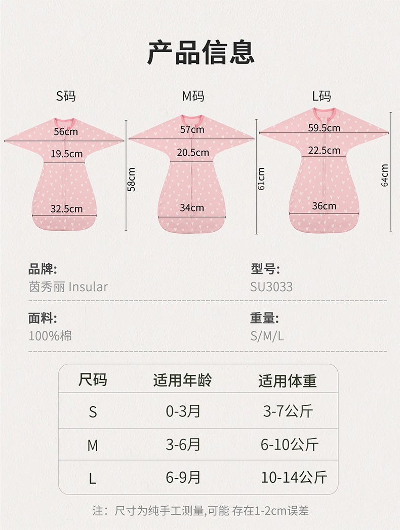 规格:S/58CM(适合0-3个月) M/61CM(适合3-6个月) L/64CM(适合6-9月)