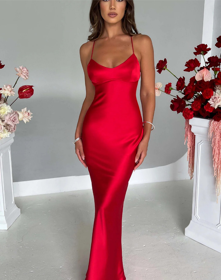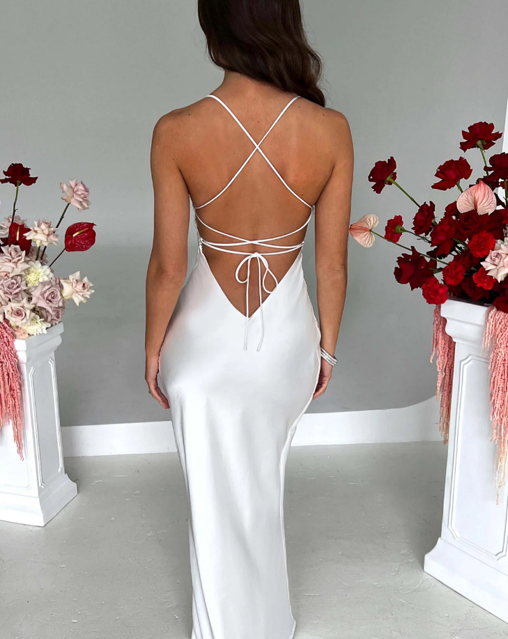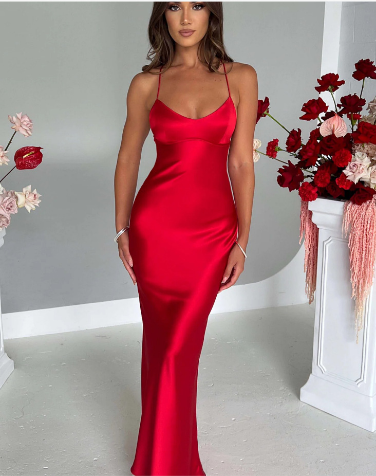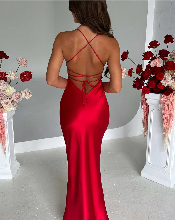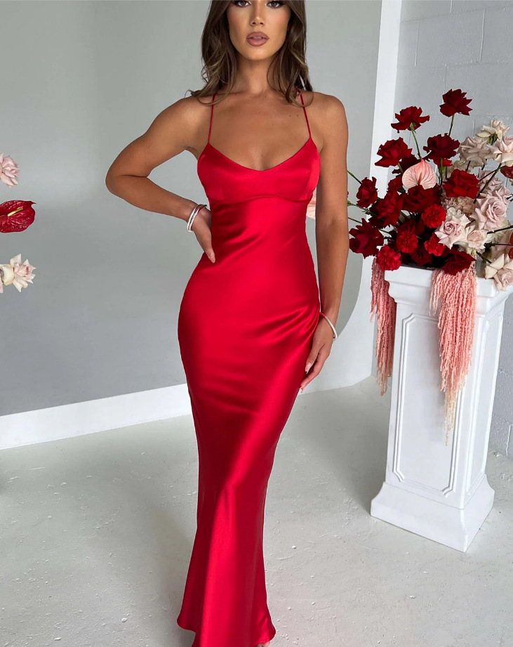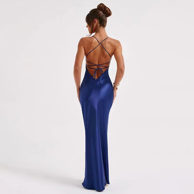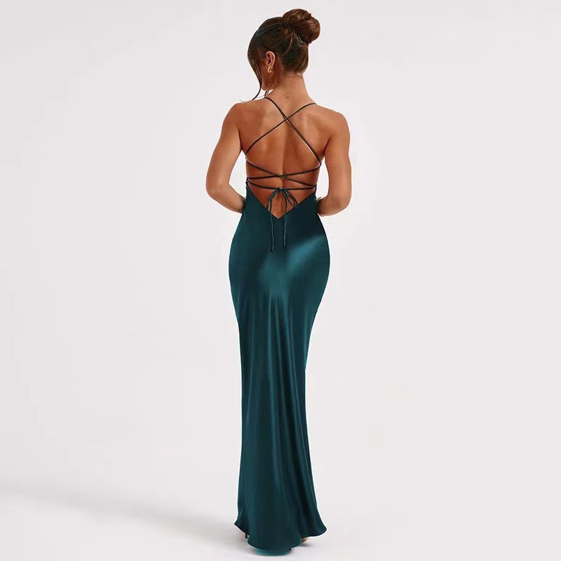새로운 아마존 국경 여성 섹시한 슬링 새틴 패션 백리스 스트랩 타이트 허리 저녁 원피스 원피스